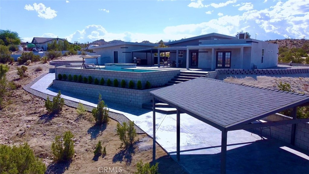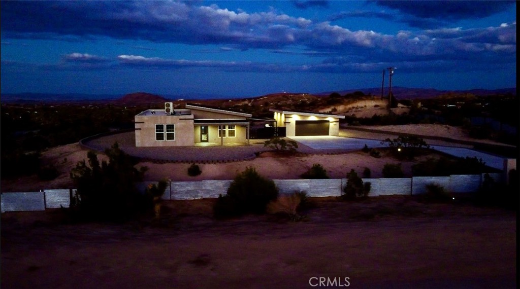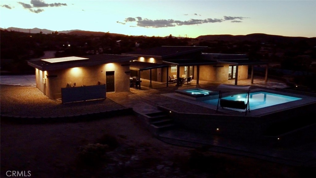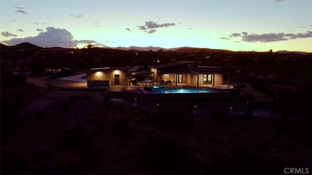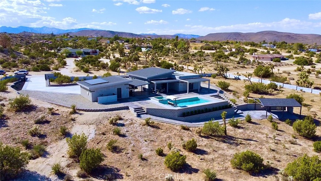 Crowning a 2.38-acre promontory in the serene heart of Yucca Valley, this 2022-crafted, single-story masterpiece is a symphony of elegance and innovation. Designed for visionaries with a taste for the extraordinary, this 3-bedroom, 2-bathroom sanctuary, unveils breathtaking vistas and an enclave of unparalleled privacy. Soaring 10-13 ft ceilings and expansive triple-pane argon windows bathe the interiors in desert light, with lustrous wood laminate floors weaving a thread of timeless chic. A 3500 kW solar system banishes electric bills, harmonized by 6-inch insulated walls and intelligent LED lighting that dances at your command. Graceful 4-ft hallways invite effortless movement, catering to every lifestyle. The gourmet kitchen, a culinary atelier, dazzles with Frigidaire stainless steel appliances, gleaming granite countertops, and a sculptural island bar, seamlessly merging with luminous living spaces for enchanted gatherings. Three palatial bedrooms, adorned with bespoke closet systems, offer serene retreats, while two bathrooms, with granite vanities, a decadent walk-in shower, a sumptuous soaking tub, and artisanal tilework, elevate daily rituals to spa-like indulgence. The private backyard is a dreamscape, where stepping stones lead to a crystalline pool, a rejuvenating spa, and an outdoor shower, framed by a courtyard with a gourmet barbecue and granite-clad prep table. Five covered patios beckon for starlit soirées or tranquil repose, while curated grounds, studded with iconic Joshua trees and lava rock accents, exude effortless splendor. A 48,000 BTU AC unit and Wi-Fi-enabled mini-split systems orchestrate perfect climate control, complemented by a cutting-edge security system. An in-home laundry suite and a 24x22 ft garage, with a Wi-Fi door, polished drywall, and climate control, marry function with finesse. Poised near Highway 247, yet a world away from urban clamor, this estate offers seamless access to Yucca Valley’s vibrant amenities. This is not merely a home—it’s a legacy of glamour, awaiting its next connoisseur. Embark on a virtual journey here and contact us to claim this celestial retreat.