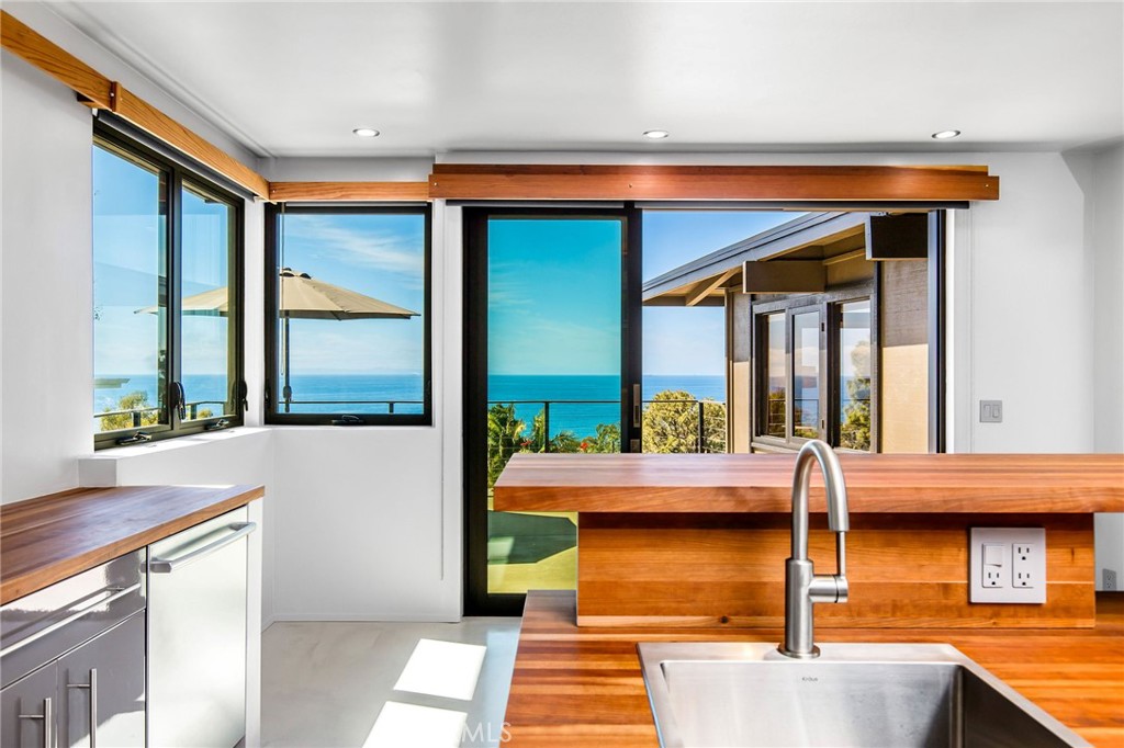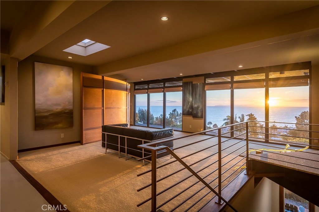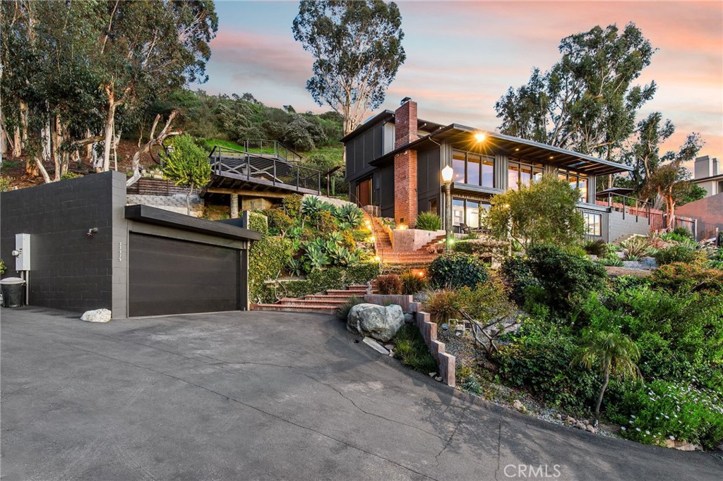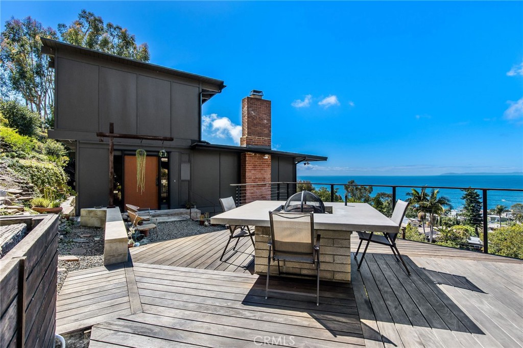 Welcome to your coastal oasis perched atop the apex of 3rd Avenue in the heart of the South Laguna Village. This midcentury masterpiece seamlessly blends custom design and exotic woods with panoramic ocean views from nearly every room on all three levels. A rarely sold retreat in one of Southern California’s most coveted locales. This property is a testament to meticulous maintenance and pride of ownership. Often referred to as a park or “mini ranch,” the expansive lot offers endless opportunities to continue building and adding on. Lush greenery, an outdoor fireplace and three large ocean view decks invite you to indulge in captivating ocean sunsets, both Catalina and San Clemente Islands, sailboats, and occasional whale and porpoise discovery! On the clearest days, you will experience views up the coast to Long Beach and Palos Verdes. As you step through the custom-made door and enter on the middle level, you will immediately be captivated by the endless ocean vistas that welcome you. This level boasts a thoughtfully arranged bedroom, a stylish bathroom, and a kitchen that opens seamlessly to a large ocean-facing deck—ideal for alfresco dining or simply soaking in the coastal ambiance. The living room, complete with a fireplace and a charming dining nook, make this level a perfect space for both relaxation and entertaining. Ascend upstairs to discover the ultimate in luxury living—the primary suite. With privacy, breathtaking ocean views and custom wood features, this retreat is a haven of tranquility. Venture downstairs to find an inviting office space, an additional bathroom, and a bedroom that opens up to an ocean-facing seating area, creating a flexible and dynamic living environment.