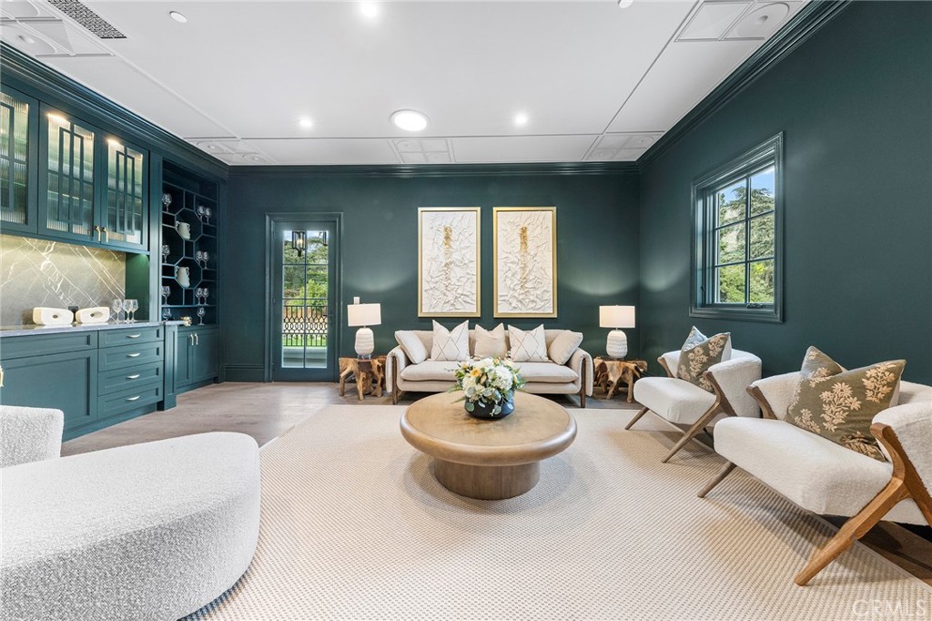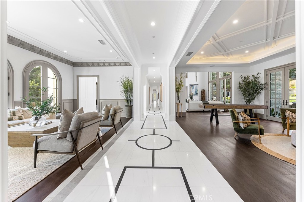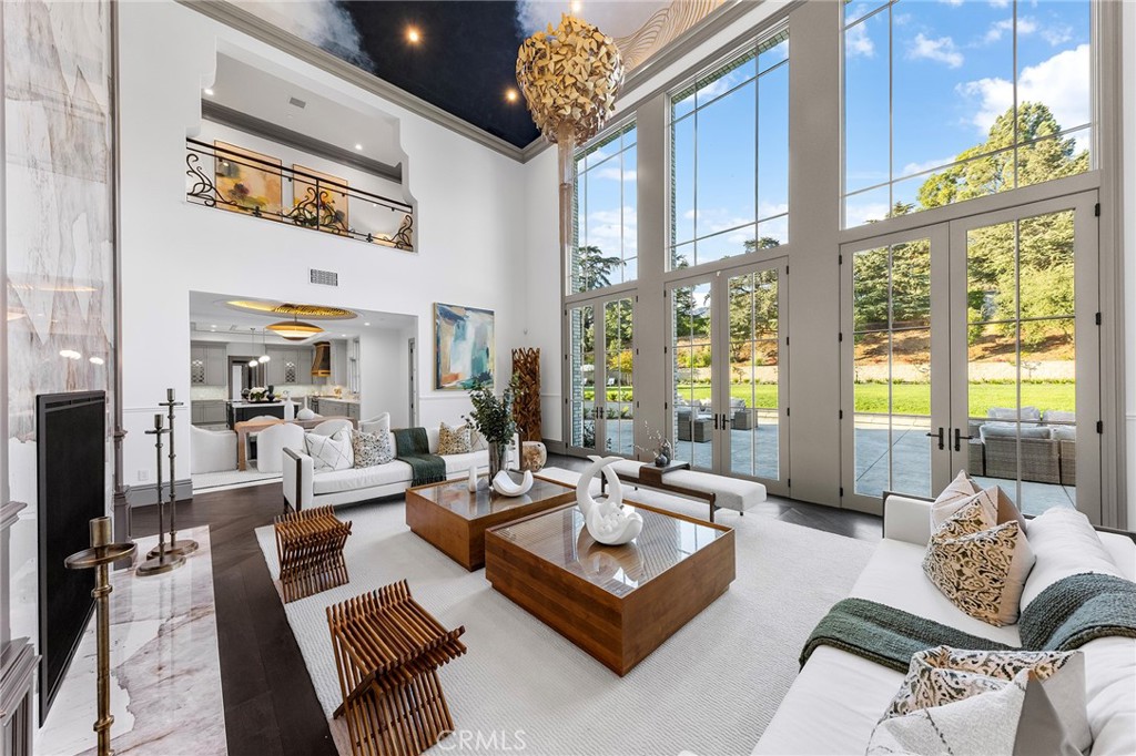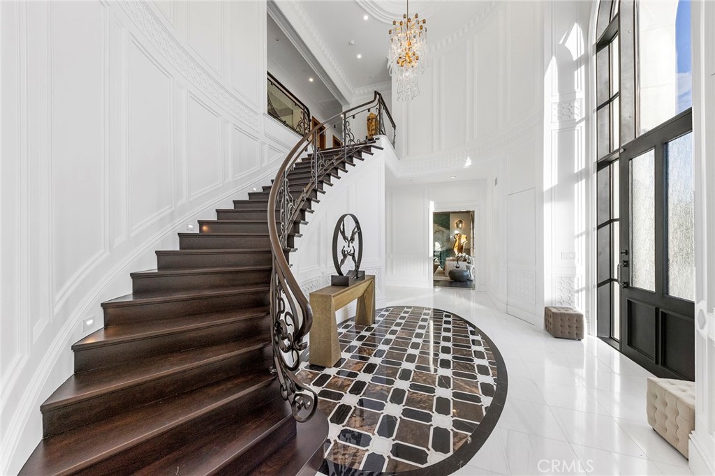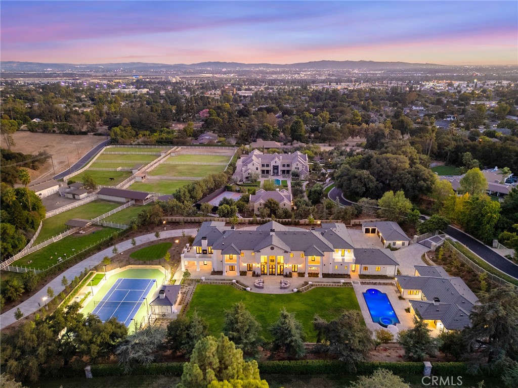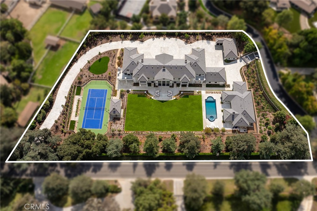Nestled in the exclusive, 24/7 guard-gated enclave of Bradbury Estates, this estate offers an unparalleled gateway to a life of exceptional luxury and distinction, perfect for those seeking an escape from the ordinary. Set on an expansive 116,164 SF square lot, this mansion offers a expansive, level landscape with sweeping views from every angle. The 14,780 SF main building features a rectangular symmetry that allows for excellent natural light and integrated flow. With common areas in the center and bedrooms on both sides, the layout provides both functional convenience and enhanced privacy for its residents. The house dazzles with a bold Hollywood Regency style, blending sleek, sophisticated designs with striking contrasts. Gleaming gold accents, bold decorative touches, and chic organic modern influences form the heart of the home's show-stopping aesthetic. In the connected space encompassing the foyer, living room, formal dining room, family room, powder room, kitchen, and entertainment room, the cohesive design seamlessly ties these areas together in perfect harmony. The thoughtful selection and installation of stone and wood, combined with a clean, high-contrast color palette, creates a striking sense of design. The extensive use of wood elements infuses warmth, elevating the inviting atmosphere of the entire space. The mansion’s park-like grounds feature a resort-style pool, complemented by a sleek, modern 2,450 SF pool house. The stylishly designed space includes an open kitchen, living room, 2 en-suite bedrooms, a powder room, a poolside bathroom, massage room, sauna, steam room, dipping room, and a cabana with a fireplace. It also is adorned with a professionally lit tennis court. This extraordinary property stands as a timeless gem, poised to become a cherished family heirloom.