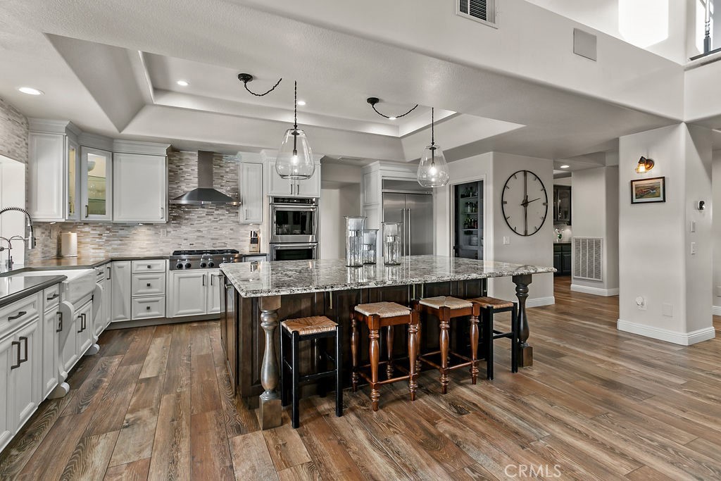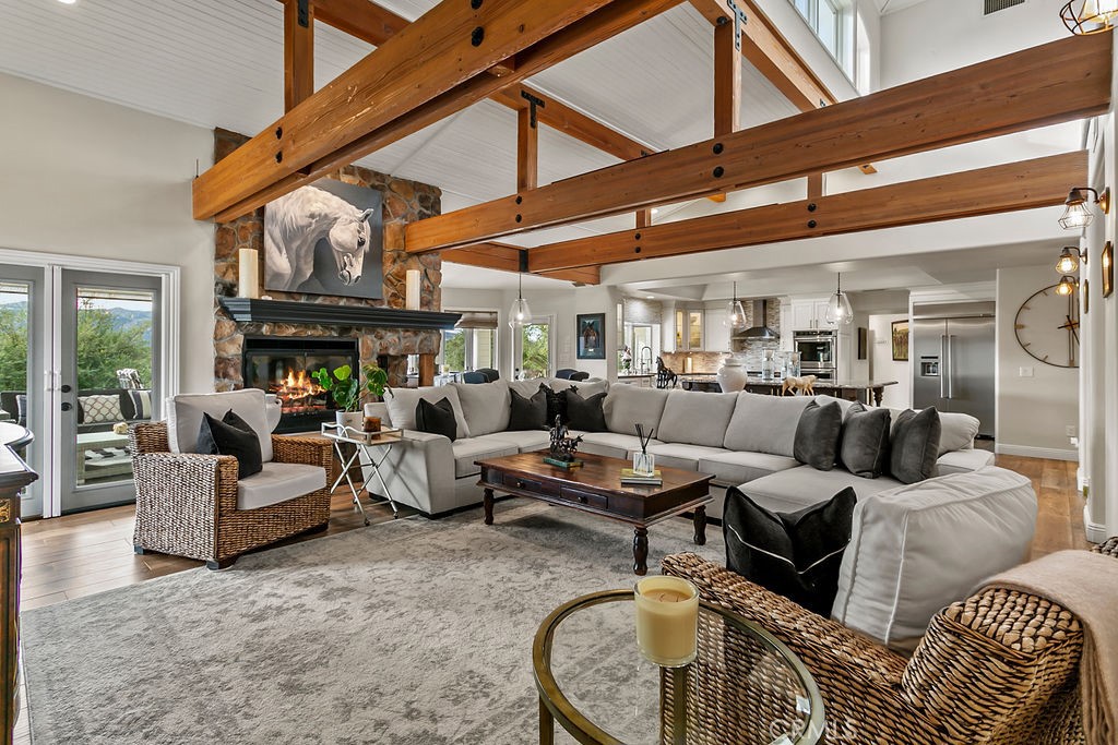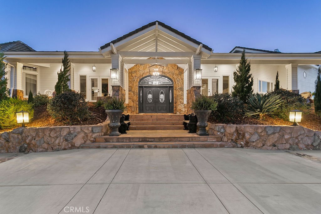 Stunning one of a kind equestrians dream “ view” estate. just over an hour to Orange County and North San Diego. Enter through impressive gated entry up long private driveway. The estate is set up for the professional trainer or personal equine client . Two arenas, one GGT footing, the 2nd arena sand. Round pen, 8 turn outs, 6 with natural oak tree shade, waterers, some grass, white vinyl fencing. Centre Aisle 6 stall barn,auto waterers, fly system, cameras, rubber matting, lookouts, additional 3 stalls, grooming/bathing area. Tack shed and more. The estate has its own shaded riding trail and also access to many miles of riding trails within the area. Small Cabernet Sauvignon vineyard, corn hole and Bocci Ball court ,adjoining gazebo viewing area. Multiple sitting, viewing areas. Expansive Chicken “house”, Italian garden, Zen/prayer area. Many established oaks drape the property with shade and beauty. Three apartment/studios in the barn, parking for multiple vehicles, two automatic security gates.Shade trees, fruit trees and several entryways. Basically Single Story sprawling residence is recently updated with amazing gourmet kitchen with huge center island,2 dishwashers. gas stove, double ovens built in refrigerator and large pantry, opens to grand great room with seoaring ceilings, hand crafted beams, and crackling fireplace, French doors, views from every window. Primary bedroom, 2 walk in closets, fireplace, soaring ceilings and sitting area. Primary bath is stunning , 2 auto toilets, fireplace, romantic tub, grand shower area. Formal dining area has a wall of cabinets and storage with French doors to large patios, formal living area could be a game room or huge office with a wall of bookcases and storage, a bar area and more. Unique Théâtre room has professional seating for 7/8 people. Spacious Secondary bedrooms One with en suite bath and access to the idyllic Koi pond and fountain area. Just one upper viewing room/office/library. Stunning entertainment area with expansive deck, fire pit, fire lights, sparkling spa, infinity pool has waterfall, swim up bar. State of the art outdoor kitchen with t.v. large counters, sit up bars, heater and stainless appliances., BBQ, refrigeration drawers, hot plates/storage area. Outdoor shower, Well ,Koi pond, second fire pit. Spacious three car garage, epoxy,flooring, huge attached storage room, large motor court, drive through road to barn. Several access roads, gates throughout property.