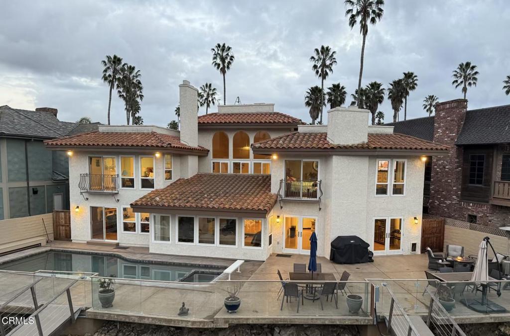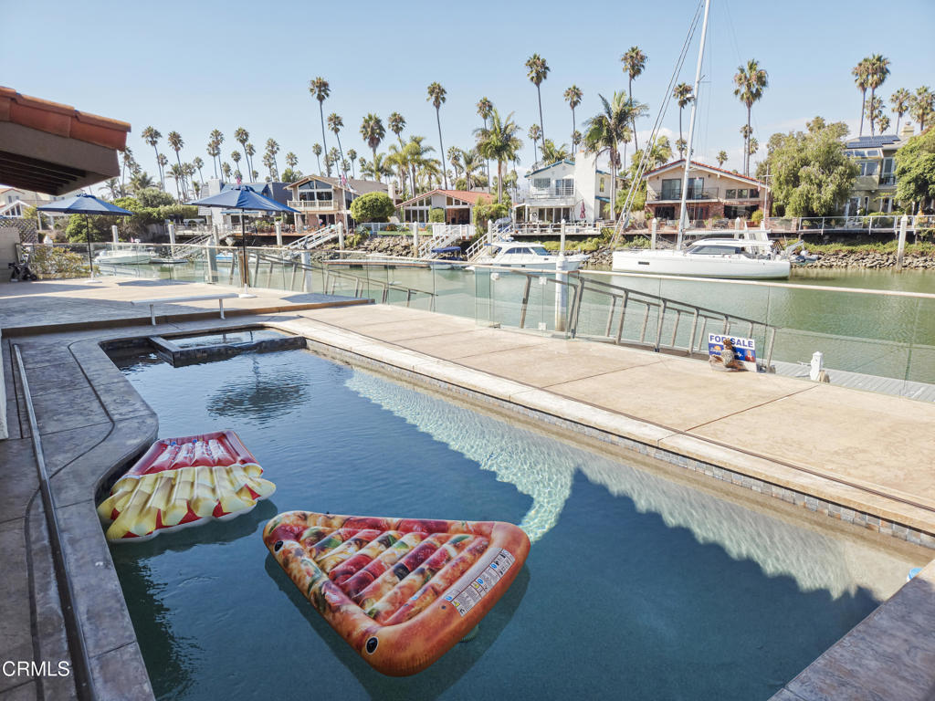 Ventura Keys Waterfront Home with newer 90 ft boat dock. Newer electric 50 amp power at your dock. 80 (+) ft deck with a swimming pool and hot tub incorporated in the pool. Electric powered cover for the pool. Home was built in 1979 and was nicely remodeled. A beautiful view of the water from most rooms. 1 Bedroom downstairs with fireplace and view of the water, remodeled full bath with walk in shower. French doors from dining room leading to the deck area. Fireplace in large dining room and open to the kitchen with granite countertops and top of the line appliances, with large counter for eating or entertaining. Living room with fireplace and view of the water.Outside area great for BBQ or just sitting enjoying the sunsets. 3 bedrooms and 2 full baths upstairs with jacuzzi tub in the primary, sauna, and a walk in shower with a balcony and view of the water. There are 4 fireplaces , and a 4 CAR GARAGE. Not too many of those in the Ventura Keys. The home and boat dock has a sheltered location with a large turning basin close by. This is the place to be to enjoy Ventura Beach living at its best!!