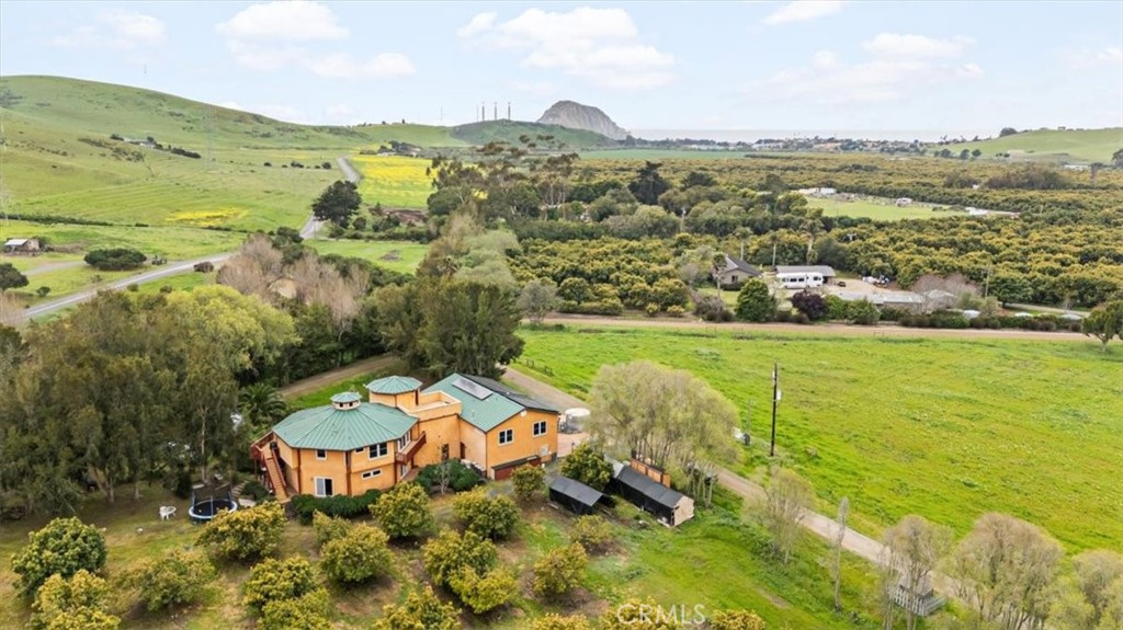 Casa Milagro is a secluded estate in the serene Morro Valley, just outside Morro Bay. This stunning property blends privacy, natural beauty, and functionality, ideal as a family estate, working ranch, agri-tourism business, or vacation rental. Featuring a fully operational avocado grove and Little Morro Creek meandering through the land. Two wells support the property. The custom-built home spans 4,852 sq,ft, offering 6 bedrooms, 5 1/2 bathrooms, a home office, and multiple living spaces. A 4 car garage with an extended workshop provides ample storage. The estate covers 10.87 acres across two parcels, with a fully irrigated orchard of 425 avocado trees, plus cherimoya, apple, peach, lemon, & lime trees. The multi-level home is designed for comfort & practicality. The first level features a mudroom with a steam shower, a full bath, & a laundry room with stained concrete flooring. Just outside, a hot tub and covered patio offer relaxation, while a retention basin could serve as an herb garden or event space. The second level has a family room with a bar, granite countertops, and cork flooring, plus 2 bedrooms, a bathroom, and a home office. The third level is a self-contained 1,600 Sq.Ft. living space with 3 bedrooms, 2 bathrooms, a full kitchen, a fireplace, and a private 300 Sq.Ft. covered deck overlooking the creek. The fourth level serves as the primary residence, including a grand living area with exposed beams, hardwood floors, and a cupola for natural airflow. The fireplace has wrap-around seating and travertine tile. The open-concept kitchen boasts high-end appliances, granite countertops, & under-counter recycle bins. The master suite features a walk-in closet, a jacuzzi tub, and a walk-in shower. A rooftop sun deck is perfect for stargazing and provides easy access to the solar panels. Energy efficiency is key, with a 13.2 kWh solar system, a 20kW Kohler generator, a 5,000-gallon potable water tank, and a Hague water filtration system. The home has an advanced septic system, 2 electric meters, and fire sprinklers throughout. Featuring an elevator, 30 & 36in doorways, grab bars in bathrooms, and lever-style door handles. Security includes a SimpliSafe system. This is a rare opportunity to own a luxurious yet practical estate in a picturesque setting. Whether as a retreat, working farm, or investment, this extraordinary home offers an unparalleled living experience.