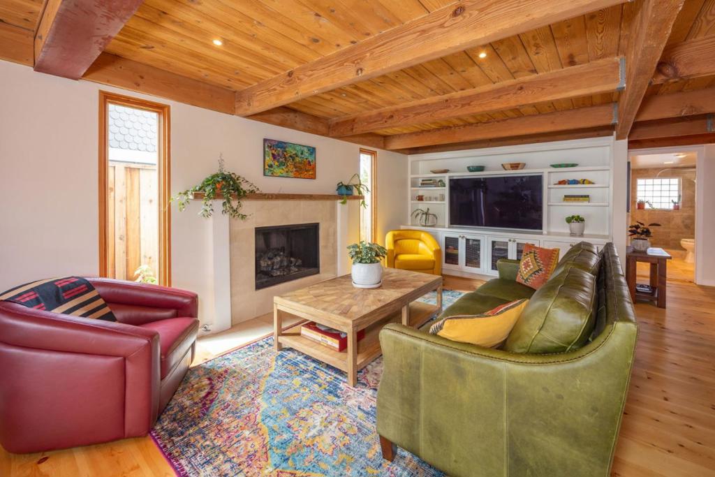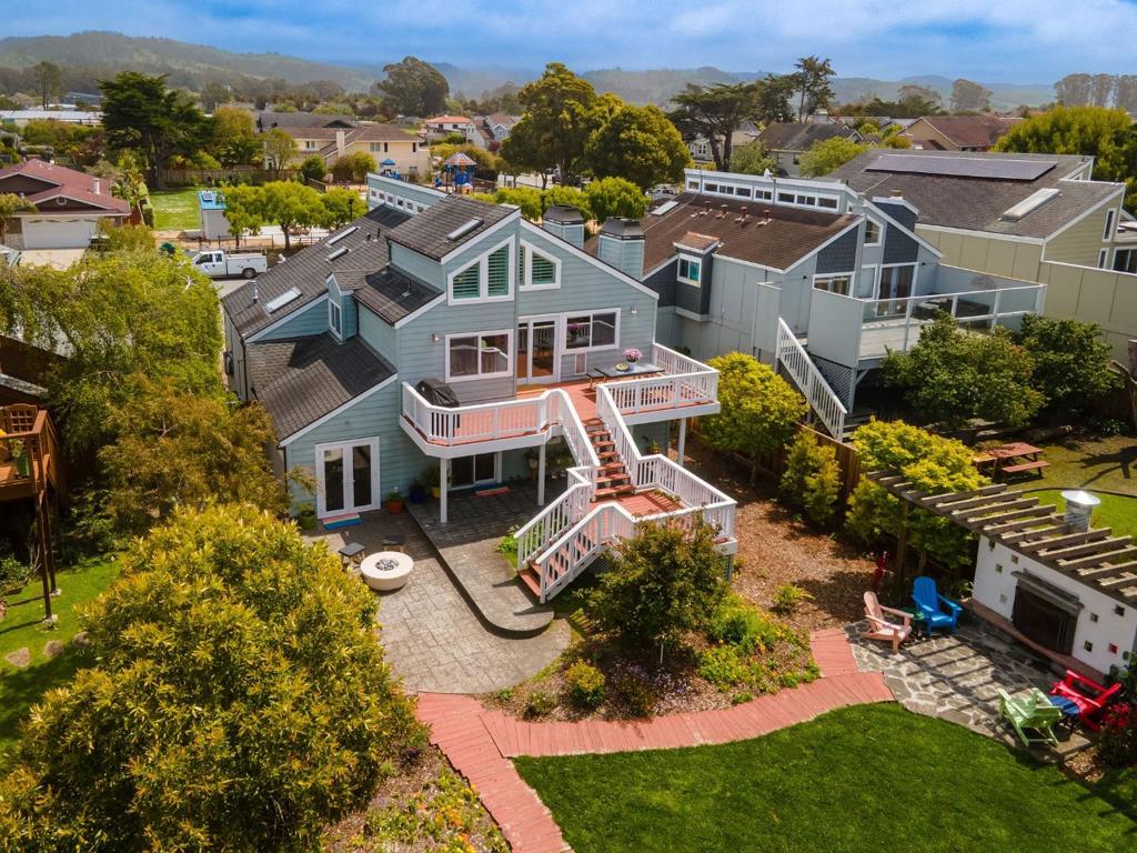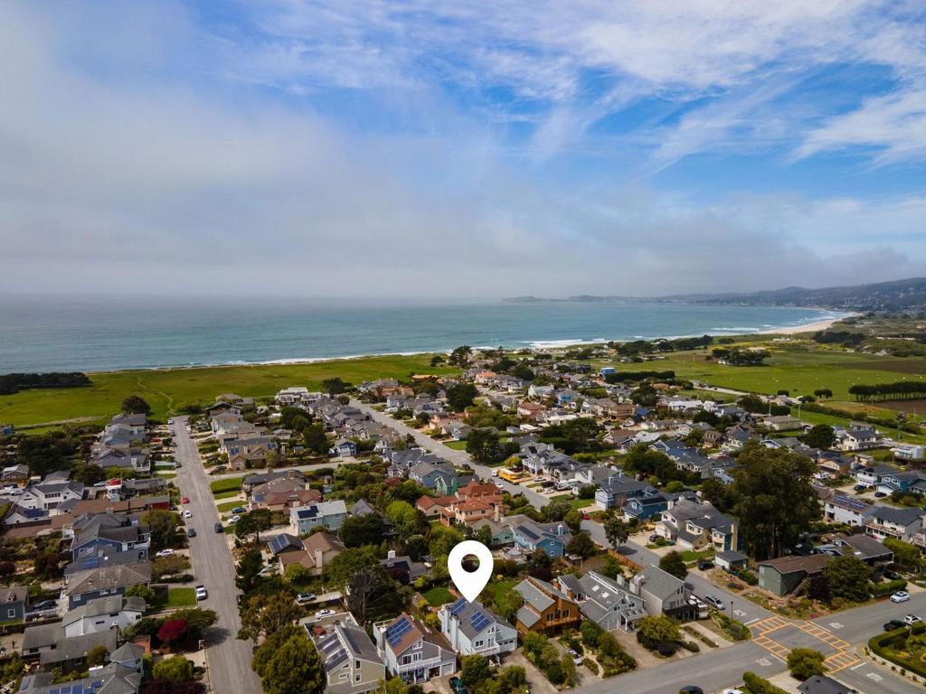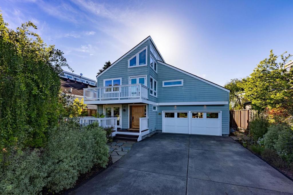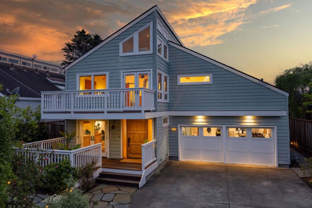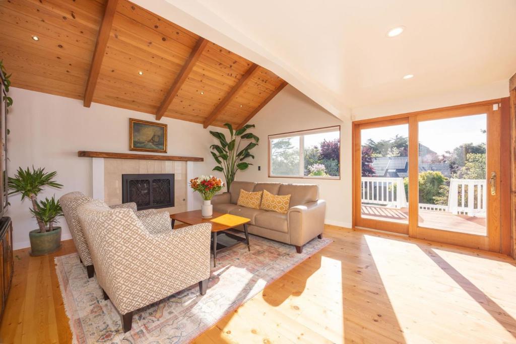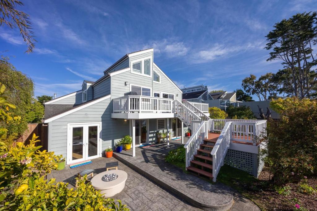 Welcome to coastal living in the sought-after Alsace Lorraine neighborhood. This industrial/boutique-style home greets with lush landscaping, bluestone pavers, and a private front porch. Inside, the spacious great room features exposed pine beam ceilings, built-in bookcases, and welcoming fireplace, perfect for cozy gatherings. Two full-size bedrooms and a full bath complete the first floor. Upstairs, a soaring pine-clad living room with second fireplace flows into the modern chef's kitchen, where high-end appliances, stainless-steel countertops, and custom cabinetry set the stage for effortless entertaining. Choose from banquet seating, bar stools at the peninsula, or dine al fresco on the spacious deck. The primary suite impresses with antique barn doors, a chandelier-lit bath, and extensive custom closets. The 3rd floor loft offers a sunlit gallery and a newly permitted 4th bedroom with an ocean view. Step onto the deck overlooking a private backyard retreat with an outdoor fireplace, greenhouse, and fruit trees, including lemon, pear, apple, and mandarin. An artist studio/workshop sits off the attached two-car garage. Owned solar. Just a short walk to the beach and Main Street, with easy access to Hwy 1 & 92. A rare find in one of Half Moon Bay's most desirable communities!