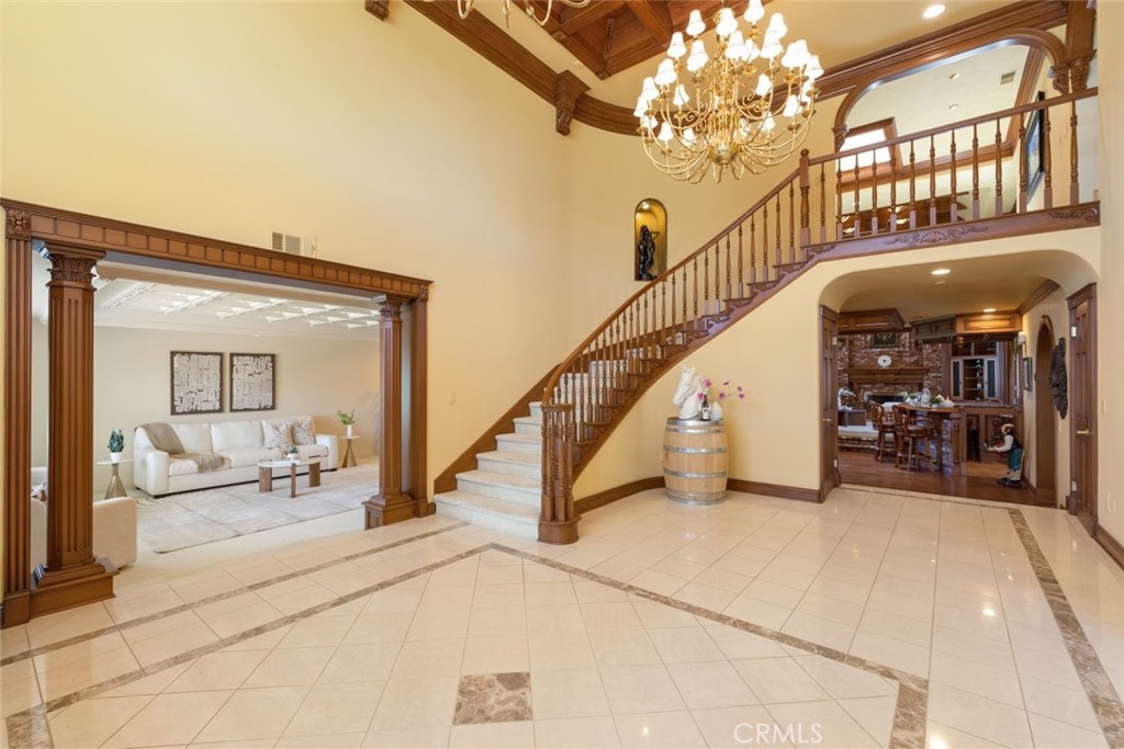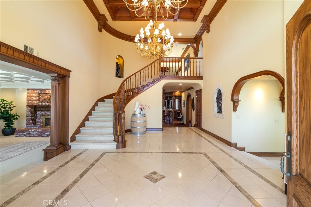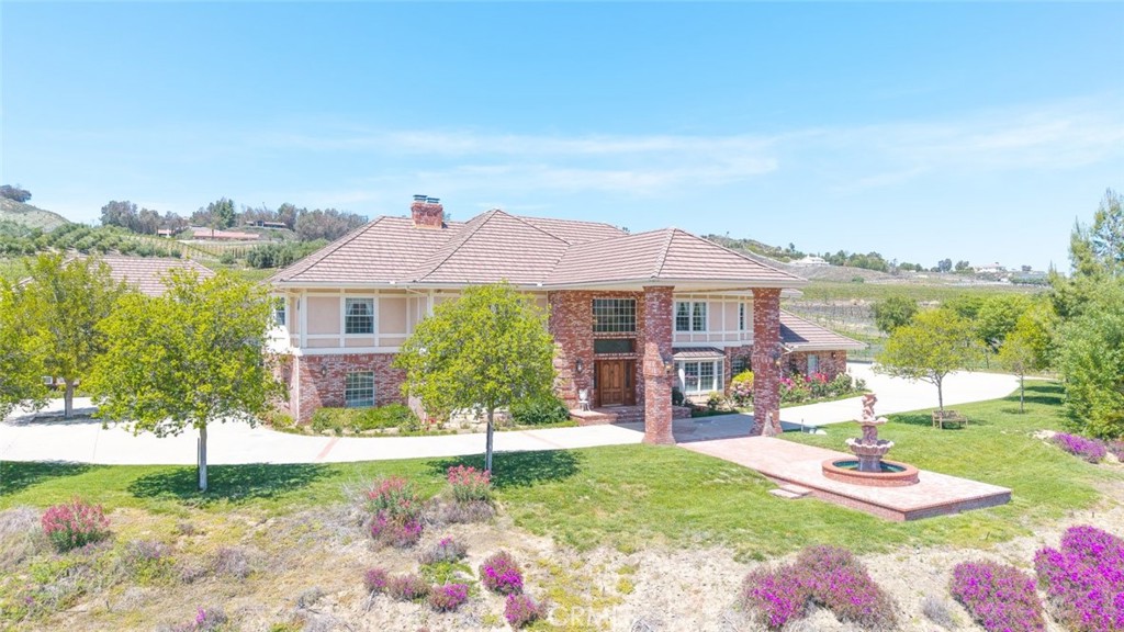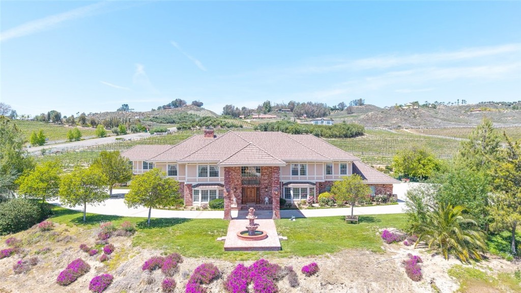 Nestled in the heart of Temecula’s prestigious Wine Country, this extraordinary vineyard estate is a celebration of refined living, panoramic beauty, and the art of winemaking. Set high on the hilltop, this residence overlooks your very own working vineyard, flourishing with Cabernet, Syrah, Merlot, Muscat, Petite Syrah, and Primitivo varietals—an exceptional opportunity to embrace the vintner lifestyle. Step through a grand single entry into a world of timeless elegance. The dramatic foyer welcomes you with two breathtaking chandeliers, a gracefully curved staircase, and vaulted ceilings adorned with rich wood beams, all bathed in natural light. Thoughtfully designed for both comfort and sophistication, the home features a chef’s dream kitchen—ideal for gatherings both intimate and grand—alongside an expansive bar and open-concept living spaces that flow effortlessly throughout. A beautifully customized library/office on the main floor offers a quiet retreat, complete with rich wood shelving and fine craftsmanship. The layout includes a spacious downstairs bedroom with a full bathroom, perfect for guests or multi-generational living, along with an elegant powder room for visitors. Upstairs, a square catwalk offers sweeping views into the magnificent great room below and leads to four generously sized bedrooms, each filled with natural light and designed for comfort. The primary suite is a true sanctuary—boasting serene views of the vineyard, a cozy sitting retreat with fireplace, and a spa-like ensuite bath. Enjoy a luxurious soaking tub, walk-in shower, dual vanities, and a large walk-in closet, all creating the ultimate place to unwind. A secondary dwelling above the detached garage currently serves as a private winemaking room, but offers endless potential as a guest suite or creative space. Every detail of this home exudes luxury, privacy, and lifestyle. Whether you envision a boutique wine label, a family estate, or an entertainer’s dream, 37028 De Portola Road delivers the very best of Temecula Wine Country living.