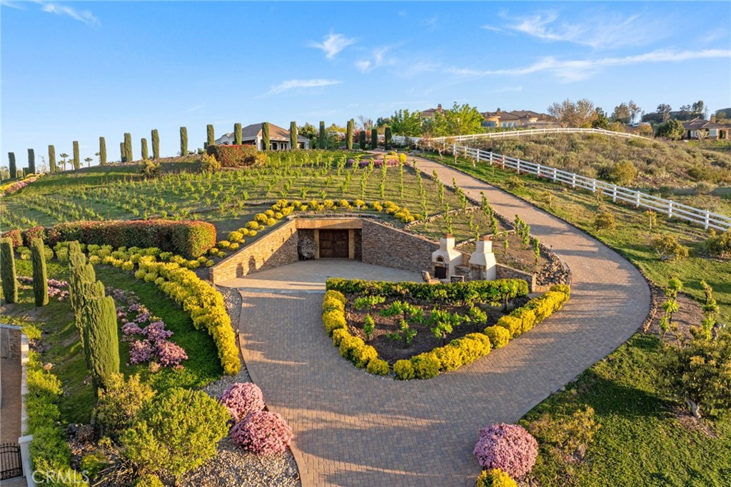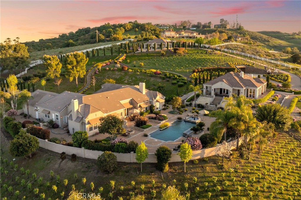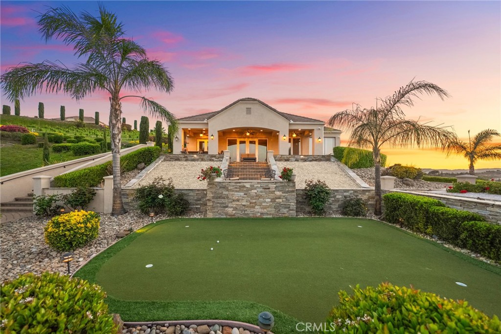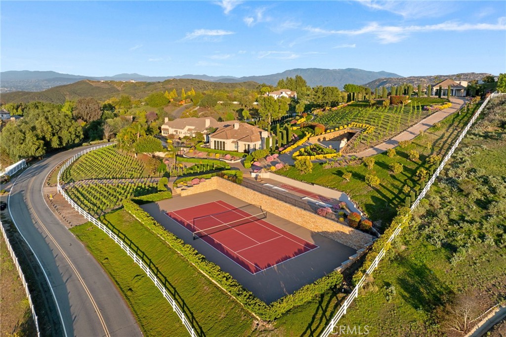 One-of-a-kind estate located just 5 minutes from the charm & culture of Old Town Temecula. Set behind 3 private gated entrances, this sprawling 4.19 acre compound features 3 separate single-story residences & an underground wine cellar all totaling approx. 6100 sq ft, masterfully positioned to capture breathtaking sunset views across rolling hills. The grounds truly set this estate apart; meticulously manicured landscapes framed by stately Italian cypress trees create an outdoor setting unlike any other. A dramatic stone stairway leads from the main home to the elevated studio residence. Entertain w/ ease and elegance w/resort style amenities; sparkling pool, two separate spas, water features, outdoor fireplaces, 2 putting greens, a sports court, & a post-tensioned tennis court w/ breathtaking views. Plus 2 built-in BBQ islands & pizza oven. Approx. 30,000 sq ft of stone pavers weave through the property. The main residence is approx. 3,275 sq ft w/ travertine flooring & architectural arches. It features 3 bedrooms, office, & 3.5 baths. The gourmet kitchen complete with granite countertops, 2 sinks, stainless steel appliances, built-in refrigerator, walk-in pantry, wine fridge, butler's pantry, & bar seating-all flowing seamlessly into the family room w/ views of the pool & gardens. The primary suite offers a private retreat w/ its own fireplace & French doors leading to the amazing pool & spa. The guest house offers approx. 1,600 sq ft of luxury living w/ 2 bdrms, 2 baths, a chef’s kitchen, & fully retractable glass doors opening to commanding views of the surrounding countryside. At the estate's highest point, the studio offers approx. 600 sq ft of open-concept living, complete with an elevated desk area, curved wine bar, a built-in spa, putting green, rooftop lounge, ATV-sized garage, & unmatched panoramic vistas. A 600 sq ft stand-alone reinforced concrete wine cellar is the perfect sanctuary for wine-making enthusiasts - complemented by approx. 1,000 wine grapevines and 21 table grapevines, as well as approx. 100 avocado trees, and various fruit trees. Additional features include upgraded mahogany garage doors, extensive landscape lighting, whole house & outdoor sound systems, multiple whole-house fans for year-round comfort, & a comprehensive security system. Perfect for a multigenerational compound, vineyard retreat, or entertainer's paradise, this Temecula estate redefines California luxury living with a setting that must be seen to be believed.