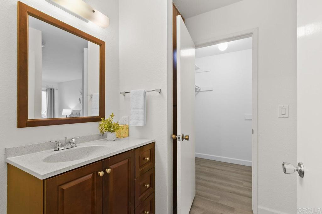 Location, location, location! Welcome to this charming, recently remodeled two bedroom VA approved condominium in the heart of Mission Valley. Thoughtfully upgraded throughout, this home features a modernized kitchen and bathroom, new window coverings, and stylish luxury vinyl plank flooring. The primary suite offers a spacious dressing area with it's own sink, direct access to the full bathroom, a linen closet, and a roomy walk-in closet. Step outside to the sun filled private patio complete with lush artificial turf, a secure private storage closet, and a brand new retractable sunshade. With the shade open, enjoy views of the surrounding neighborhood and car park--an ideal spot for a potted plant garden or relaxing outdoors. Located in the highly desirable Rancho Mission Villas, residents enjoy beautifully manicured grounds, tranquil water fountains, ample guest parking, two pool areas with Jacuzzis, picnic areas with furnishings, and BBQ's, a gym, tennis courts, secured restrooms, and a stunning clubhouse (see CC&Rs for details). This home is within walking distance of shopping, dining, the trolley station, a popular gym, and the exciting Snapdragon Stadium. Imagine hopping on the trolley just steps from your home to East County, Downtown, or North County. Prefer to drive? You'll appreciate the quick and easy access to Highways 8 and 15. Professional grade laundry rooms are conveniently located throughout the complex. Enjoy living in the vibrant Mission Valley community--homeownership at an affordable price with outstanding amenities. This just in: New building roofs in progress! Welcome home to Rancho Mission Villas.