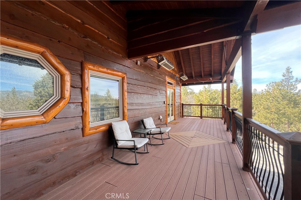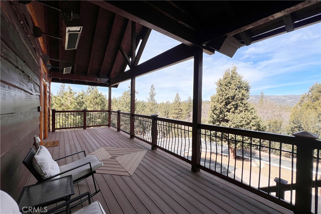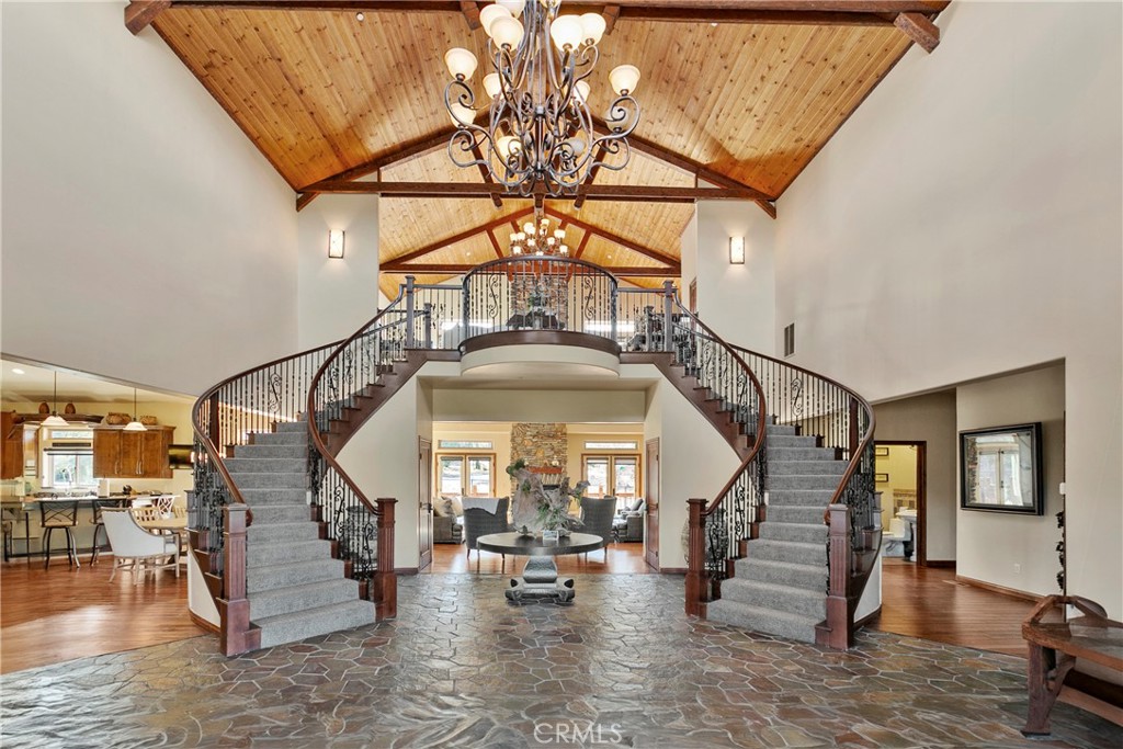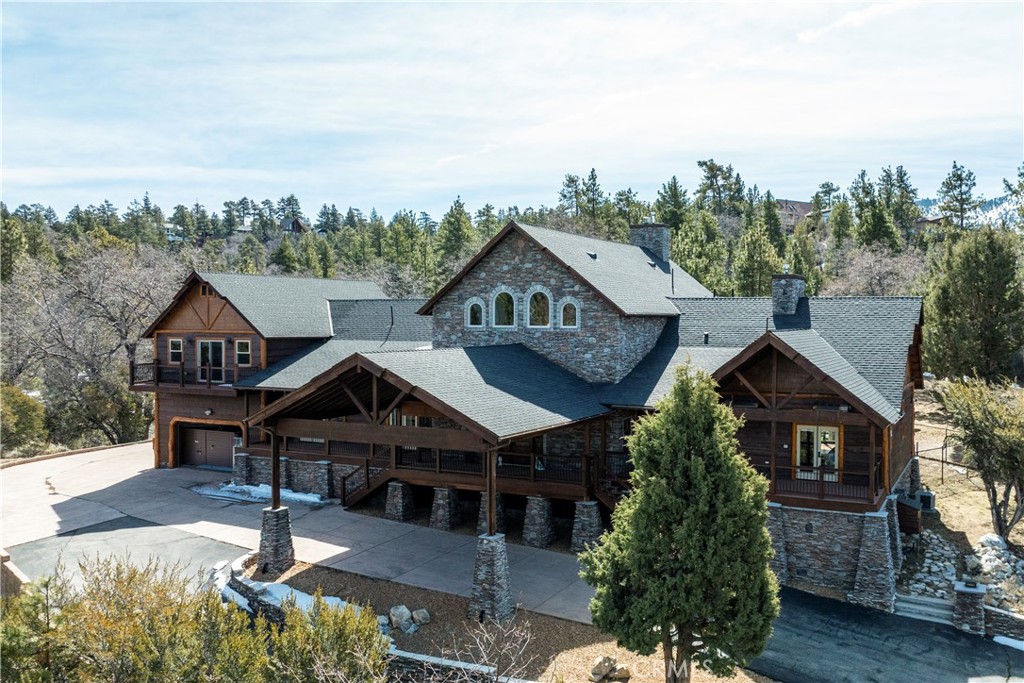 A luxurious 5-bedroom, 6-bath custom mountain estate located in the gated Fox Farm area. Built in 2007, the home spans nearly 5,000 sq ft on a private 1.87-acre lot. Grand entry with soaring wood-beamed cathedral ceilings and slate floor. Open floorplan with multiple living areas, including a family room, formal living, loft/game room with wet bar. Gourmet kitchen: warm wood cabinetry, stainless appliances, granite countertops, breakfast bar, and walk-in pantry. Wine room: temperature-controlled, adjacent to kitchen. Fireplaces (3 total): located in living room, family room, and the master suite, all adorned with stacked-stone finishes. Composite decks at both front and back, accessible from all bedrooms, offering serene forest and mountain views. Large covered front porch and a matching rear deck for entertaining. Four-car attached garage + porte cochère & driveway with gated private drive. Bonus office/nursery off the primary suite, complete with custom dog-run. Temperature-controlled wine room & walk-in pantry for storage convenience. HVAC with central air, whole house humidifier, forced-air heating. Luxury finishes: beamed ceilings, slate/tile/wood flooring, double-pane windows, wet bar. Security system owned. Captivating views of surrounding mountains and forest from multiple vantage points Located in Big Bear’s central Fox Farm area, just minutes from ski slopes, the lake, hiking, and local amenities. Gated entry with private road leading up to property. Offered fully furnished. ZONED SAN BERNARDINO COUNTY - ALMOST 2 ACRES - CAN BUILD ADU - CONTACT COUNTY FOR DETAILS.