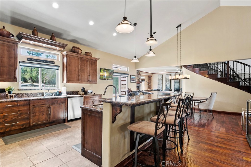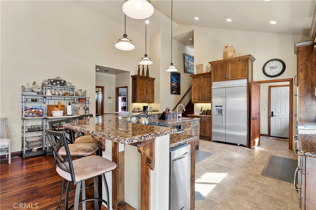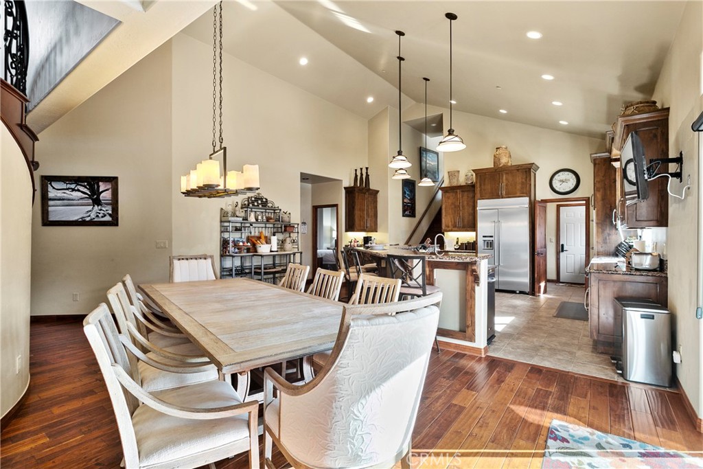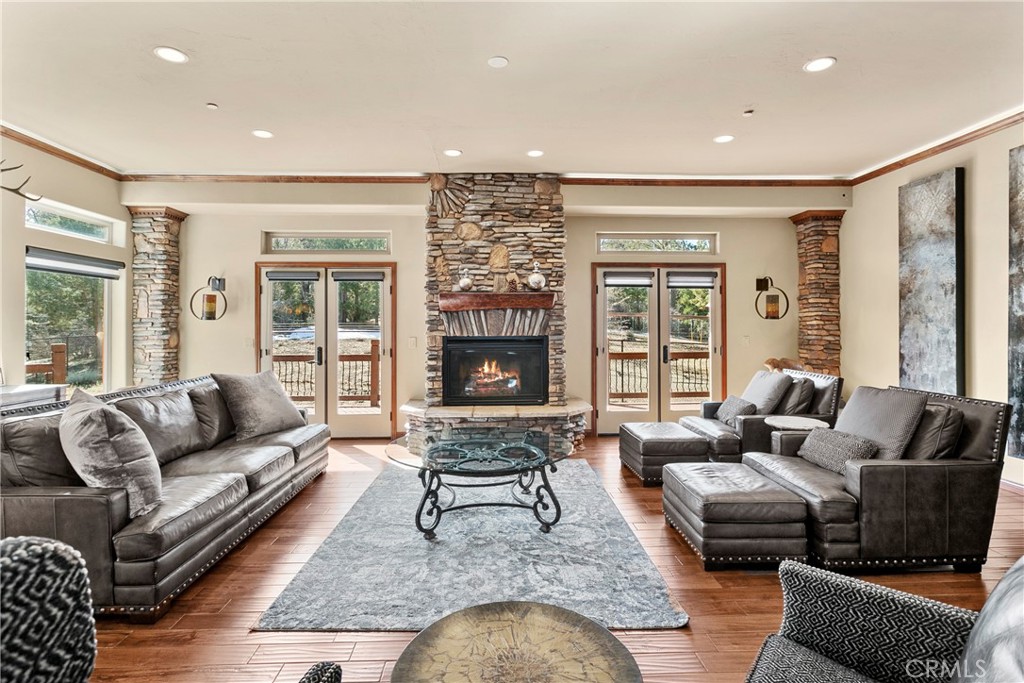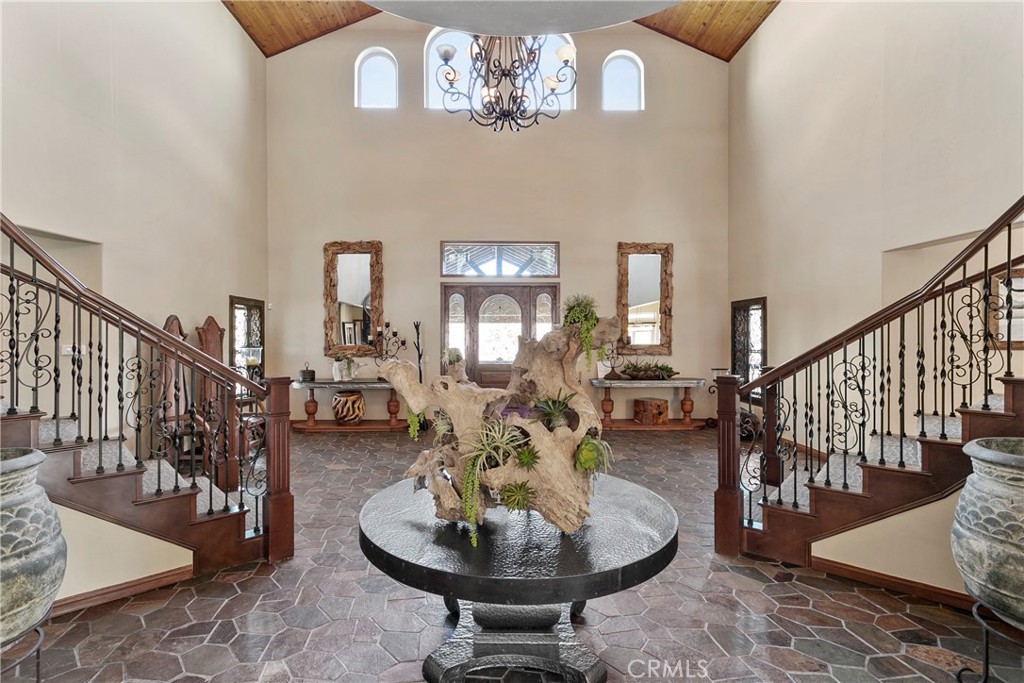 A luxurious 5-bedroom, 6-bath custom mountain estate located in the gated Fox Farm area. Built in 2007, the home spans nearly 5,000 sq ft on a private 1.87-acre lot. Grand entry with soaring wood-beamed cathedral ceilings and slate floor. Open floorplan with multiple living areas, including a family room, formal living, loft/game room with wet bar. Gourmet kitchen: warm wood cabinetry, stainless appliances, granite countertops, breakfast bar, and walk-in pantry. Wine room: temperature-controlled, adjacent to kitchen. Fireplaces (3 total): located in living room, family room, and the master suite, all adorned with stacked-stone finishes. Composite decks at both front and back, accessible from all bedrooms, offering serene forest and mountain views. Large covered front porch and a matching rear deck for entertaining. Four-car attached garage + porte cochère & driveway with gated private drive. Bonus office/nursery off the primary suite, complete with custom dog-run. Temperature-controlled wine room & walk-in pantry for storage convenience. HVAC with central air, whole house humidifier, forced-air heating. Luxury finishes: beamed ceilings, slate/tile/wood flooring, double-pane windows, wet bar. Security system owned. Captivating views of surrounding mountains and forest from multiple vantage points Located in Big Bear’s central Fox Farm area, just minutes from ski slopes, the lake, hiking, and local amenities. Gated entry with private road leading up to property. Offered fully furnished. ZONED SAN BERNARDINO COUNTY - ALMOST 2 ACRES - CAN BUILD ADU - CONTACT COUNTY FOR DETAILS.