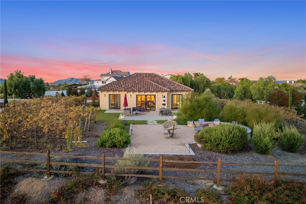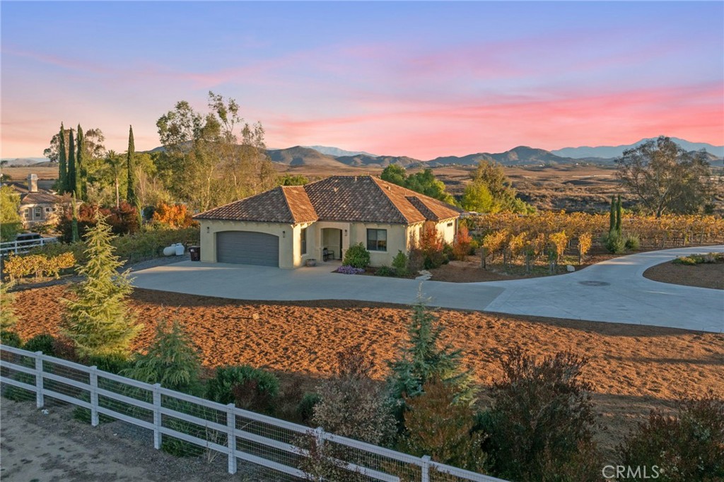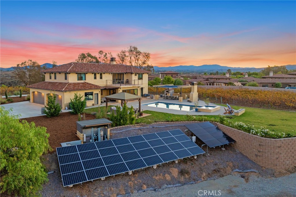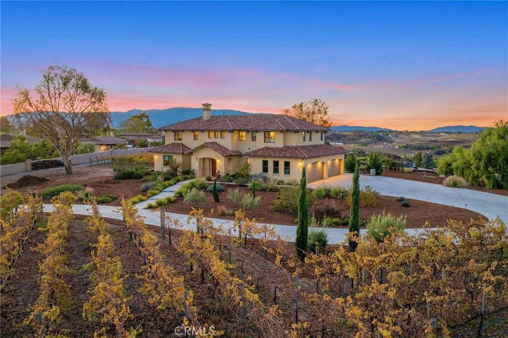 TEMECULA WINE COUNTRY W/INCOME POTENTIAL! Live in one and rent the other! Rare opportunity to own TWO TUSCANY-inspired homes perched on a hill with stunning views from every angle featuring old world sophistication in a private cul-de-sac setting. Situated on just over 2 acres in Temecula Wine Country, this estate FEATURES 4 TYPES OF VINES: MALBEC,CAB FRANC, CAB SAUV AND MERLOT. A dramatic gated entry at the bottom of the driveway leads past VINEYARDS and the 3-bedroom residence on the right, continuing to the 4-bedroom main home on the left. The main residence features a custom pool with smooth Pebble Tec finish and Lunada Bay glass tile, plus a 10-person spa. Ideal for entertaining with a custom wood-fired pizza oven, wood-burning fireplace, and gas fire pit. Custom knotty alder entry doors open to soaring ceilings and breathtaking valley views through Solarian windows overlooking the pool, spa, and fire pit. The formal dining room sits within the Solarian window setting—perfect for evening entertaining and valley lights. Off the great room with fireplace is a spa-inspired junior suite with full bath, office, and downstairs powder room. The kitchen offers high-end appliances and finishes including a side-by-side Sub-Zero refrigerator, Wolf range and microwave, two Bosch dishwashers, Kohler faucet, Cambria Ella quartz island with contrasting quartz countertops, and handmade Spanish subway tile backsplash. Upstairs features a private secondary family room separating the generous primary suite from two additional bedrooms and baths. An oversized balcony offers incredible vineyard views. Flooring includes European oil-finished oak, custom American oak stair treads, and quartz, marble, and granite throughout. Additional upgrades include custom cabinetry, solid-core interior doors, dual high-efficiency HVAC, whole-house attic fan, Santa Barbara smooth stucco, gas fireplace with flagstone façade, authentic clay tile roof, and sound system. The second home JUST AS STUNNING, offers 3 beds/3 baths with sweeping San Jacinto Mountain views, stainless steel appliances, quartz counters, and fire pit. Drip irrigation keeps annual water costs at about $200 per month during grape growing season.40 owned solar panels cover most electric usage. Fire sprinklers in both homes helps keep homeowners' insurance reasonable. NO HOA. Vitner cost to tend to the grapes has been approximately $2000 per growing season. Gardener cost approximately $1400 annually.