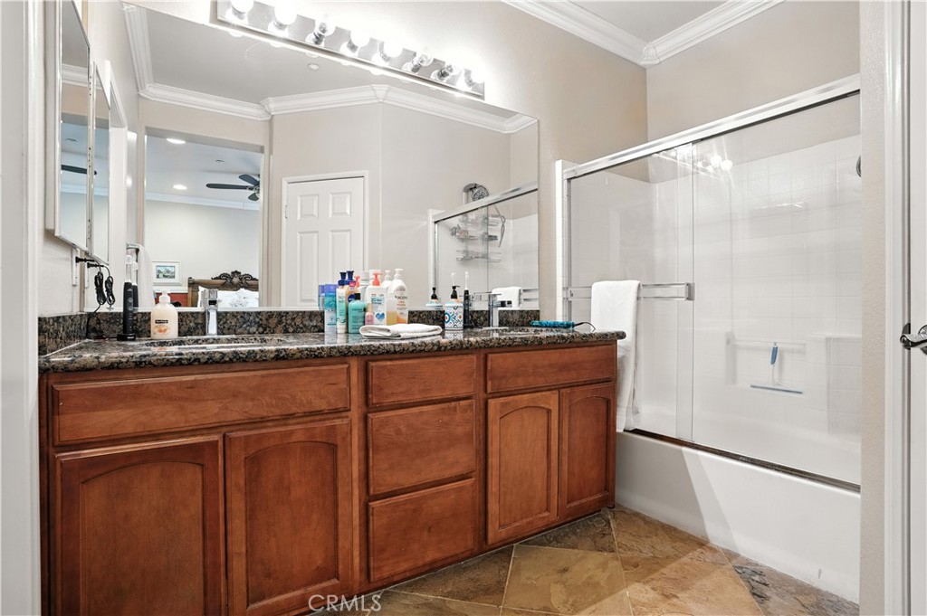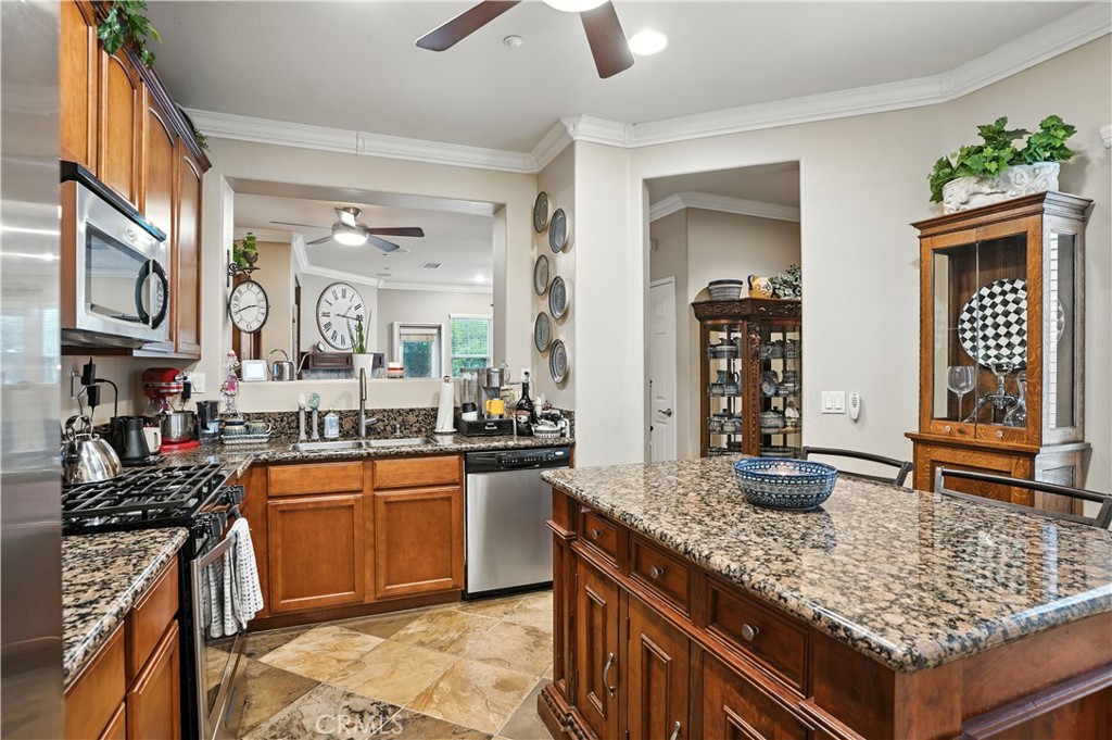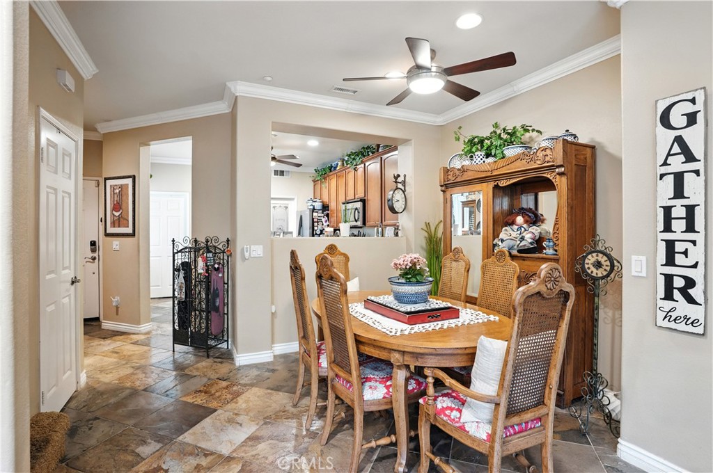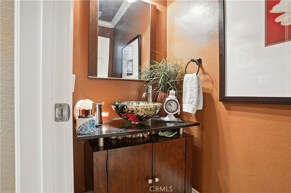 Tucked in the desired Vista Del Lago community this model quality 3 bed 2.5 bath townhome features a custom kitchen island, decorative crown molding and slate-stone tile floors. The kitchen offers a spacious pantry, granite counters tops, stainless steel appliances and rich maple wood cabinetry. The living room offers a cozy fireplace, a built-in entertainment niche, and built in surround sound, plus a screen door that invite a cross-breeze. Additionally the glass door and large windows fill the home with natural light but with added window tint to help against heat. A convenient powder room downstairs with a beautiful decorative glass bowl sink. Upstairs, the primary suite enjoys hill views, a walk-in closet with organizer and an ensuite bath with double-sink vanity. Ceiling fans and recessed lighting with dimmers throughout offer added lighting and comfort. Outdoors, enjoy a private cozy backyard with a garden, perfect for relaxing. Additionally the home features an attached long garage with direct home access that can fit 2 small cars or 1 car and motorcycle plus added storage space. Enjoy lake views within the community, plus a playground, pool, spa and additional parking space available. Convenient close to the lake, shopping, dining. Also close to the 15 freeway, schools, storms stadium, golf, and entertainment. Contact me if you'd like to take a tour of this home.