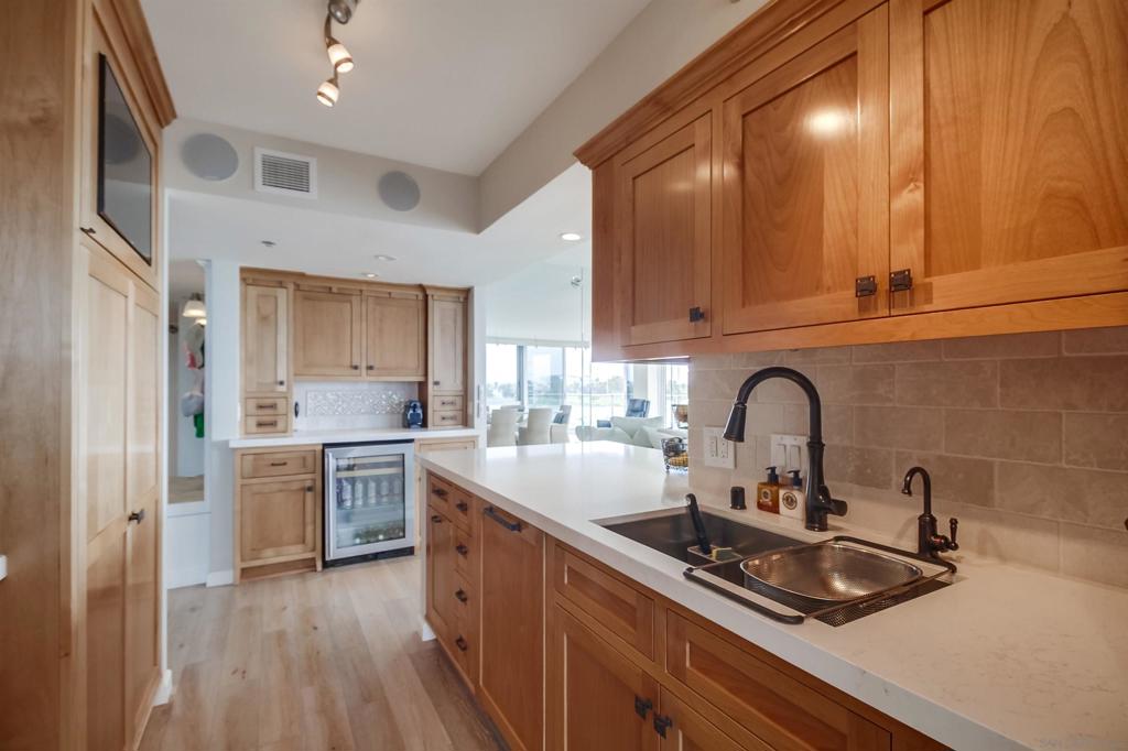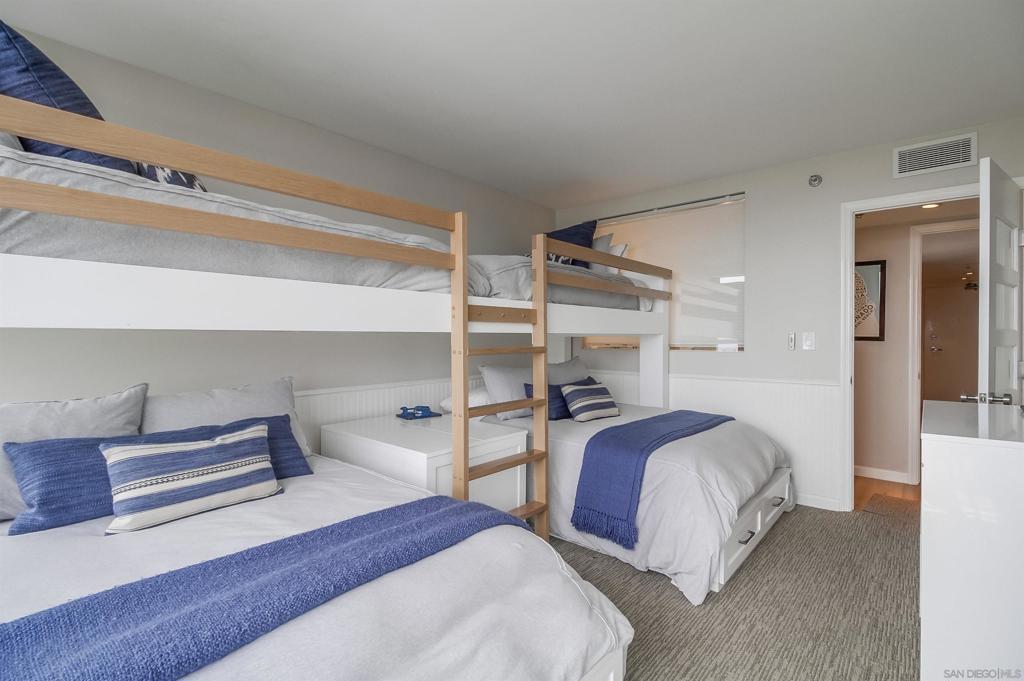 Located in the exclusive Coronado Shores complex, this beautifully remodeled 2-bedroom, 2-bathroom condo offers stunning panoramic views of the San Diego Bay. Designed with exquisite taste and attention to detail, the unit features a fully equipped luxury kitchen, high-end finishes throughout, and windows that open across the unit to invite in natural light and bay breeze. A private balcony provides the perfect space to relax and take in the views. Residents enjoy access to top-tier amenities including direct beach access, four oceanfront pools, tennis and pickleball courts, a clubhouse with gym and lounges, and expansive grassy areas for recreation. This is coastal living at its finest.