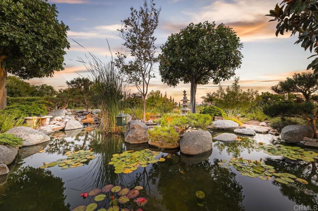 Welcome to your own 1.32 acre resort with large pool plus beach entry, hot tub, sport court, large koi pond, 40 electric solar panels, pool heating solar, garden, fruit trees, sunset views, and plenty of parking. The 2-story home has had many upgrades throughout. The spacious floorplan has a 20+ foot ceiling in the living room directly in front of the entry, a first floor bedroom suite with full bath, and dining room. The kitchen boasts a Wolf gas cooktop in the center island with hood and sink, a large sink facing the window overlooking the koi pond, separate Subzero refrigerator and freezer, dishwasher, double ovens, 2 hidden double trash drawers, warming drawer, bread baskets to keep bread fresh, a huge walk-in pantry, microwave, and a roll-up hideout for counter appliances. The large breakfast nook leads to the family room with large screen wall-mounted TV. Further past is the gorgeous office edition with beam ceilings and beautiful built-in cabinets. The 4 car garage has ample cabinet and ceiling storage. The elegant stairway to the second floor was remodeled in 2007. There is the primary suite with windows looking out toward the west to northwest to see magnificent sunsets. A large bathroom with steam shower and large tub with views is on the other side of the classy 3-sided fireplace.