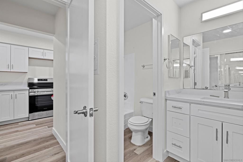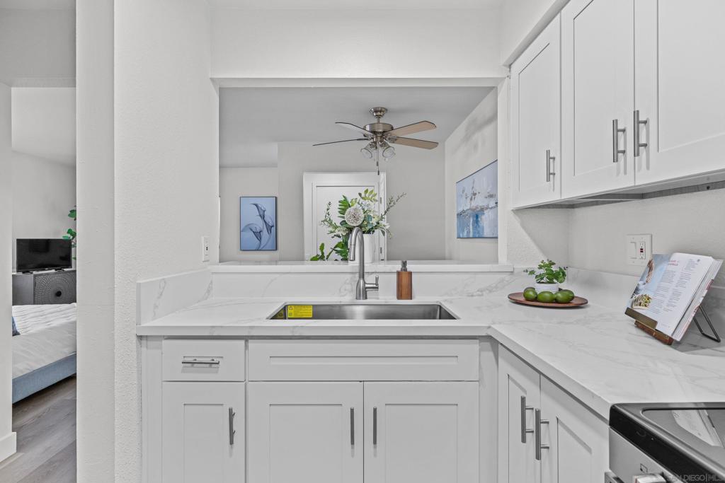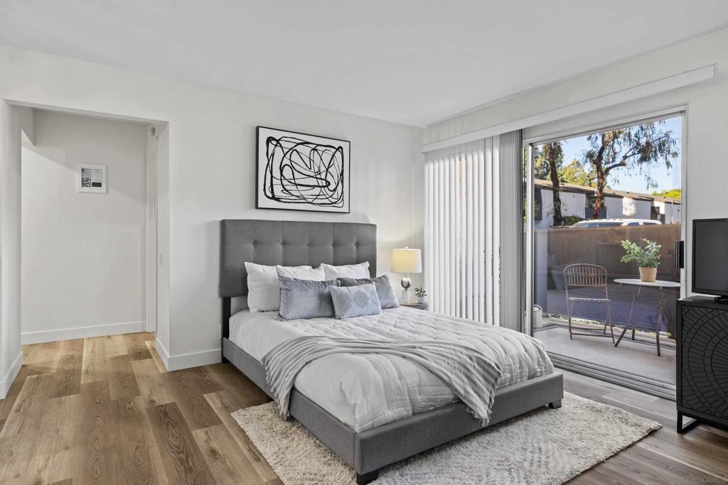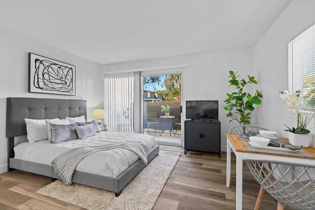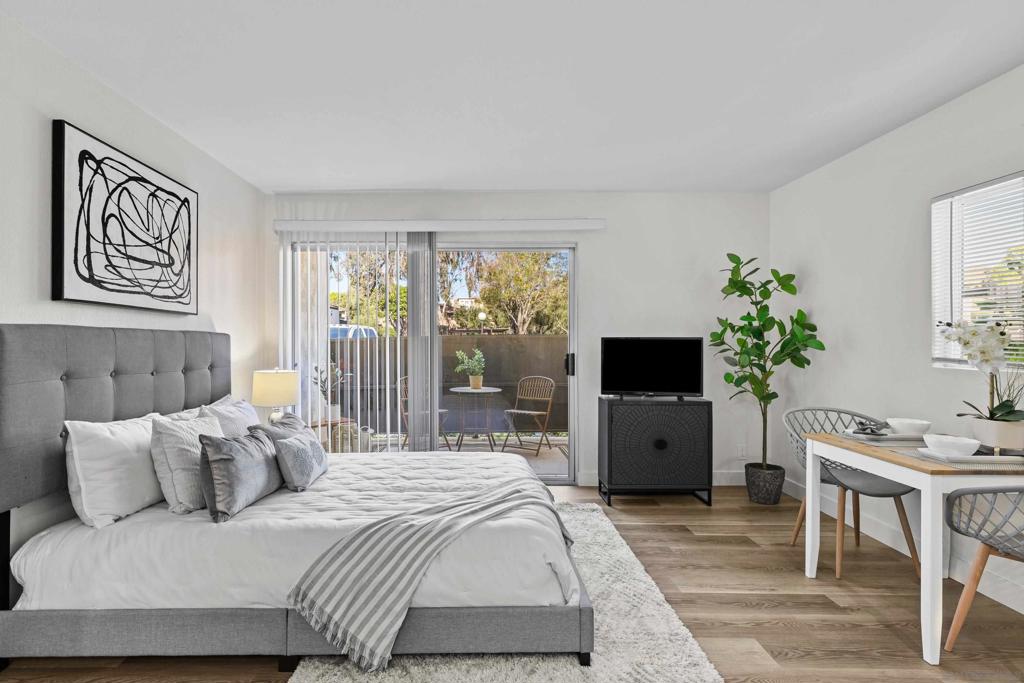 Live in the heart of Mission Valley in this beautifully upgraded studio! Step inside to a bright, open living and sleeping area, featuring fresh LVP flooring, a large sliding glass door to your private patio, and an additional window that floods the space with natural light. The spacious patio, enclosed by tall privacy fencing, creates a serene retreat perfect for morning coffee or evening unwinding. Inside, the dining area flows seamlessly into the fully remodeled kitchen, complete with crisp white cabinetry, sleek Quartz countertops, and brand-new stainless steel appliances. The bathroom mirrors the kitchen’s modern design with matching cabinetry and Quartz countertops, a shower/tub combo, and a generous closet for extra storage. Enjoy resort-style living with community amenities including a sparkling pool and spa, BBQ area, clubhouse, and convenient on-site laundry. With one assigned parking space and unbeatable access to shopping, dining, and the scenic San Diego River Trail, this Mission Valley gem offers both comfort and convenience.