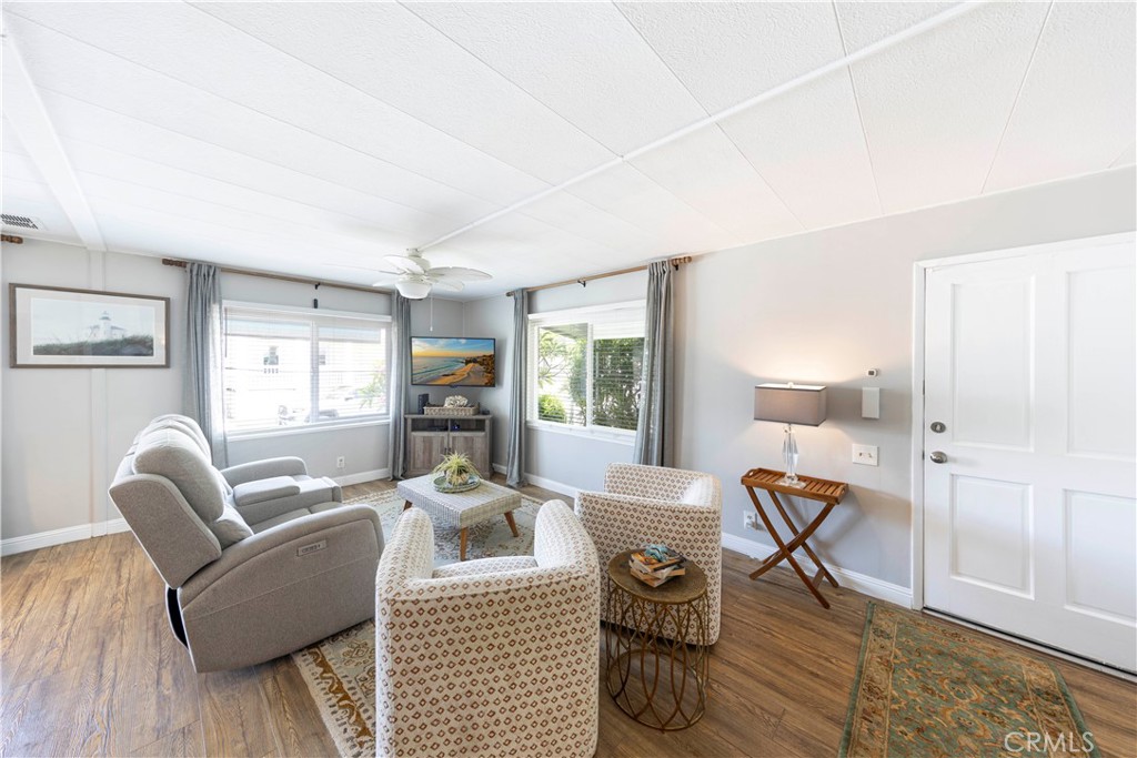 Spacious 2BR/2BA + office/3rd BR in desirable 55+ community near downtown San Juan Capistrano & Doheny Beach. Remodeled master & guest baths, updated kitchen w/new cabinets, counters, backsplash, and extended breakfast bar. New laminate wood flooring, ceiling fans, and screened front porch w/café lighting. Private backyard oasis with orange & lemon trees, roses, plumeria, bird of paradise, perennials, succulents, water fountain, and gate to scenic San Juan Hills & community amenities. New 30-yr roof, 2025 HVAC, newer water heater, electric panel, energy-efficient windows, smart thermostat. Seasonal trolley stop at community entrance to SJC, Dana Point, & Laguna Beach. Pet-friendly park w/clubhouse, pool, jacuzzi, putting green & more!