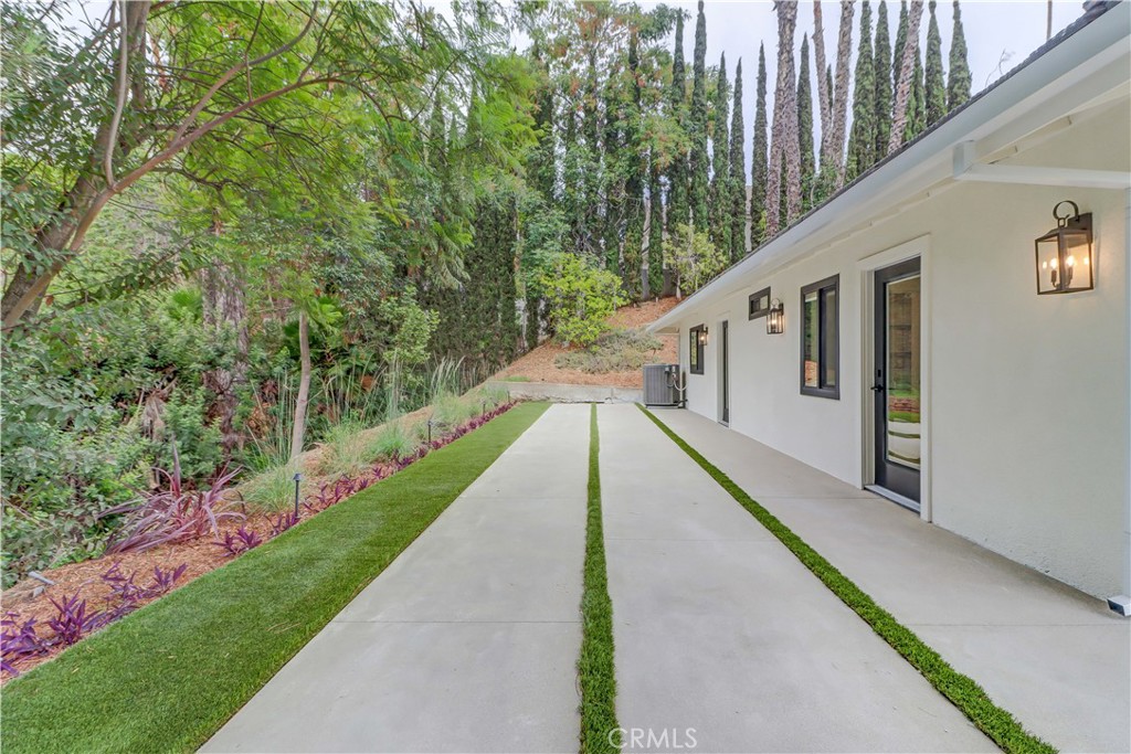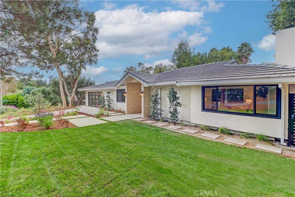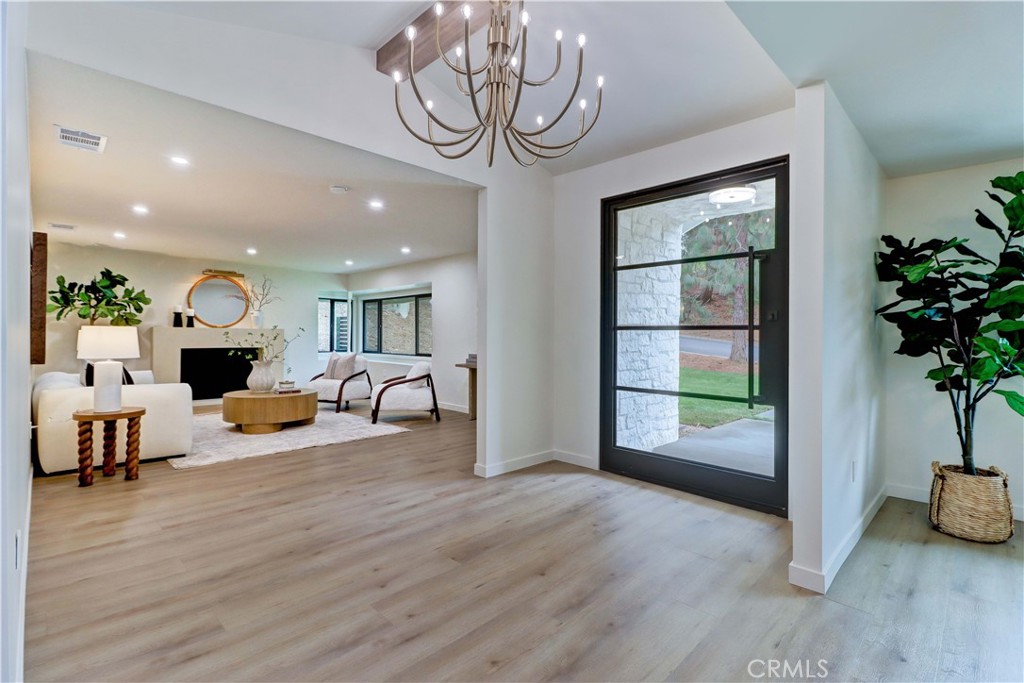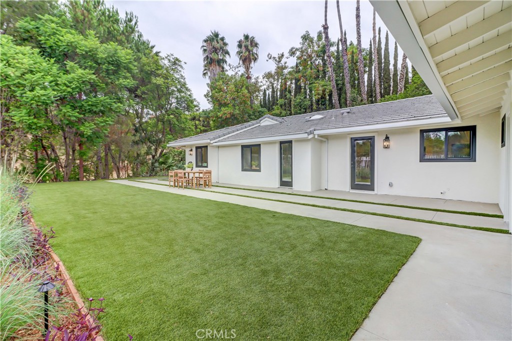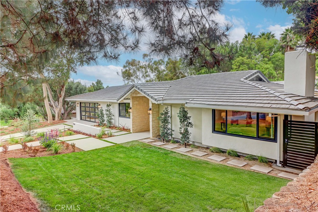 Searching for a single-story modern masterpiece tucked away amid the gentle slopes of North Tustin? This fully renovated 5-bedroom, 3-bath residence in the prestigious Cowan Heights neighborhood blends architectural elegance with everyday functionality on a private 0.37-acre lot, surrounded by mature trees and hillside serenity! From the moment you arrive, many sleek black-framed dual-pane windows and a custom metal pivot door set the tone for the design-forward touches that continue throughout the home. A striking stone archway and chandelier welcome you into an open floor plan filled with natural light from strategically placed skylights. Smooth drywall, soothing neutral hues, luxury vinyl flooring, and contemporary finishes create a clean, organic aesthetic that's both stylish and comfortable. The generous living room, centered around a sculptural bespoke plaster fireplace, flows effortlessly into a nearby dining alcove and kitchen ready for conversation and culinary endeavors. Cook with confidence using the French-inspired range beneath a handcrafted hood, surrounded by quartzite countertops, abundant cabinetry, stainless steel appliances, and a multi-seater island suitable for casual gatherings. A new mud room with a substantial pantry adds to the abode's many flexible spaces. Retreat to the primary bedroom with its patio access and spa-like ensuite featuring an oversized frameless shower with dual showerheads. A junior suite offers its own exterior entrance, pass-through bath, and a separate sitting area—ideal for guests or multi-generational living. Every bath and closet door in the residence is customized, and each shower features luxurious tile work, creating a sense of refined craftsmanship everywhere you turn. Stunning French and sliding glass doors invite you into a secluded courtyard or custom-landscaped backyard where synthetic grass, new concrete embellishments, and views of the adjacent ravine offer an idyllic outdoor escape. The fenced side yard is perfect for weekend BBQs or evenings with cocktails under the stars. You’re conveniently located just a short drive from shopping destinations, a multitude of entertainment options, and the nature trails of Santiago Canyon and Irvine Lake. This home also offers proximity to award-winning schools in one of Orange County’s most sought-after communities. Come see how design, comfort, and character come together at this striking haven and imagine yourself a part of it all!