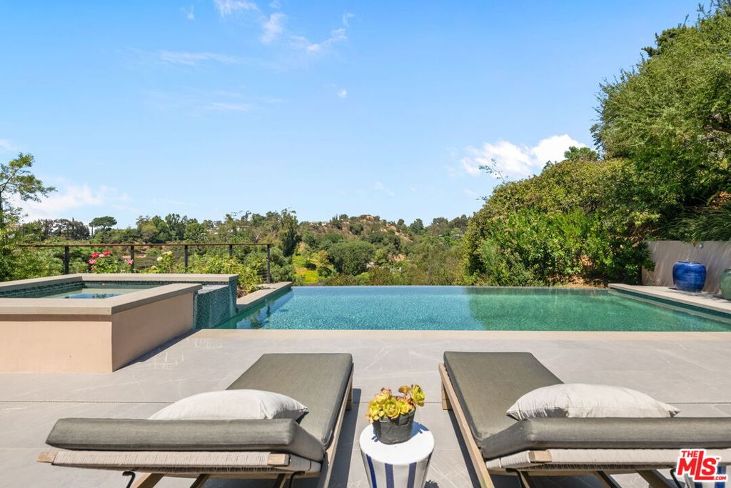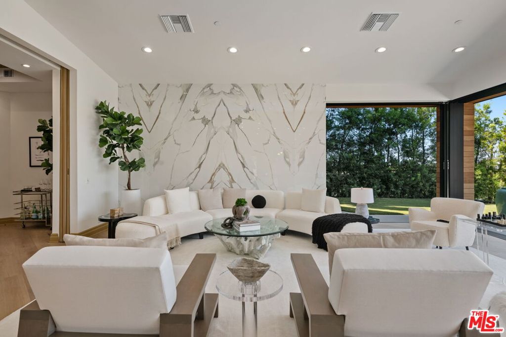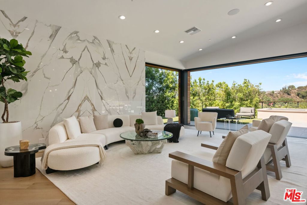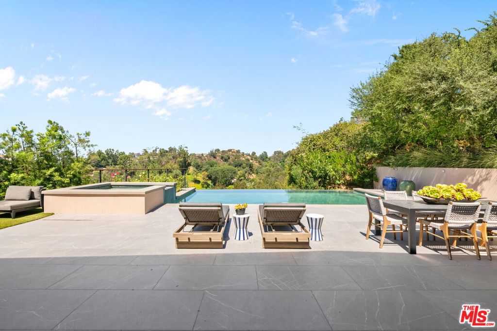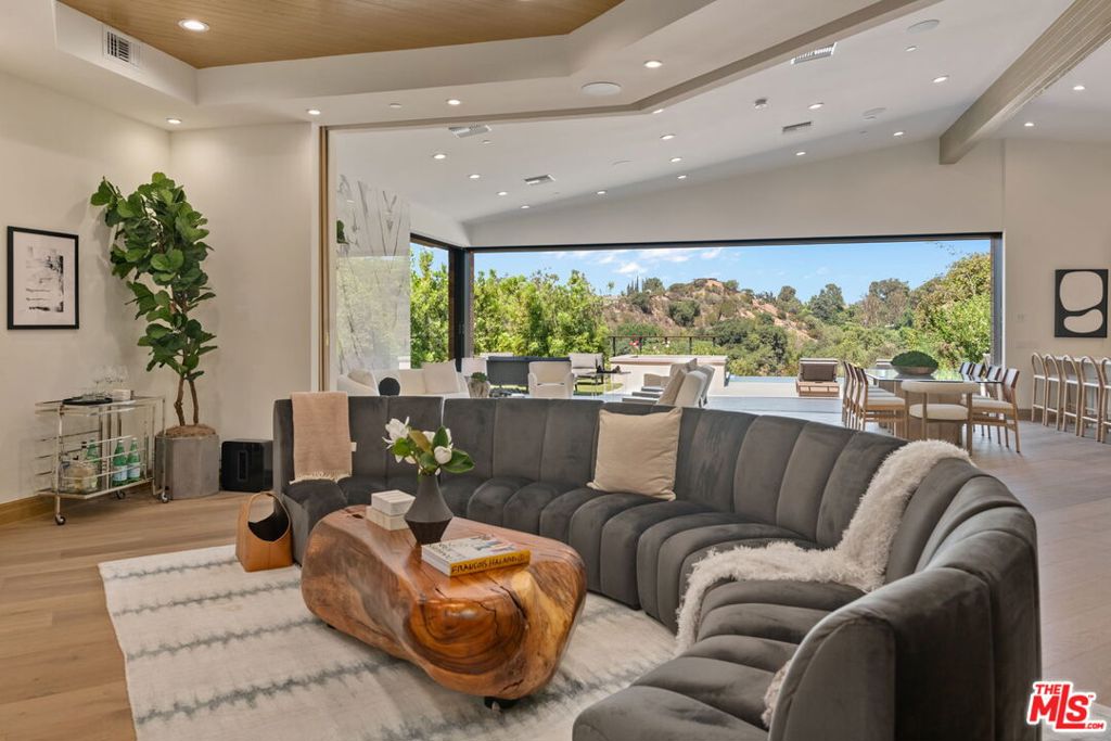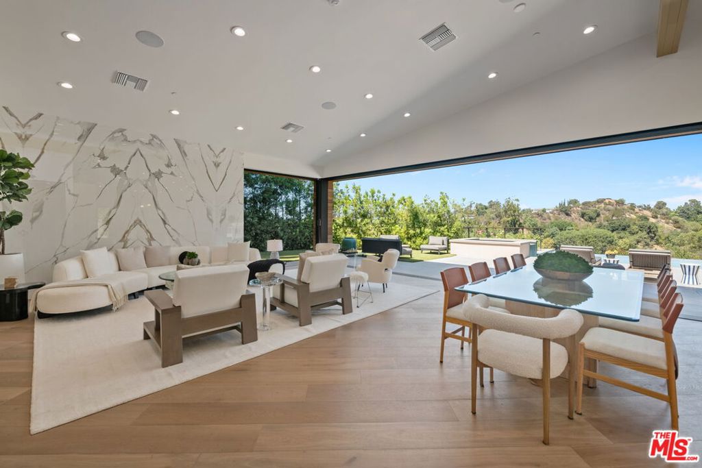 A brand-new single-story masterpiece, perfectly situated on a quiet cul-de-sac just north of the prestigious Trousdale Estates. Surrounded by beautiful trees and serene canyon views, this contemporary residence offers an exceptional blend of luxury, comfort, and sophistication. Designed with a seamless open floor plan and effortless indoor-outdoor flow, the living room boasts floor-to-ceiling automated sliding glass doors that open to a private backyard oasis with an infinity pool, spa, and waterfall. The expansive great room unites the living, dining, and chef's kitchen, featuring Miele appliances, dual sinks and ovens, two dishwashers, built-in espresso/coffee maker, microwave, and a refrigerator and freezer. A generous island and elegant European wood floors enhance the home's refined design. Offering 6 ensuite bedrooms and 9 bathrooms, the home provides unparalleled comfort for both family and guests. The media room, complete with a wide electric fireplace can be closed for privacy or opened to the main living area. The grand primary suite is a sanctuary, featuring a cozy seating area, private patio, and a stunning pearl onyx double-sided fireplace. It is complemented by two luxurious bathrooms with a soaking tub and steam shower complete this extraordinary retreat. Additional highlights include a temperature-controlled glass wine room, Sonos Arc sound system, and the finest finishes throughout. A true entertainer's dream, this residence exemplifies modern luxury at its finest.