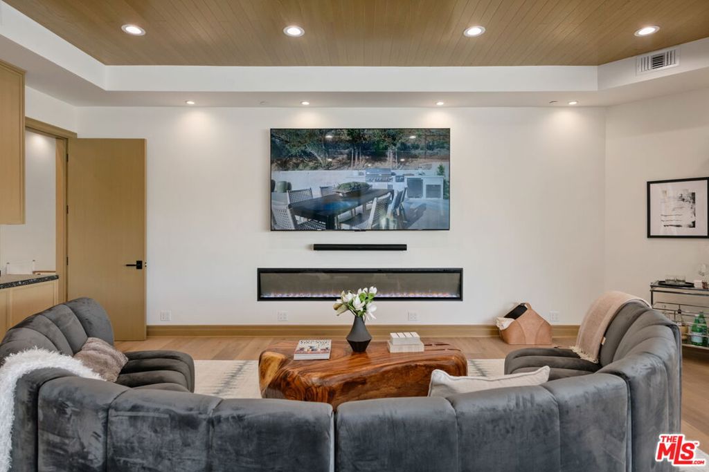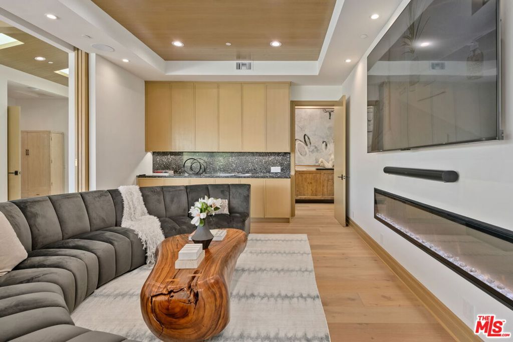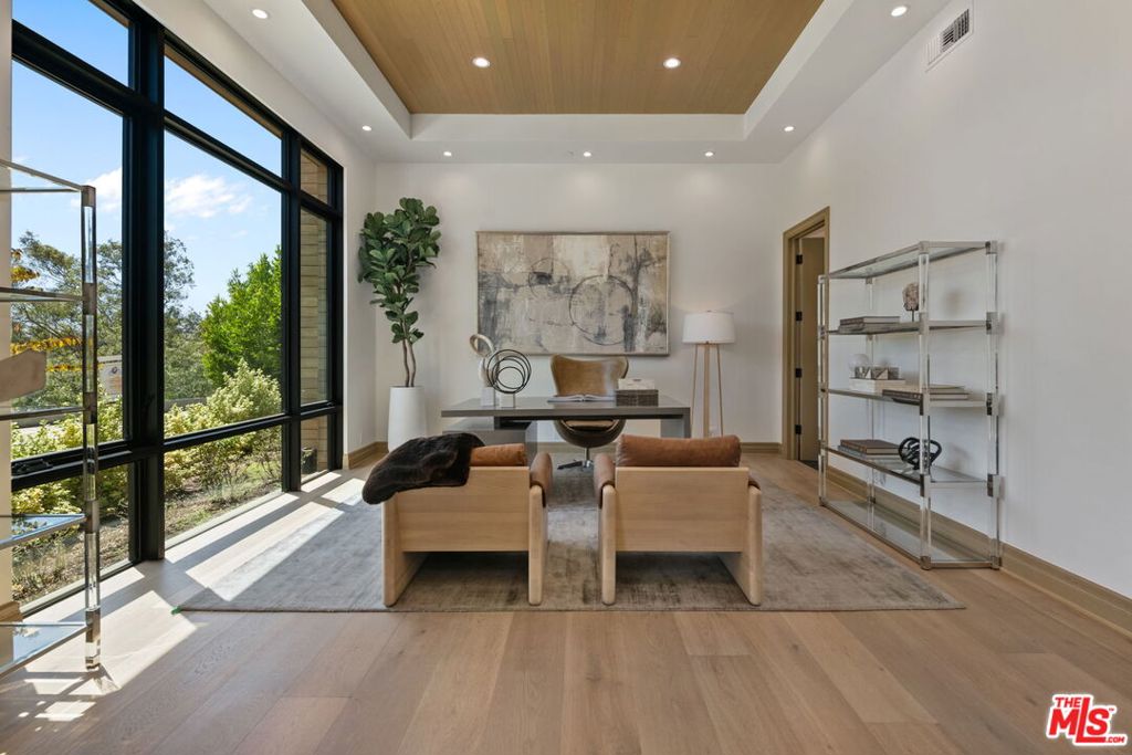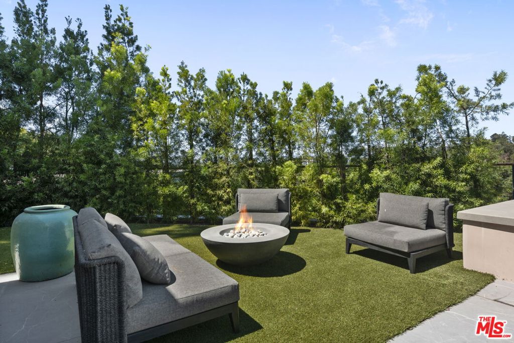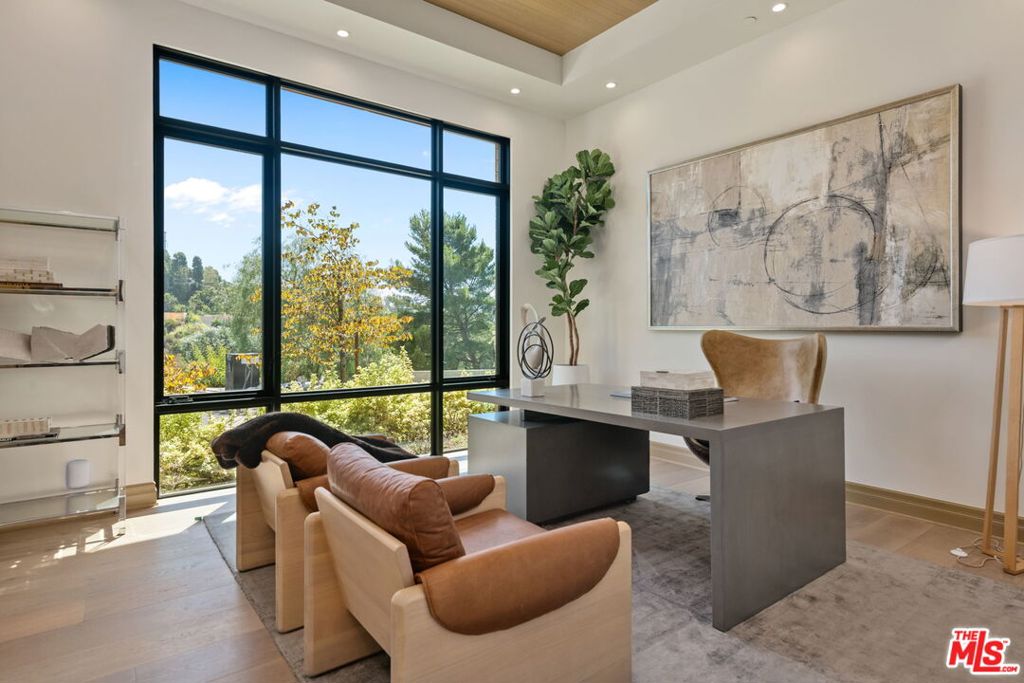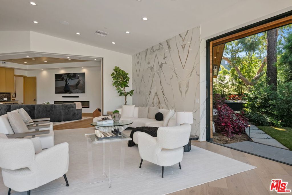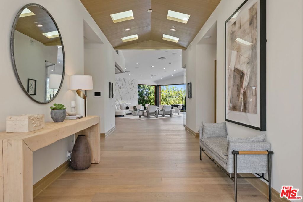 A brand-new single-story masterpiece, perfectly situated on a quiet cul-de-sac just north of the prestigious Trousdale Estates. Surrounded by beautiful trees and serene canyon views, this contemporary residence offers an exceptional blend of luxury, comfort, and sophistication. Designed with a seamless open floor plan and effortless indoor-outdoor flow, the living room boasts floor-to-ceiling automated sliding glass doors that open to a private backyard oasis with an infinity pool, spa, and waterfall. The expansive great room unites the living, dining, and chef's kitchen, featuring Miele appliances, dual sinks and ovens, two dishwashers, built-in espresso/coffee maker, microwave, and a refrigerator and freezer. A generous island and elegant European wood floors enhance the home's refined design. Offering 6 ensuite bedrooms and 9 bathrooms, the home provides unparalleled comfort for both family and guests. The media room, complete with a wide electric fireplace can be closed for privacy or opened to the main living area. The grand primary suite is a sanctuary, featuring a cozy seating area, private patio, and a stunning pearl onyx double-sided fireplace. It is complemented by two luxurious bathrooms with a soaking tub and steam shower complete this extraordinary retreat. Additional highlights include a temperature-controlled glass wine room, Sonos Arc sound system, and the finest finishes throughout. A true entertainer's dream, this residence exemplifies modern luxury at its finest.