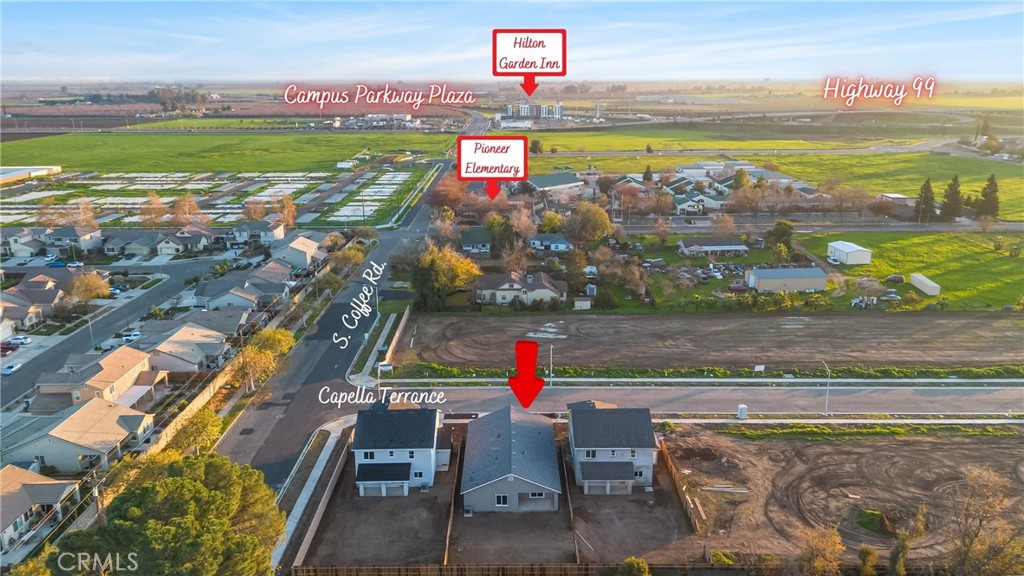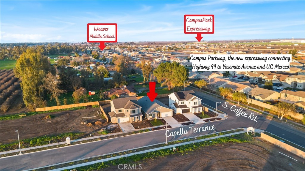 Located in the heart of Campus Parkway, Capella Terrace sits in one of Merced’s fastest-growing areas with UC Merced expansion, new infrastructure, and future commercial development nearby—making this a prime location to invest in now. This high-quality, single-story home offers 4 bedrooms and 2 bathrooms with a spacious entry, a front guest bedroom or home office, and an open floor plan anchored by a large oversized island. The kitchen features soft-close cabinetry, walk-in pantry, and maximized storage under the island, while the primary suite includes a walk-in closet. Finished with smooth satin-painted walls and a fully finished garage, the home also offers all-electric living, MID with affordable solar, and is located in the Weaver Union School District. The backyard includes a covered patio, room for a future pool, and no two-story homes behind, providing added privacy. Quality construction, smart design, and a premier Campus Parkway location make this an exceptional opportunity.