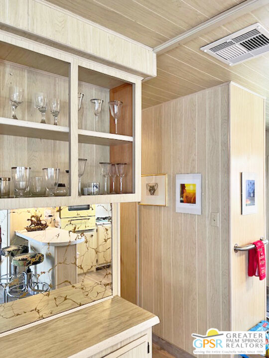This park is owned by a non-profit corporation in the business of owning mobile home parks. 272 Araby St is located in Sahara Park, a senior community under rent control. Mobile home is a 1967 Goldenwest double wide coach with two bedrooms, two bathrooms, each remodeled in tile, open living room to dining area/office, and vintage kitchen. Laminate flooring installed in 2023. Ceiling fan with light and disappearing blades when not in use, central air and heat, stacking washer and dryer, refrigerator, oven, range and breakfast bar in the kitchen. Front and back covered patios the whole length of the unit with stunning Mountain Views from the front patio. Park amenities: Pool, spa, clubhouse with card room, TV room, library, full kitchen, stage, meeting room, and electronic bingo board. Exercise room and many park activities. All photos are altered. Current Rent $615.19