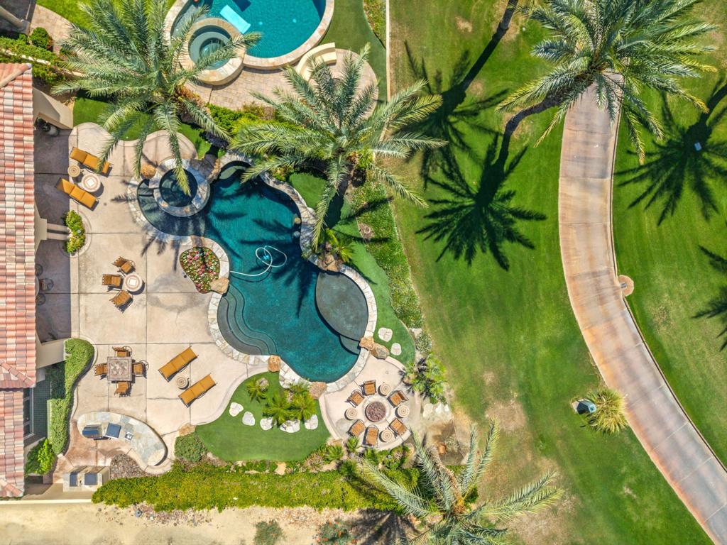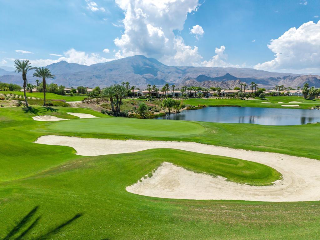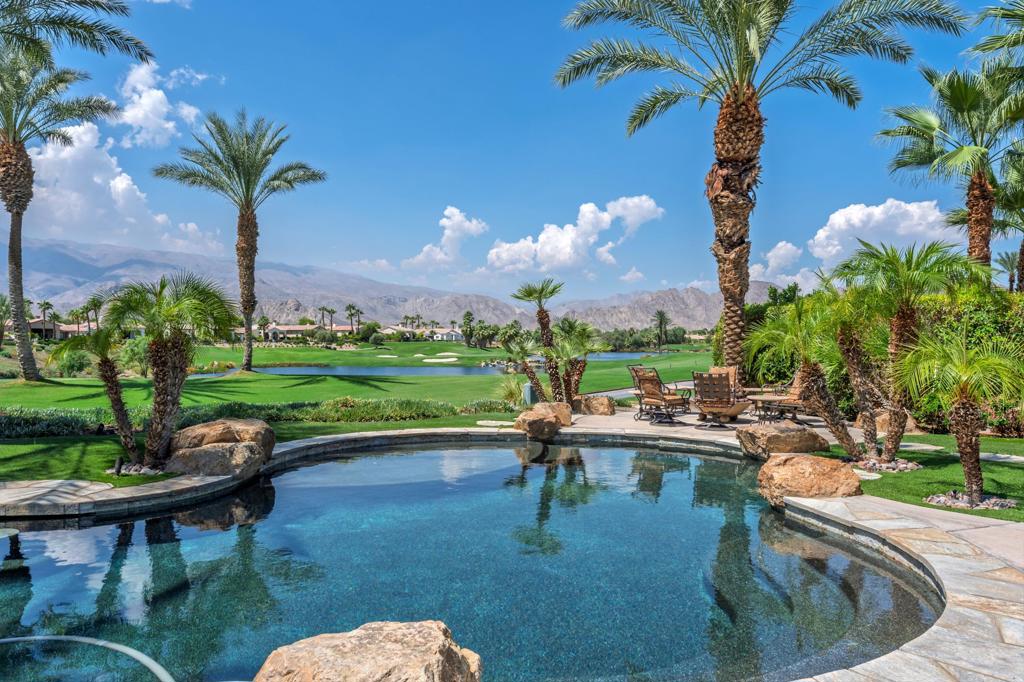 Elevated above the 4th green, this residence captures sweeping South-West views of the Rees Jones designed course, shimmering lake, and the majestic Santa Rosa and Coral Mountains. Step inside to an open floor plan highlighted by elegant travertine floors, crown molding, recessed lighting, and expansive motorized walls of glass that disappear with the push of a button, creating seamless indoor/outdoor living. The gourmet kitchen is equipped with upgraded cabinetry, Wolf/Sub-Zero appliances, two dishwashers, a wet bar, and a morning room that takes in the spectacular views. A temperature-controlled wine room adds the perfect touch for wine enthusiasts, while a dedicated office provides a quiet retreat for work or study. The luxurious primary suite features a cozy fireplace and a spa-inspired bathroom with direct patio access. Guests will enjoy the detached casita, complete with a fireplace in the living room, bedroom, bathroom, and kitchenette. The backyard is a true entertainer's dream, boasting a custom pool and spa, an outdoor kitchen with BBQ, smoker, and bar seating, plus a fire pit to gather around on cool desert nights. A large side yard with a private horseshoe court completes this exceptional outdoor living experience. Come live the life you've always imagined!
