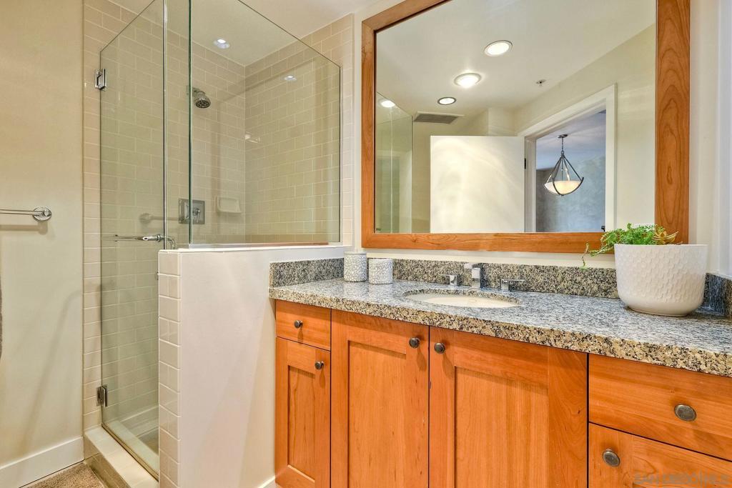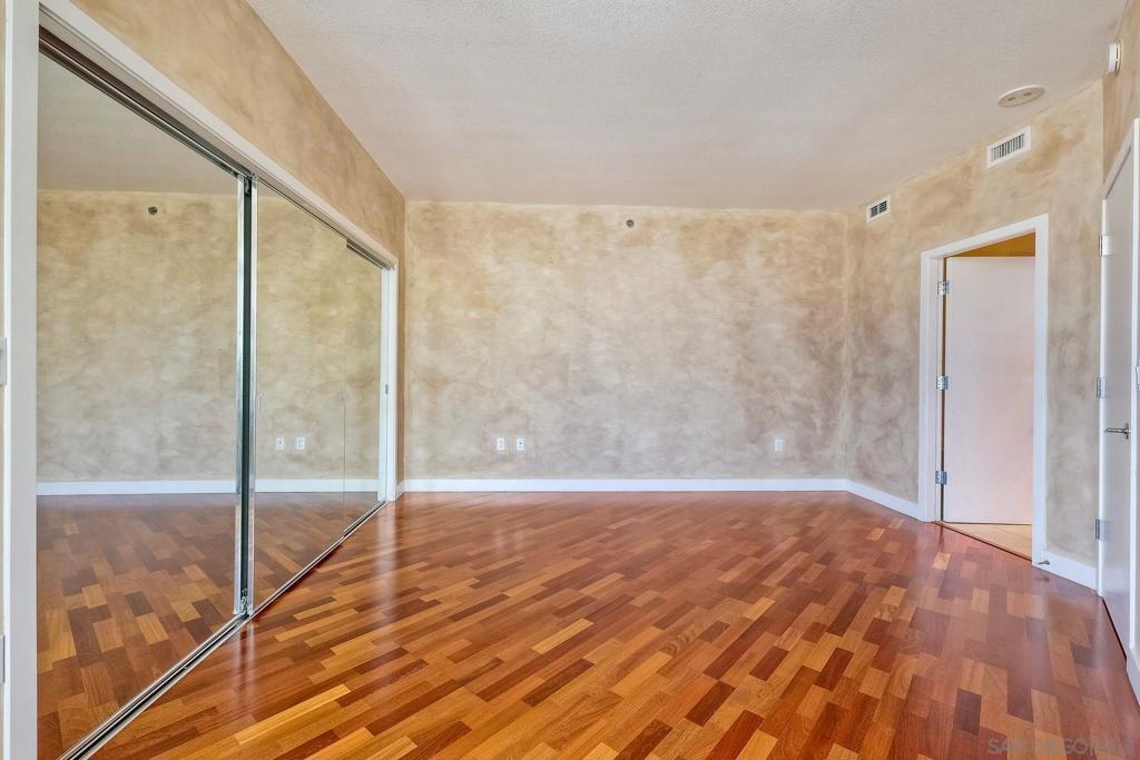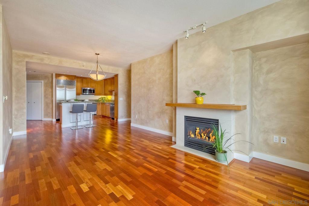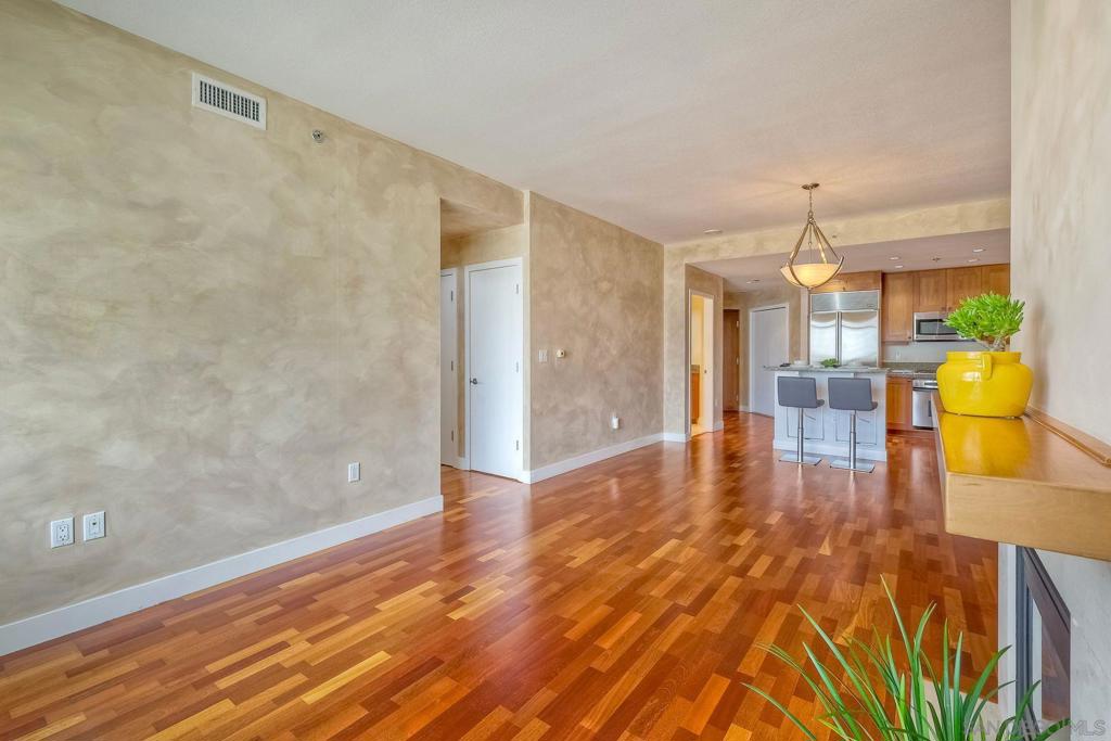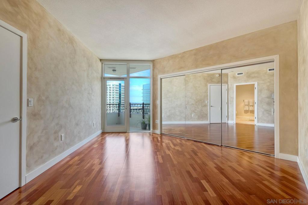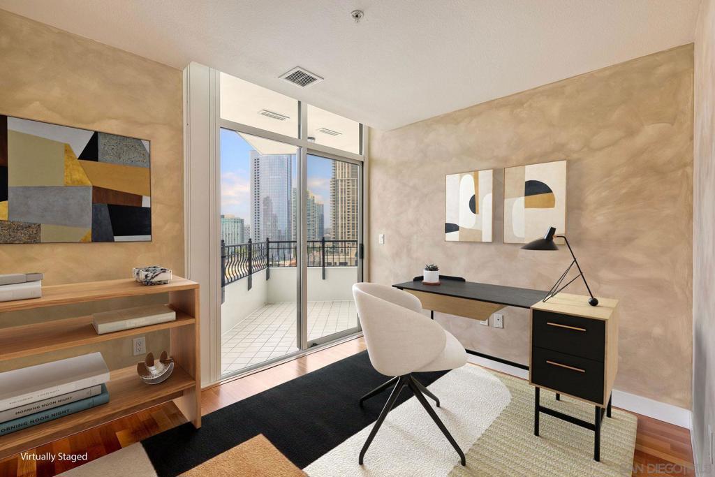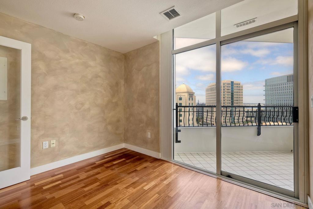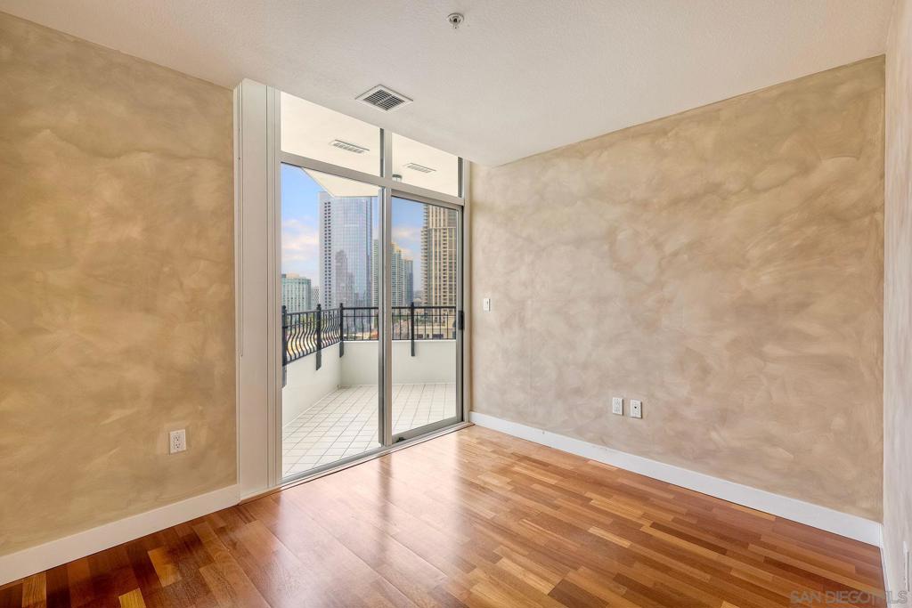 Discover elevated urban living on the 13th floor of Park Place, located in San Diego’s prestigious Marina District. This stunning 1-bedroom + den/office (easily used as a second bedroom) comes with HOA credits and sweeping panoramic views of the bay & city skyline. Inside, this home features elegant cherry wood flooring and custom faux-finish walls throughout the main living areas, bedroom, and den—creating a warm, designer-inspired ambiance. The gourmet kitchen is appointed with stainless steel appliances, a Sub-Zero refrigerator, granite countertops, and a central island with bar seating—ideal for entertaining. The spacious primary suite boasts triple mirrored closets and a luxurious en-suite bath with a soaking tub and walk-in shower. Step onto your private balcony—accessible from both the primary bedroom and the den—to take in breathtaking views morning and night. A second full bathroom provides added flexibility, especially if the den is converted into a guest room or second bedroom. Additional features include two tandem parking spaces, a private storage unit, and access to world-class amenities: a striking lobby, 24-hour concierge, gated security, pool, spa, fitness center, resident lounge, and guest parking. Enjoy resort-style living just steps from Seaport Village, the Convention Center, Petco Park, and Downtown's vibrant dining and nightlife.