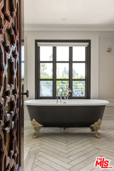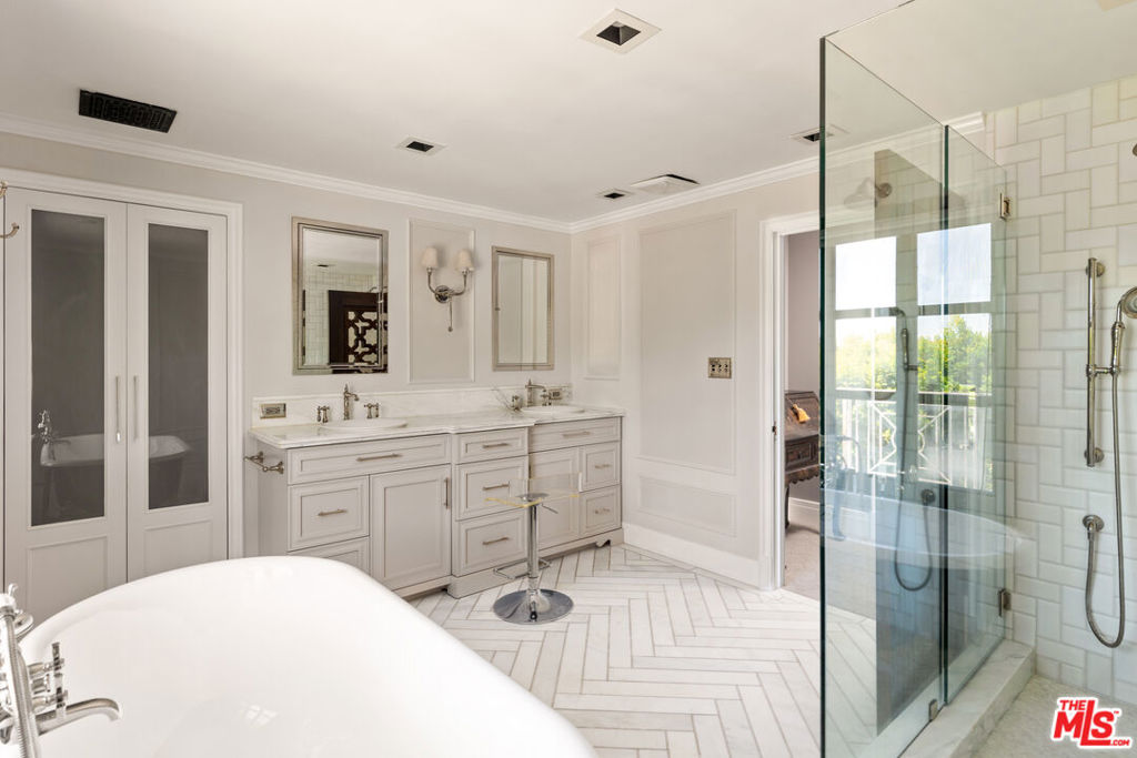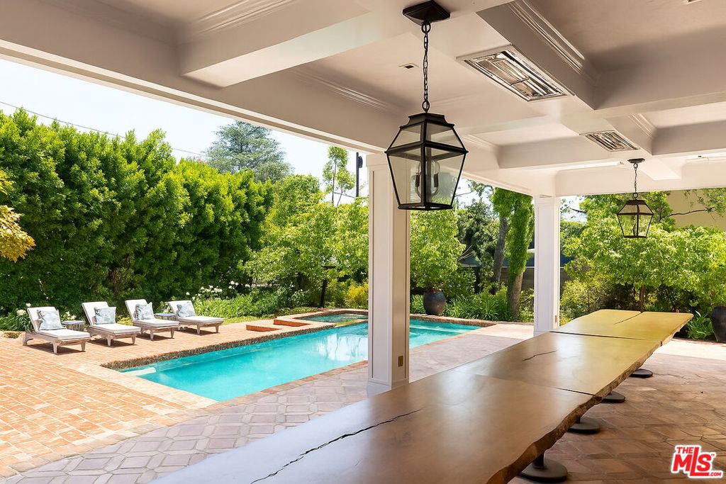 Stunning and fully remodeled traditional estate on almost half an acre in the heart of Beverly Hills Flats, offering 6 beds, 7 baths, and approximately 6,200 sq ft of elegant living space. The main house showcases a true chef's kitchen, a luxurious primary suite with salon sink, expansive closets, spa-like bath, and state-of-the-art amenities throughout. Retractable glass doors open the family room to a lanai that seats 22, seamlessly blending indoor-outdoor living with a lushly landscaped yard, pool, and spa- ideal for entertaining. Five en suite bedrooms in the main residence plus a beautifully renovated guest house with kitchenette, laundry, and bath complete this private oasis. A rare offering on one of the most sought-after streets in Beverly Hills.