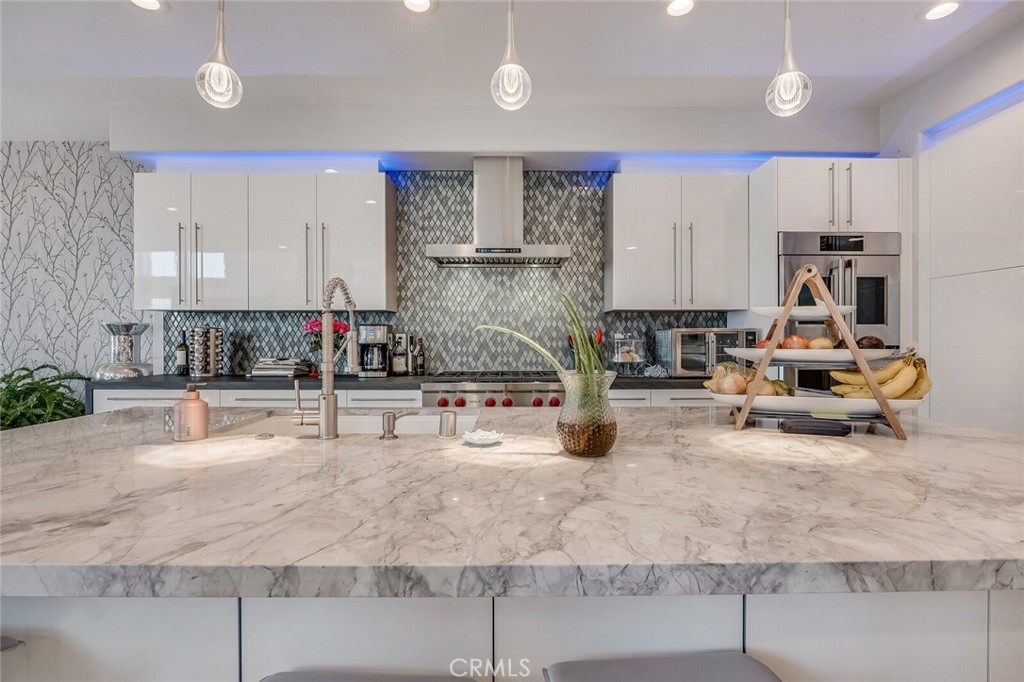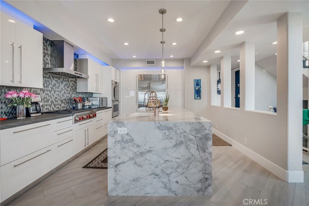Welcome to Lantern Village in Dana Point, where luxury coastal living meets an exceptional walk-to-the-beach lifestyle. This stunning residence boasts unobstructed panoramic views of Catalina Island, the Pacific Ocean, dramatic coastline, and endless sunsets. Floor-to-ceiling windows flood the home with natural light, creating a breathtaking connection to the ocean in every season. Ideally positioned directly across from the coveted Strands Beach Preserve and Salt Creek Beach, the home also offers effortless access to downtown Dana Point, boutique shopping, farmers markets, entertainment, and the newly revitalized Dana Point Marina. Completely renovated, 33737 Chula Vista spans 3,167 square feet and features four bedrooms and three-and-a-half bathrooms, blending refined elegance with coastal sophistication. The open-concept main level is designed for both entertaining and everyday living, showcasing a living and dining area anchored by a striking custom glass-tile fireplace and adorned with luxurious silk Dupioni drapery. The chef’s kitchen is a masterpiece of design and functionality, highlighted by a 10-foot, tailor-made Dolomite stone island—offering the beauty of marble with enhanced durability. Italian high-gloss cabinets, Chef’s double oven, Viking microwave, and Thermador dishwasher—create a culinary space that is both high-performance and effortlessly elegant, perfectly suited to a refined beach-living lifestyle.The dining room features vintage wallpaper sourced from the UK, an Italian chandelier, ocean views, and sliding doors that open to an expansive outdoor deck—ideal for sunset dining.The lower level offers an oversized game and media room with a glass-tile fireplace, a wine room, a full bathroom, and an office or guest bedroom. Sliding doors lead to a tranquil ocean-view patio retreat, seamlessly blending indoor and outdoor living.The second level is dedicated to private living quarters, featuring three bedrooms and two beautifully updated bathrooms. The primary suite is a serene sanctuary with sweeping ocean views, custom wallpaper by Graham & Brown, and a spa-inspired bathroom complete with a soaking tub, floating cabinetry, an oversized marble shower, and a walk-in closet—creating a true Zen retreat. Additional highlights include a new HVAC system . This extraordinary residence offers the perfect balance of luxury, comfort, and coastal lifestyle—an ideal home for multi-generational living and a sophisticated Dana Point beach retreat.