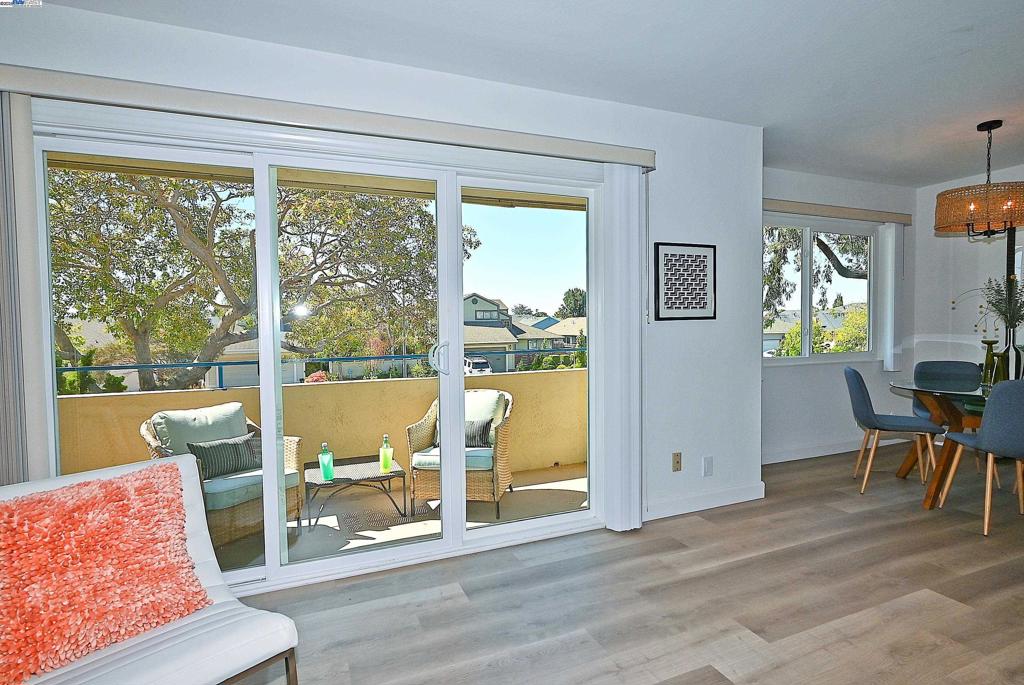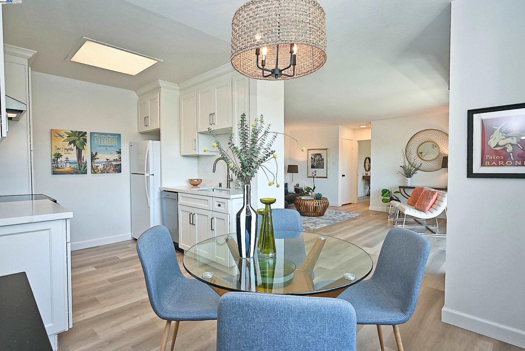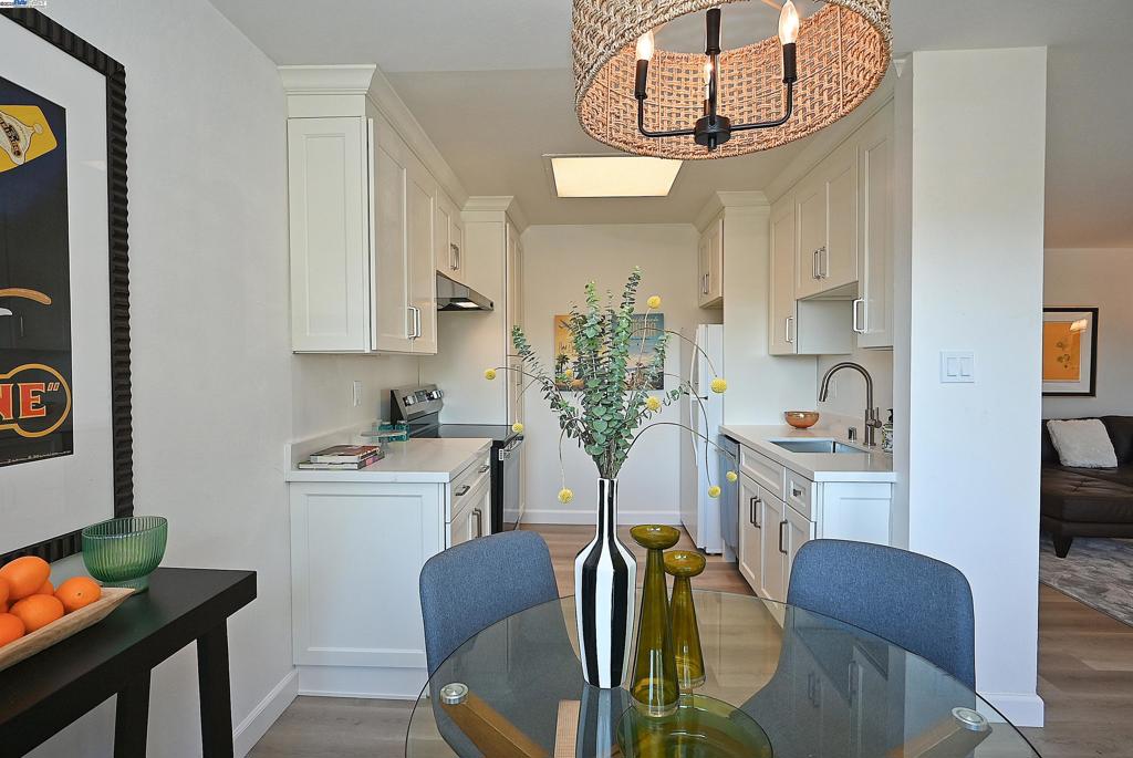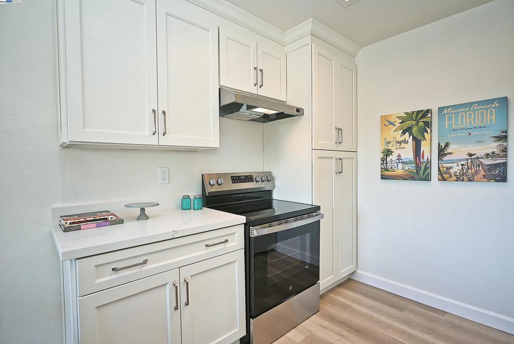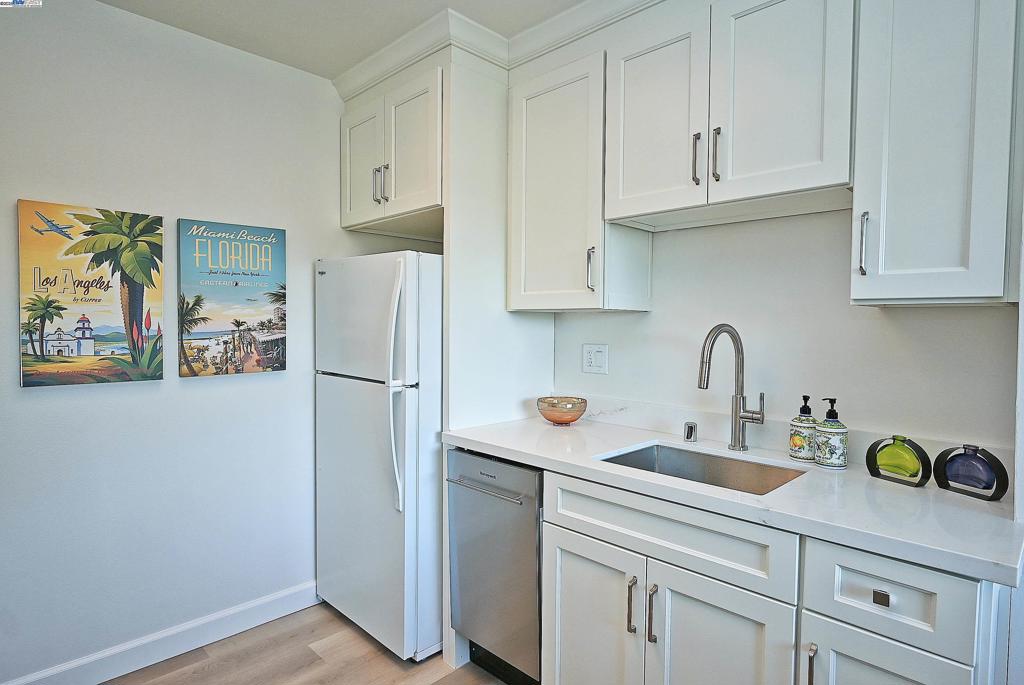 The convenience of condominium living in the heart of Alameda! Beautiful updates to this spacious one bedroom condo include kitchen cabinets, quartz countertops and some new appliances, luxury vinyl plank flooring and fresh paint throughout. Newer dual pane vinyl windows and patio doors with vertical blinds open to a shaded balcony. The spacious bedroom has a generous walk-in closet with built-in vanity. The bathroom features shower over tub, new coutertop, sink, faucet and light fixture. Located steps from South Shore Center, this top-floor unit is close to numerous shopping and dining options while also being a stone's throw from the beachfront, with its walking and biking paths and serene sunsets. South Shore Lagoon Condos boasts two swimming pools, two laundry rooms, and gated parking access. Included with this unit is one deeded carport space.