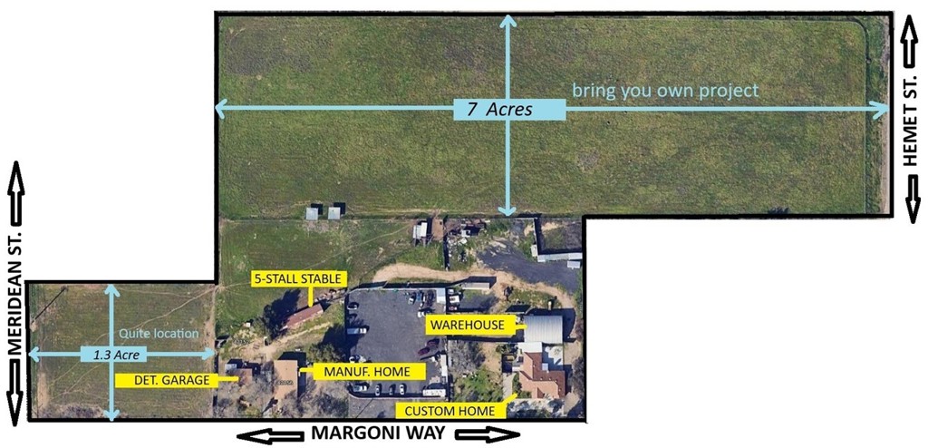 Single Story single level house (4B/3b) on a huge lot (13+ acres) that also includes: 3B/2b manufactured home, large living room, own street address and own electrical and water meters and detached car garage + large metal warehouse (arch style-like a blimp hanger) + 5-stall stable barn with office space with water connection + 1.3 vacant corner lot with water and electrical connection. Soon to be installed on the main house: 24+KW solar panels + 2 Tesla whole home backup batteries. Horse property. Seller already submitted initial application for subdivision. Bring your own custom project. Buyer & buyer's agent to do their own due diligence/ investigations to verify all info w/the city or county for allowable uses, requirements & rely on their own investigations.