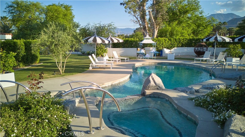 Exclusive Historic California Ranch Estate with Panoramic Mountain Views! Behind private gates and past a charming horse corral, sits this extraordinary California ranch home that offers a rare blend of privacy, luxury and location. This property is a short walk to the iconic Empire Polo Grounds, home of the world-famous Coachella Music Festivals and to the area's local shopping and dining. At the heart of the estate is a 2500 sq ft elegant one-bedroom main residence. A separate five-bedroom, five-bathroom guest house with a large central living room and a kitchenette offers spacious accommodations for family and guests, creating a private, resort-like retreat ideal for entertaining or serene desert living. Both the main house and the guest house were taken down to the studs and completely rebuilt to the highest standards. This estate blends classic California ranch style with modern comfort, featuring airy, open living spaces and exceptional attention to detail throughout. There is a bonus room, the walk-out basement under the guest house that could be used as an office or a massage room. The home and the separate five-car garage are set on two beautifully landscaped acres. This property boasts breathtaking views of the Santa Rosa Mountains of La Quinta and to the north, the expansive peaks of Joshua Tree National Park. Whether day or night, the surrounding natural beauty creates an awe-inspiring backdrop to daily life. Offering both seclusion and convenience, this prime location provides easy access to the best of the Coachella Valley and surrounding cities, all while delivering a sense of calm and exclusivity rarely found. This is a one-of-a-kind opportunity to own a designer-renovated estate with panoramic mountain views and resort-style living in the heart of Southern California desert. Home is available turnkey furnished.