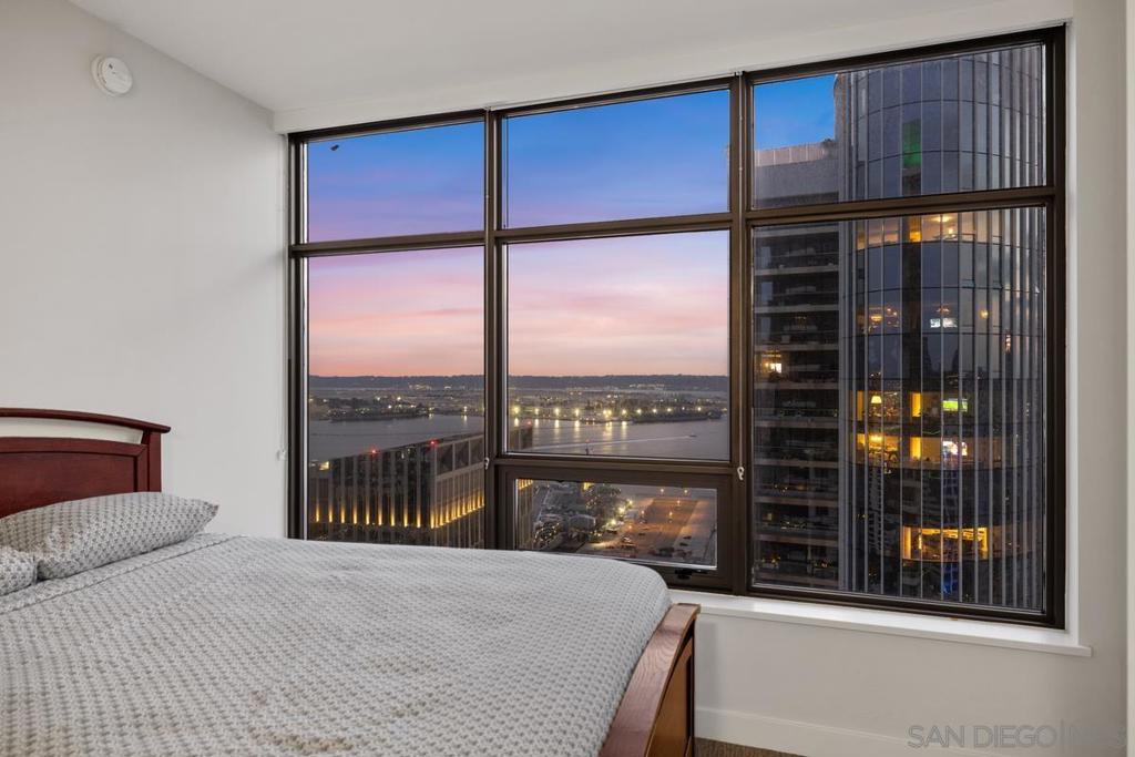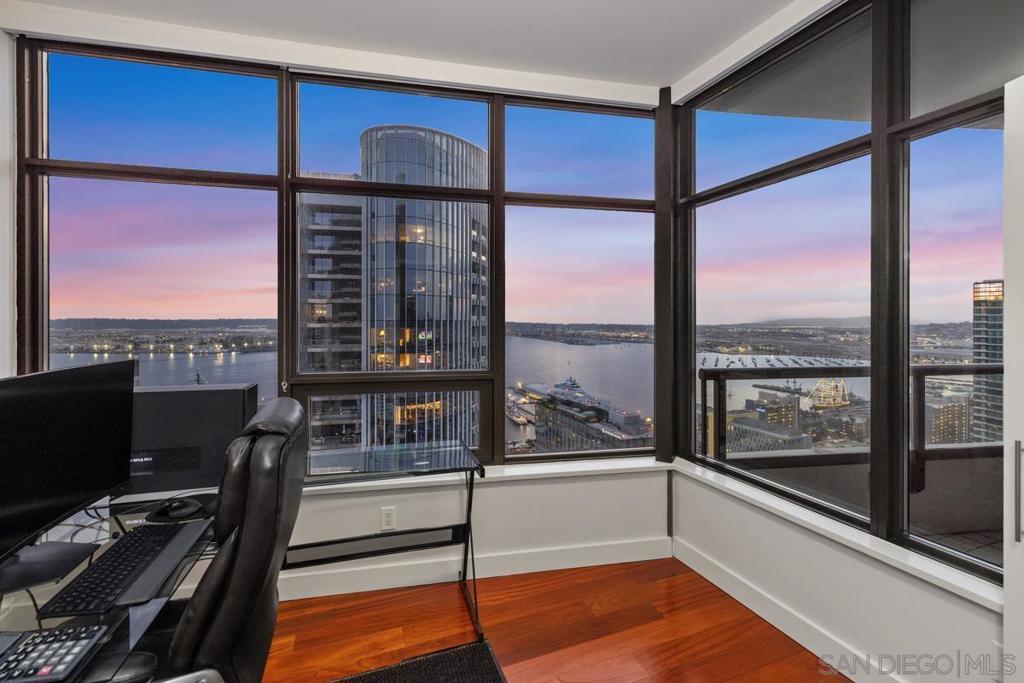Behold a one of a kind exclusive retreat, perched majestically on the 35th floor of the iconic Electra, high above San Diego’s vibrant heartbeat. This coveted northwest-corner residence unveils a sweeping panorama of the bay and city skyline, as though the horizon itself were framed just for you. Step inside—and be captivated by lustrous Cherry hardwood floors that flow beneath expansive windows, flooding every room with radiant daylight. A cozy fireplace infuses the space with soft warmth and an intimate ambiance. Two balconies beckon—the western terrace your private stage for nightly sunset dance over the bay. Culinary artistry awaits in your gourmet kitchen, outfitted with stainless-steel Bosch and Thermador appliances, polished granite counters, and a chic breakfast bar perfect for casual gatherings. Outside your front door, the excitement of downtown life is yours to embrace—just a short stroll to Waterfront Park, Seaport Village, and the eclectic energy of Little Italy. Here, luxury is not an afterthought—it is a way of life. A dedicated concierge attends to your needs, serene steam room, resort-style pool and spa, and fully equipped fitness center await your indulgence. On the tranquil 5th floor, Electra Park and BBQ terraces offer serene garden escapes amidst the urban hum with two parking spaces flanking a built-in EV charging station and a private storage. Ascend to new heights—experience life among the clouds in a residence that effortlessly elevates luxury and lifestyle into one sublime experience. Must see!