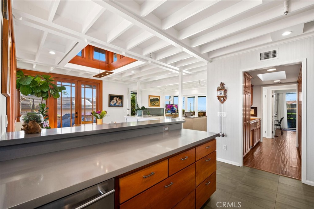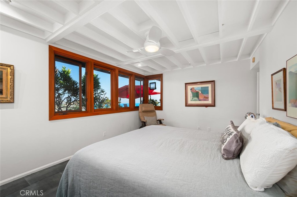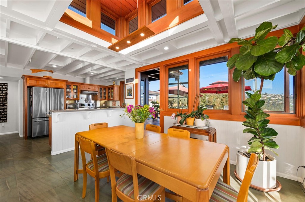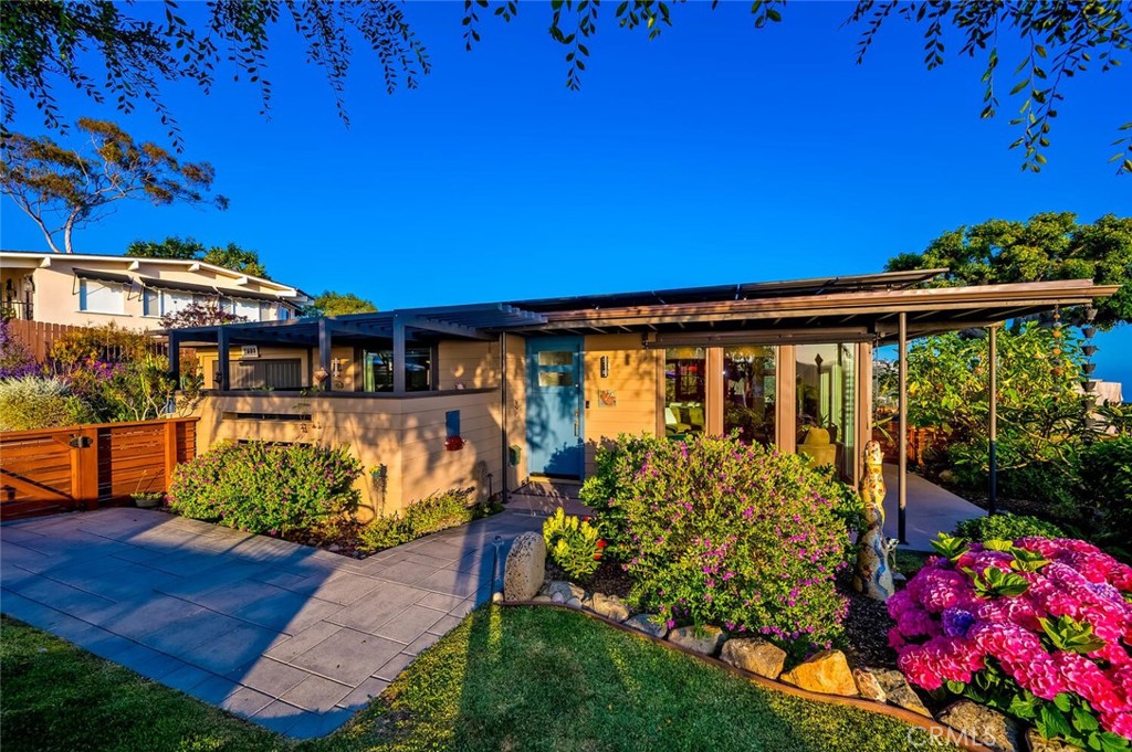 Perched above the pristine coves of laguna beach, this mid century modern masterpiece echoes the timeless influence of early Frank Loyd Wright design. With iconic post-and-beam construction and dramatic walls of glass, the home is thoughtfully positioned to capture sweeping ocean and canyon vistas from every angle. This single level, two bedroom two bath retreat has been beautifully remodeled to blend classic architecture with modern comforts. New floor to ceiling windows and elevated skylights flood the space with natural light, while lush landscaping and panoramic views create a seamless indoor outdoor living experience. Set on nearly 10,000 square feet of flat, useable land, the home offers privacy, serenity, and room to grow-complete with architectural plans included in the sale and potential for an ADU. Inside, a chef's ocean view kitchen flows effortlessly into the open plan living and dining rooms, grounded by rich wood flooring, and elegant stone surfaces throughout. Step outside onto the expansive wrap around deck, where a gentle breeze and post card worthy sunsets await. Cozy up by the wood burning fireplace as day turns into night and the coastline begins to glow. Whether you're seeking a peaceful retreat, an entertainer's dream, or a foundation for future expansion, this one of a kind architectural jewel delivers it all.