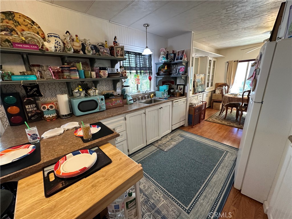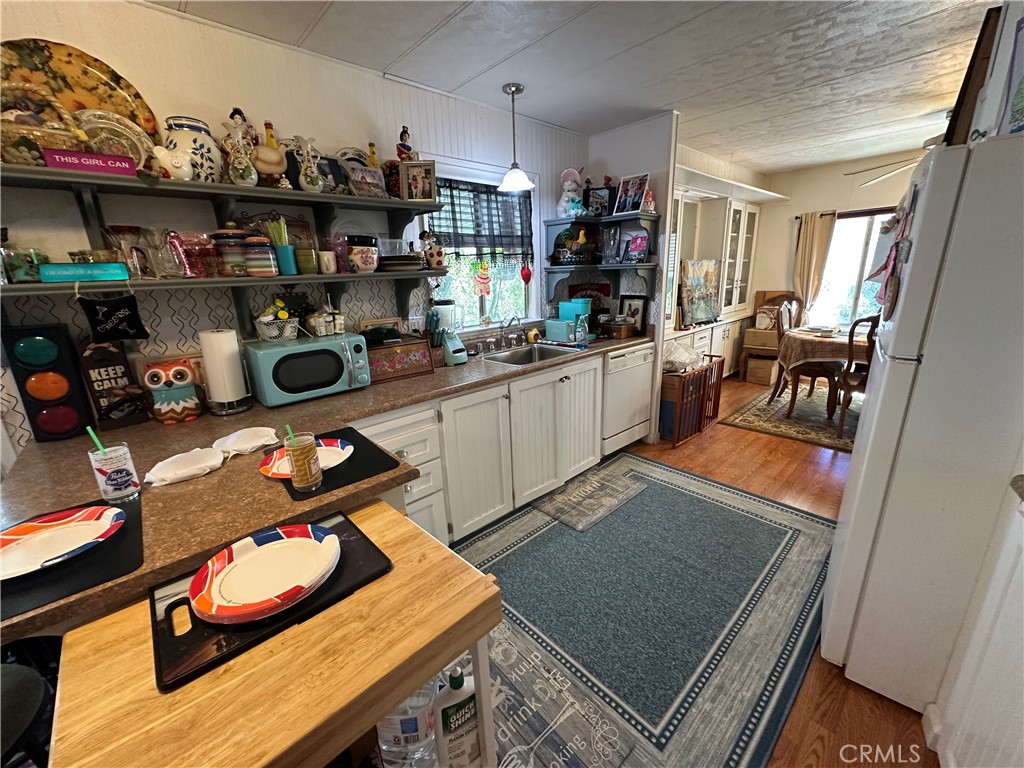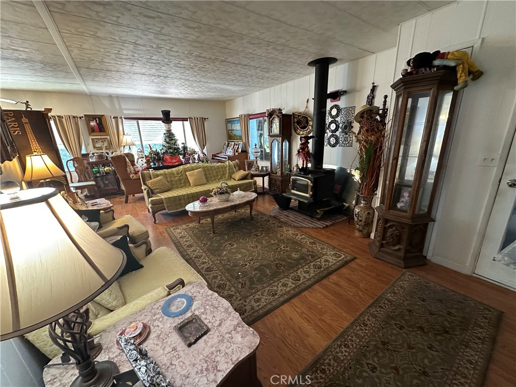 Tranquil park like setting. This manufactured home looks out to open space with views of Mt Konocti. Large open living room with wood burning stove. Large covered deck that leads to the landscape yard on the side. Primary bedroom has a separate deck and entrance. Covered carport with a workshop that has electricity and a heater. Separate storage room. All of this on its own land.