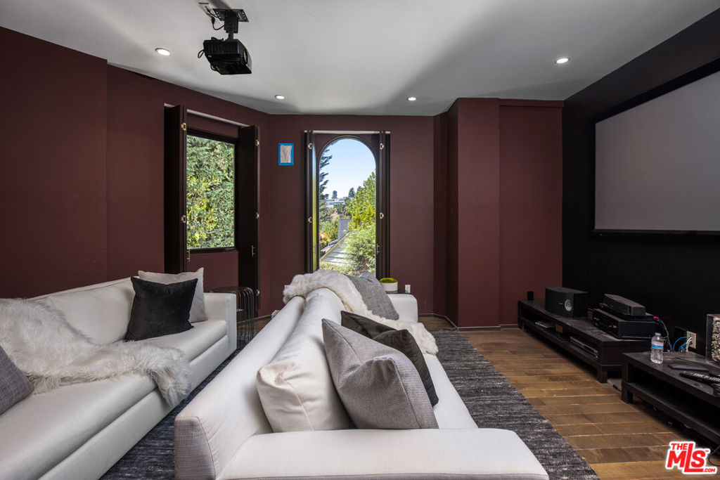 Nestled on a quiet cul-de-sac just minutes from the iconic Beverly Hills Hotel, this European-style contemporary offers sleek sophistication across four light-filled levels. With 4 bedrooms, 4.5 bathrooms, and 3,744 square feet of thoughtfully designed living space, the home seamlessly blends elegant form with everyday functionality. The main level features an open-concept floor plan with warm hardwood floors, recessed lighting, and walls of glass that frame serene treetop and canyon views. The expansive great room includes two sitting areas, a gas fireplace, and a chic dining area that flows effortlessly to a sun-drenched terrace perfect for indoor-outdoor entertaining. The sleek kitchen is equipped with stainless steel appliances, a large center island with bar seating, and ample natural light from oversized windows. Upstairs, the spacious primary suite is a tranquil retreat with a private balcony, fireplace, large walk-in closet, and spa-like bath. Two additional ensuite bedrooms complete the top floor. The lower level offers a private bedroom and bath, laundry area, and a stylish screening room perfect for movie nights or entertaining guests, all on the same floor. The level below includes storage closets and a spacious 3-car garage. Outdoors, the backyard offers a peaceful escape with a sparkling pool, spa, and cascading waterfall surrounded by lush greenery. Whether as a full-time residence, a pied-a-terre, or an investment with a strong rental history, this Beverly Hills gem offers elevated living in a coveted location near hiking trails, world-class shopping, and fine dining.