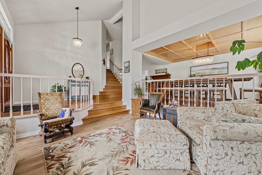 Nestled in the gated community of Cielo Vista in Hollister, this spacious home sits on an expansive 24,302 sq ft lot with room for your RV, trailer, or boat. The thoughtfully designed floor plan offers two separate living areas, a formal dining space, an eat-in kitchen, and a 3 car garage. High ceilings greet you in the entry and main living areas. The U-shaped kitchen features granite countertops and a garden window overlooking the generous half acre lot. A ground-floor bedroom and full bath provide ideal flexibility for guests, multi-generational living, or a home office. Downstairs also has a wet bar and laundry room with sink. Upstairs, the owners suite includes 2 walk in closets, a soaking tub, and a separate shower. Two additional bedrooms, a full bathroom, and a den with a covered patio and laundry chute complete the upper level. Three fireplaces located in the owners suite and both living rooms, while central air conditioning ensures year-round comfort. The 3 car garage is finished with epoxy flooring and some built in shelving. Conveniently located across from the new Gavilan College campus and Ridgemark Golf Club, this property also offers ADU potential based on lot size and orientation.