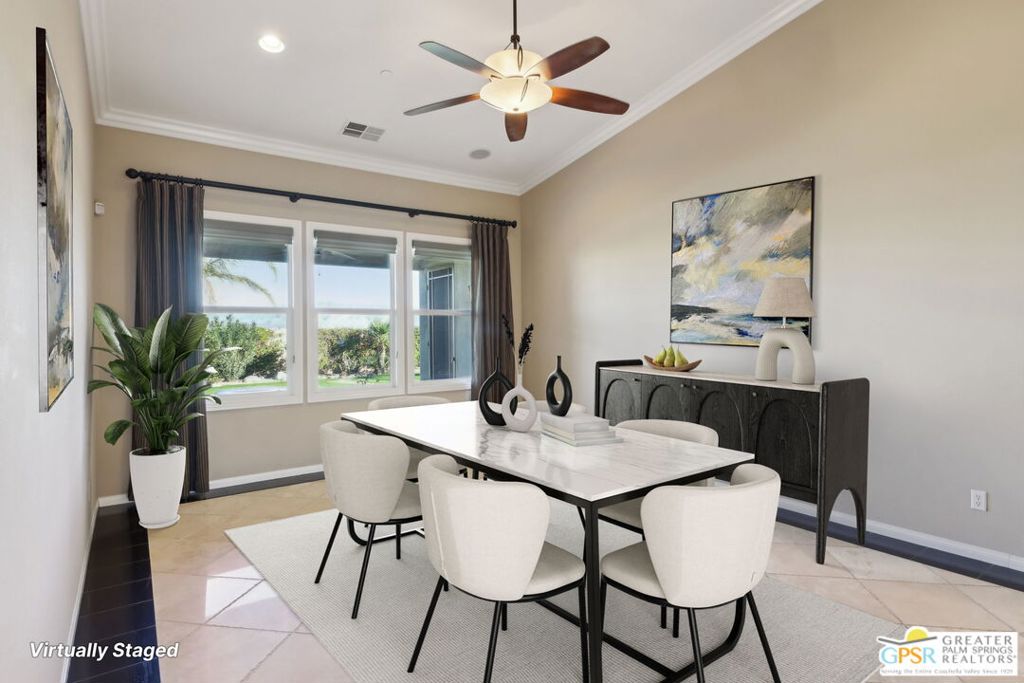 This well-appointed home - located at the end of a cul-du-sac - is the highly-upgraded Canyon 3 model, with 2,825 square feet of living space. It's the largest floor design within the community, and it's perfect for an elegant but relaxed lifestyle. Located on the west side of Four Seasons, a gated active 55+ community, this home offers a large lot with even more potential for an owner's added touches (including ample still room for its own private pool and spa). The home is surrounded by natural desert scenery - including the backdrop of the Chocolate Mountains, the San Jacinto Mountains and the Little San Gorgonio Mountains - within a sweeping,180-degree view from the backyard. Other touches include wired flush-mount ceiling speakers; a central vacuum system; 2 (two) electric-start gas fireplaces; and tons of storage space. There is much upgraded interior finish work throughout, including travertine, granite, and marble flooring, marble countertops, wainscoting, marble fireplace surrounds, and counter, vanity, and shower backsplashes with tile inlays. There are also vaulted ceilings in the living, dining, and master bedroom, and high ceilings with crown moldings throughout the home. The rear facade has a covered veranda for outdoor lounging or dining, featuring a well-placed fire pit to sit around and enjoy beautiful Palm Springs nights. The community of Four Seasons is gated for both security and privacy, and offers many activities for its homeowners, including walking and biking trails, sport courts, tennis courts, pools and spas, and a large community center lodge with exercise rooms and fitness equipment, library, meeting rooms, and a well-knowledged staff. This home - and Four Seasons, in Palm Springs - is a great place to call home.