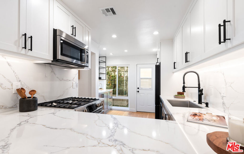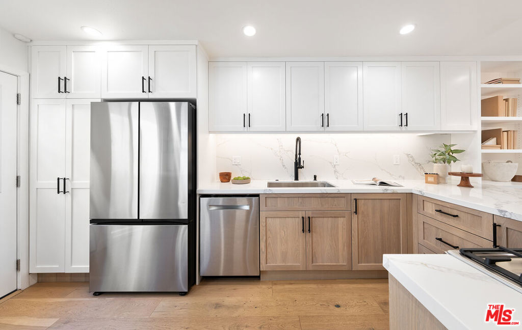 Stunning Designer Townhome, Full Custom Remodel in the Heart of Santa Monica. Discover this stunning and luxurious 3-bedroom, 2.5-bath designer townhome, fully reimagined with a complete custom remodel. Every inch has been thoughtfully curated with high-end finishes, blending modern elegance and functionality in a way that feels like your own private single-family home. Set within the esteemed Santa Monica-Malibu School District (Roosevelt Elementary, Lincoln Middle, and Santa Monica High) this residence is part of a charming, well-maintained, and lushly landscaped 7-unit complex with low HOA dues. Ideally located on a tree-lined street, you'll enjoy walkable access to all of Santa Monica's best offerings: boutique shopping on Montana, dining on Wilshire, Reed Park, Piper Preschool, the Fairmont, Rustic Canyon, Santa Monica Seafood, and of course, the Pacific Ocean just moments away. Inside, no expense was spared. The home showcases stunning hardwood floors, a gourmet custom kitchen with Bosch appliances, extensive built-in custom cabinetry, and sophisticated luxury lighting throughout. Spa-inspired bathrooms, two cozy fireplaces, and a library-style dining room add both comfort and character. With over 1,500 sq. ft. of living space, natural light floods through the home, highlighting its seamless indoor-outdoor flow. Multiple outdoor retreats invite year-round enjoyment of the coastal breeze including a private rooftop deck with sweeping city and mountain views, and additional patios with pet-friendly turf and upgraded drainage. The attached, direct-entry two-car garage features epoxy flooring and new custom storage cabinetry, making organization effortless. Outdoor storage cabinets and thoughtfully designed spaces add even more convenience. This rare townhome embodies the very best of Santa Monica coastal living: designer craftsmanship, a walkable beachside lifestyle, and a tranquil retreat in the heart of the city. Highlights: Full custom remodel with designer finishes throughout. Bosch high-end appliances & gourmet kitchen with custom cabinetry. Luxury lighting fixtures & extensive built-ins for maximum storage. Two fireplaces and over 1,500 sq. ft. of light-filled living space. Private rooftop deck with mountain & city views. Direct-entry 2-car garage with epoxy floors & built-in cabinetry. Located in the Santa Monica-Malibu School District, minutes to Montana Ave., Wilshire, Reed Park, brand new Equinox gym with rooftop pool, new Vons, Promenade, The Proper Hotel, and the beach