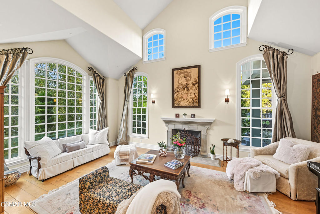 Elegant Country French Estate in Prestigious Medea Valley nestled atop a privately gated knoll. Masterfully built with the finest materials including designer tiles from famous Mission Tile Co. Sweeping mountain and valley views are the backdrop to classic elegance with modern amenities. The community security gate ensures exceptional privacy and a peaceful retreat. Upon entry, you're greeted by soaring ceilings and expansive windows in the Formal Living Room, while the spacious Dining Room features a graceful bay window ideal for entertaining. The heart of the home is the open-concept Family Room, Kitchen, and Breakfast Nook. The gourmet Kitchen includes a prep island, Viking appliances, walk-in pantry, white cabinetry, and generous counter space. The sunlit Family Room offers a built-in entertainment center, fireplace, and French doors leading to a charming patio with built-in BBQ. A downstairs Bedroom with custom office cabinetry provides a flexible workspace and a private bath. Upstairs, the luxurious Main Suite features a fireplace, sitting room with private veranda, dreamy walk-in closet, and a spa-like bath with soaking tub. French doors open to a large balcony that overlooks the pool and serene mountain vistas. Completing the upstairs are 3 additional bedrooms and two well-appointed baths plus an amazing 500 sq ft Bonus Room with fireplace and private exterior entry. The beautifully landscaped grounds include a private orchard with apple, peach, plum, and lemon trees, a pool and spa, expansive deck with beautiful views and a park-like playground. Recent upgrades include a new HVAC system and remodeled pool with new equipment.Additional highlights: Oversized three-car garage with custom cabinetry, 108 sq ft potting room/studio or storage, EV-ready with separate meter and hookup.Private community access to hiking trails in the Santa Monica Mountains Preserve and Paramount Ranch. Medea Valley Estates is just five minutes from the 101 freeway and offers convenient access to schools, fine dining, wineries, shopping, and Malibu beaches. A rare blend of privacy, luxury, and location--this custom-built estate is truly one of a kind.