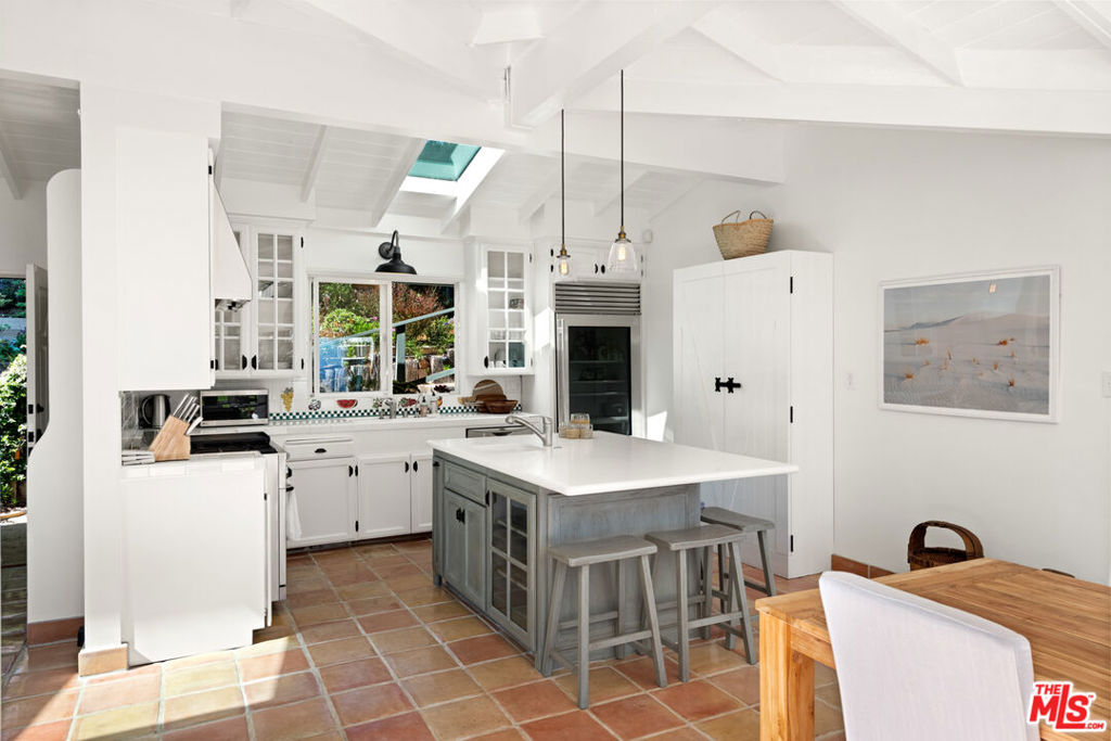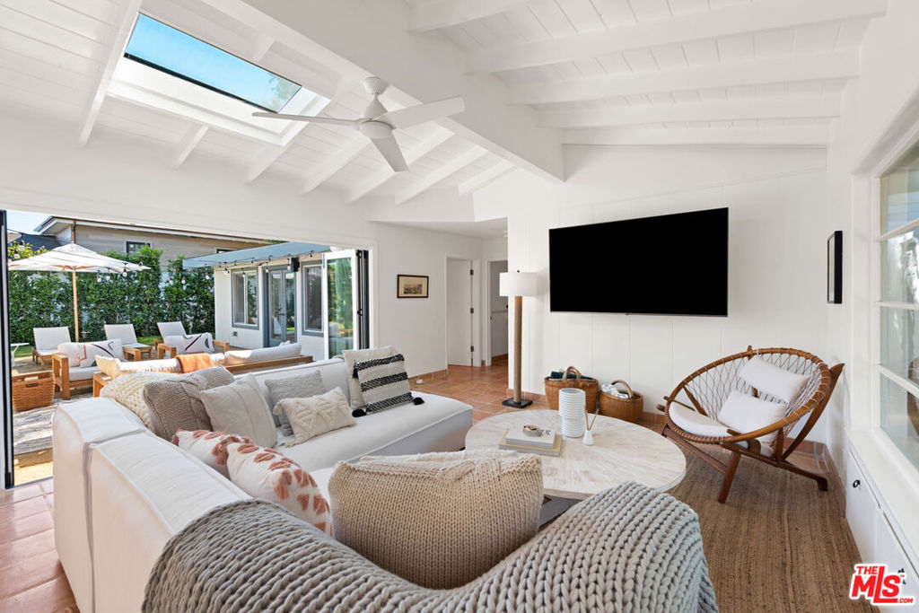 With mid-century pedigree and lush natural light, this beautifully updated garden home is perfectly appointed for indoor-outdoor living and entertaining. Gated and private, with handsome mature trees and generous lawns and patios, the property includes homeowner rights to a private sandy beach. Detailed with plank and beam ceilings, large windows, and Saltillo tile floors, the two-bedroom main house is complemented by a separate guest house with an additional bedroom, bath, and kitchen. At the heart of the main house is a light-infused great room that features a comfortable skylight living room, a chef's kitchen, and huge glass doors that open to the backyard, ocean views, and a large all-weather dining pavilion. The skylight kitchen has a center island with bar seating, top-quality appliances, beautiful cabinetry, and a wide garden window above the counter and sink. The bedrooms include a very peaceful primary suite with a large walk-in closet, a skylight bath, and French doors that open to the backyard. The guest suite, with a private entry from the street, has been updated with the same care and quality as the main house and features a full kitchen, a bedroom and bath, a living/dining room, and a balcony with sensational ocean views. The backyard, in addition to the dining pavilion, has a dining pergola, a large lawn, and various areas for lounging and entertaining, plus there is room for a pool. The home also has a two-car garage as well as guest parking in the driveway and on the street. With easy access to beaches, shops, dining and miles of hiking and biking trails, this Broad Beach home is the perfect year-round getaway.