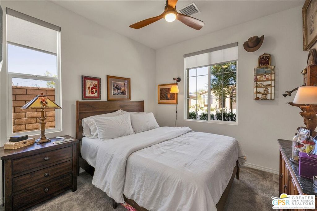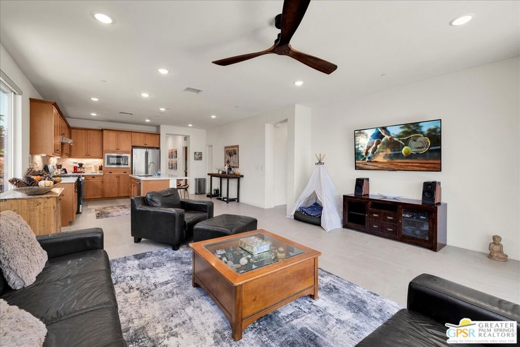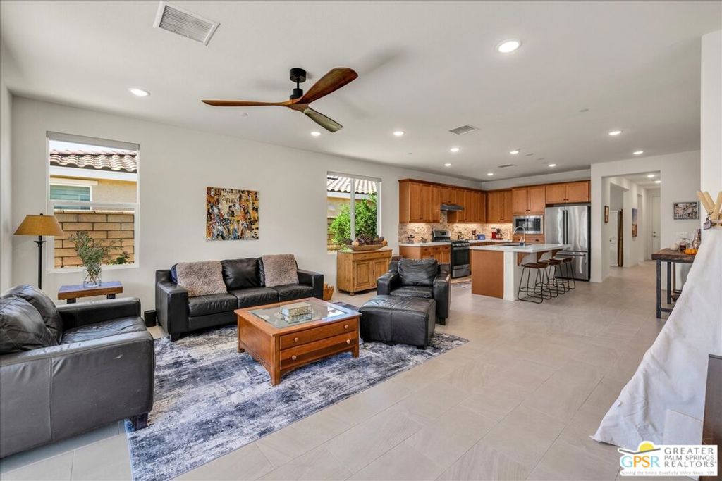 Price reduced to $429,900 and sellers are motivated. This is a sweetheart of a deal and an opportunity you can't miss with all the upgrades already in place. Exceptional value in Four Seasons at Terra Lago with fully owned solar (over $25,000 paid in full) delivering significant energy efficiency and long-term savings. Located in a premier 55+ gated resort-style community with beautiful mountain views, this move-in ready home offers 2 bedrooms plus a den/office for flexible living. The open-concept floor plan features tile flooring, a spacious kitchen island, upgraded cabinetry, elegant countertops and backsplash, stainless steel appliances, built-in microwave, and walk-in pantry. Enjoy IID electric service, low-maintenance desert landscaping, and a covered patio ideal for relaxing or entertaining. The attached garage includes golf cart parking and overhead storage racks. Built in 2022, this home blends modern design with energy-smart living. Conveniently located near Acrisure Arena, shopping, dining, and a public golf course with no membership required. Community amenities include clubhouse, pools, spas, fitness center, pickleball, shuffleboard, and an active social calendar.