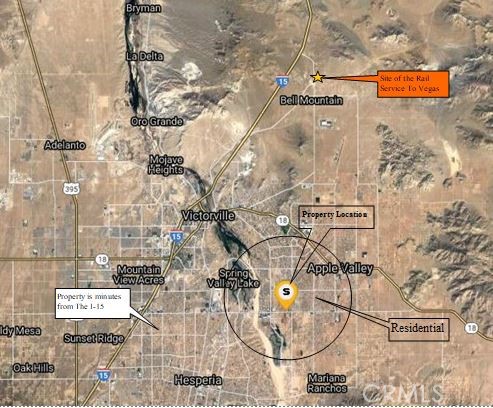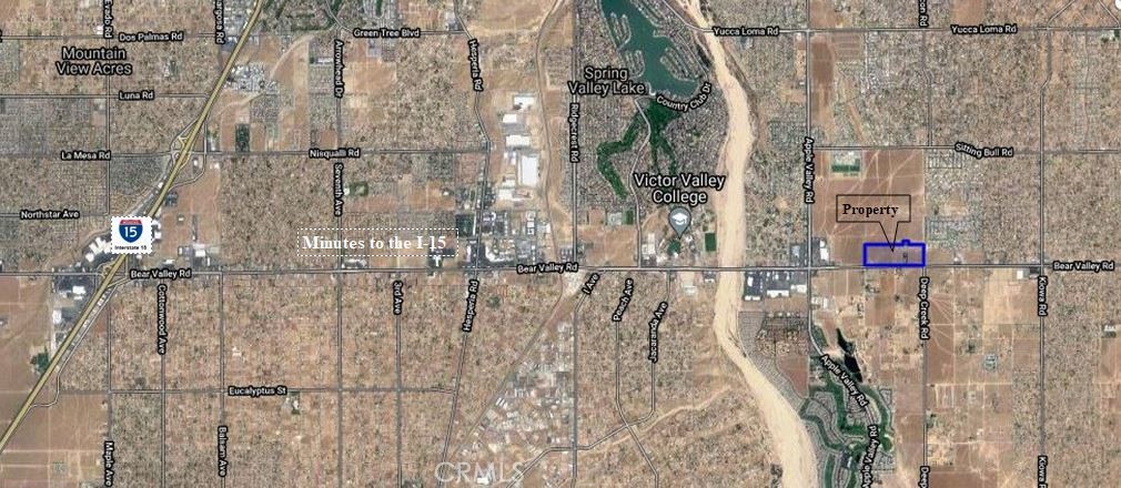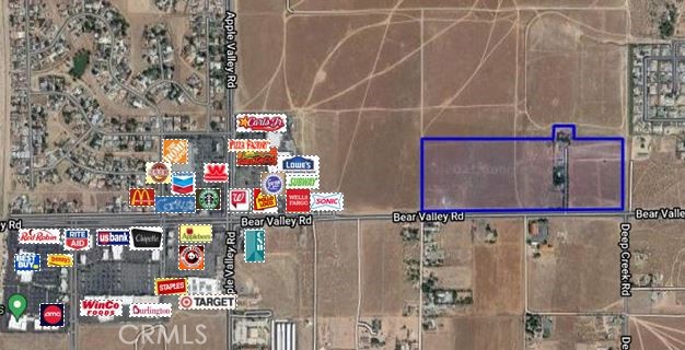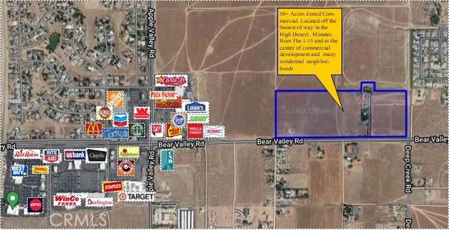 Price Improvement!!!!! Location, Location, Location. Opportunity for Commercial Development. This property is zoned general commercial. Approximately 56.72 acres with over 1/2 mile frontage on Bear Valley Road along with sewer. This property has a well and comes with 13 acre ft of water rights. Close to new development. Three income producing rentals on property, House 1 - 2 bedrooms and 2 baths approximately 600 sf, House 2 - 2 bedrooms and 2 bath approximately 1,200 sf, house 3 - 4 bedroom and 2 full baths approximately 3,000 sf. Sprouts had its grand opening. Coming soon within in minutes from this property is Hobby Lobby, Marshals, Raising Canes, 5 Below and more. Bear Valley Road is the way to Johnson Valley where there is the yearly King of The Hammer and lots of off road events all year. Within a 15 minute drive time, Bright Line West Train on Dale Evans and the I-15.