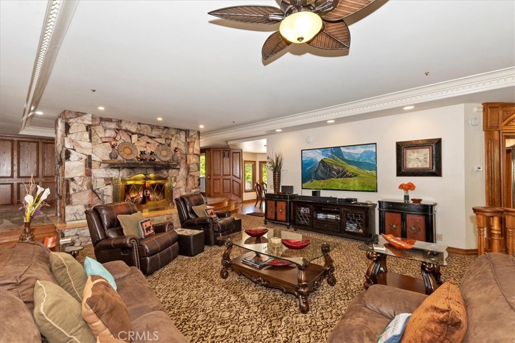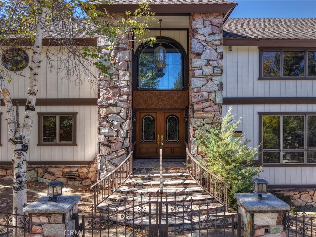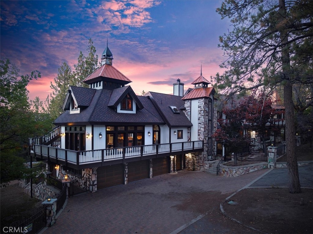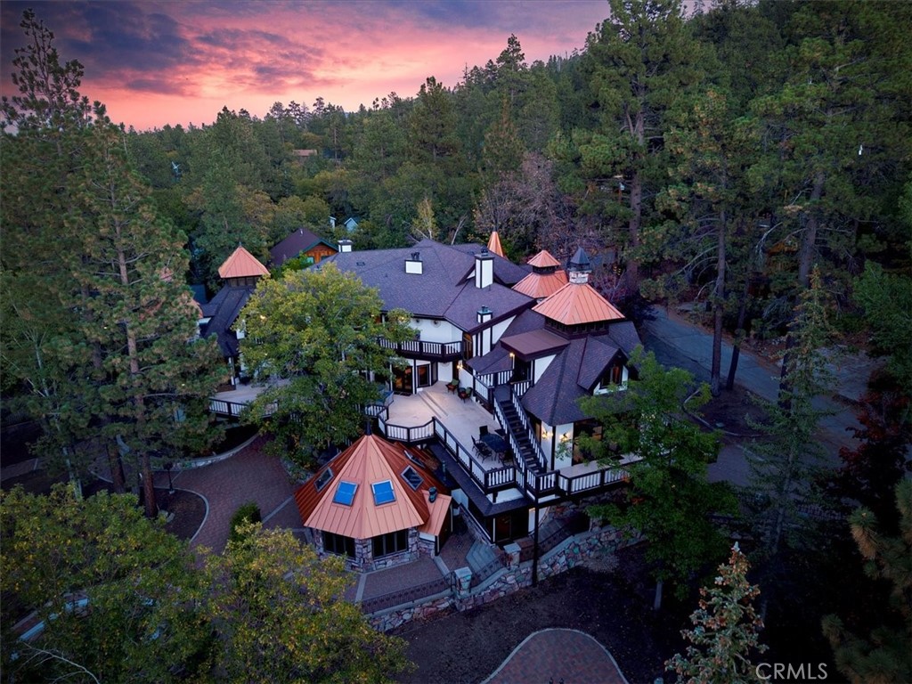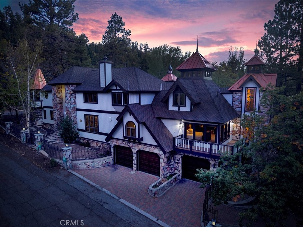 Tucked away in Big Bear’s coveted Village area, this unexpected Tudor-style estate is like no other — a private compound offering unmatched craftsmanship, serenity, and grandeur on nearly two acres of park-like grounds. Behind its gates lies your own private forest of towering pines and manicured pathways leading to charming gazebos, arched bridges, barbecue pavilions, and a turf sports court framed by the two-bedroom guest house. The main residence spans over 10,000 square feet across three levels, designed for both entertaining and peaceful retreat. On the lower level, an indoor rock grotto spa with its own bar sets a resort-like tone, complemented by a gym, sauna, and wine cellar. The main floor invites gatherings with a game room and full bar opening to a wraparound balcony and extensive outdoor patio. There is a spacious family room with a double-sided stone fireplace, a formal dining room, and a grand kitchen built for culinary inspiration. Also on this level are a private mother-in-law suite, an additional guest suite, 2 guest bathrooms, laundry room and walk in butlers pantry. The focal point of the entry, a sweeping circular staircase, leads to the upper level where the primary suite and retreat anchor the floor, along with two additional bedrooms and a stunning family room crowned by vaulted wood-beam ceilings. You will also find a richly detailed den with handcrafted beamwork surrounding the fireplace — currently used as a bedroom, though perfectly suited for a library or private study. The guest house, equally inviting, offers two bedrooms and its own living spaces ideal for extended family, staff, or short-term rental use. Suitable as a primary residence, vacation retreat, or legacy family compound, Edgewood Mansion is also an exceptional investment opportunity — with its scale, layout, and proximity to the Village, the lake and ski resorts offering potential for transformation into an exclusive event venue or continue its use as a luxury rental destination. Having been recently refreshed with thoughtful updates, including a brand-new 50-year fire-rated Presidential roof, new exterior doors, upgraded heaters, Trex decking and fresh exterior paint. This rare estate combines the timeless charm of Old-World architecture with modern livability, delivering a lifestyle that is both storybook and spectacular.