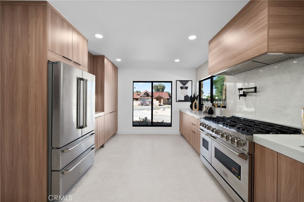 This 1959 mid century newly designed home in sought-after South Palm Springs is waiting for its new owners after being transformed! Enter through the wood front door and enter your large living room with fireplace, high ceilings, and aluminum bi-fold doors across the back of the living room leading you to the backyard where you will be greeted with a fully remodeled pool, backyard, and large covered patio to enjoy the outdoors and mountain views. Off the pool area is a large primary suite with a large walk in closet, a primary bathroom offering a curbless walk in shower, and separate soaking tub. On the other side of the home you will have the privacy of 3 additional bedrooms including one more primary suite with a walk in closet and curbless entry shower. The kitchen boast of frameless soft close cabinets, quartz countertops, and Z Line appliances. The home offers tons of natural light through the new construction aluminum double pane windows. The main home offers a powder room for guest and an additional bathroom with curbless shower for the additional guest and bedrooms. A private separate laundry room. This home combines mid century bones with updated organic modern design and earthy tones. The home offers Tesla paid off Solar, No land lease, privacy of a corner lot on a cul-de-sac, new roof, new HVAC, new plumbing, new electrical, new landscape and sprinklers, and so much more. Just minutes from downtown Palm Springs, Shopping, and Dining. Make this home a permanent residence, secondary home, or rental. Don't miss this opportunity to own this modern gem.
