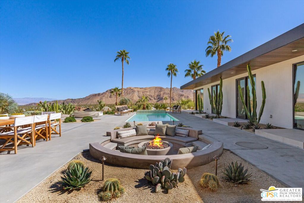 Sometimes, when presenting a property to market, there are so many exceptional features that it's hard to know where to begin, and this renovation just completed in 2025 is a perfect example. In this case, every aspect of living and entertaining at home has been thoughtfully considered, with a design that not only embraces but becomes one with its natural surroundings. For starters, the site itself is breathtaking, a spectacular setting that elevates this L-shaped modern home above the desert floor, offering seemingly endless mountain views and dramatic city lights. The architecture is deeply connected to the landscape, seamlessly integrating with the rugged terrain that so profoundly inspired the principles of desert modernism. This is a home that doesn't just sit on the land, it belongs to it. Inside, the open floor plan is an architectural dream, featuring an "invisible" kitchen with a large island and a striking natural stone wall. The interiors create a tonal and textured atmosphere, seamlessly blending organic materials that bring warmth to the modern aesthetic. Every detail has been designed to honor the desert environment, from the earthy color palette to the strategic placement of glass that frames nature like artwork. A hidden butler's kitchen sits behind the great room, with a galley of counter space and storage leading to what may be the most incredible laundry/mudroom we've ever seen. The integration of style and function throughout the home is next-level. On the other side of the house, a long hallway connects three ensuite guest bedrooms, a spacious den/media room, a gym, an office, and a powder room. A spa-style bathroom, complete with a steam shower, serves both the gym and the pool. And at the very end of this wing? The crown jewel: the primary bedroom suite. Wrapped in glass with a see-through fireplace and perched dramatically on the edge of the mountain, this is unlike any bedroom experience in Palm Springs, one where you wake up immersed in the landscape itself. Brand-new Monumental doors and windows dissolve the boundary between indoors and out, leading to a sunken concrete seating area with a fire pit, a swimming pool with a raised infinity spa, and a built-in BBQ with a sink. The outdoor spaces feel like a natural extension of the home, reinforcing the seamless connection between architecture and environment. And did we mention the forever views? Owned solar and all-new systems provide a highly efficient approach to desert modernism. A two-car carport with electric charging stations further enhances the home's sustainability. Truly one of a kind, this dramatic hillside property is the ultimate expression of the Palm Springs experience where modern design and the raw beauty of the desert exist in perfect harmony.