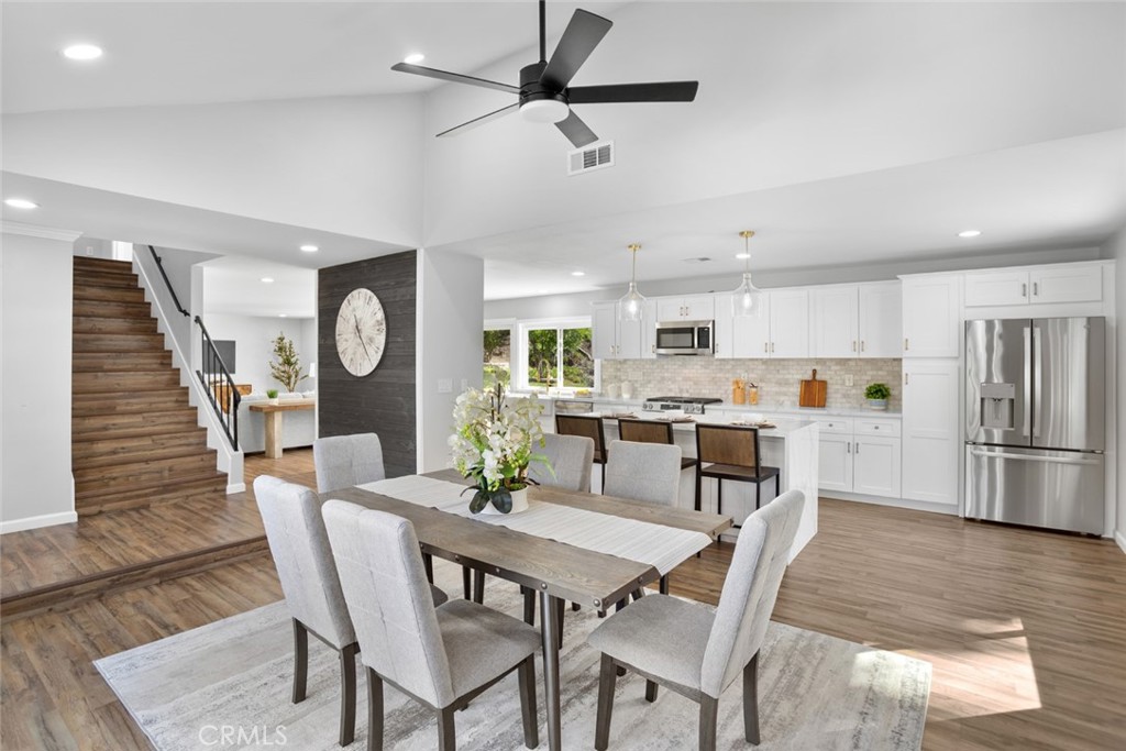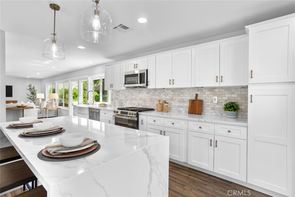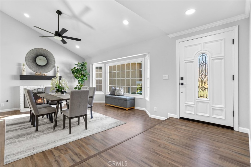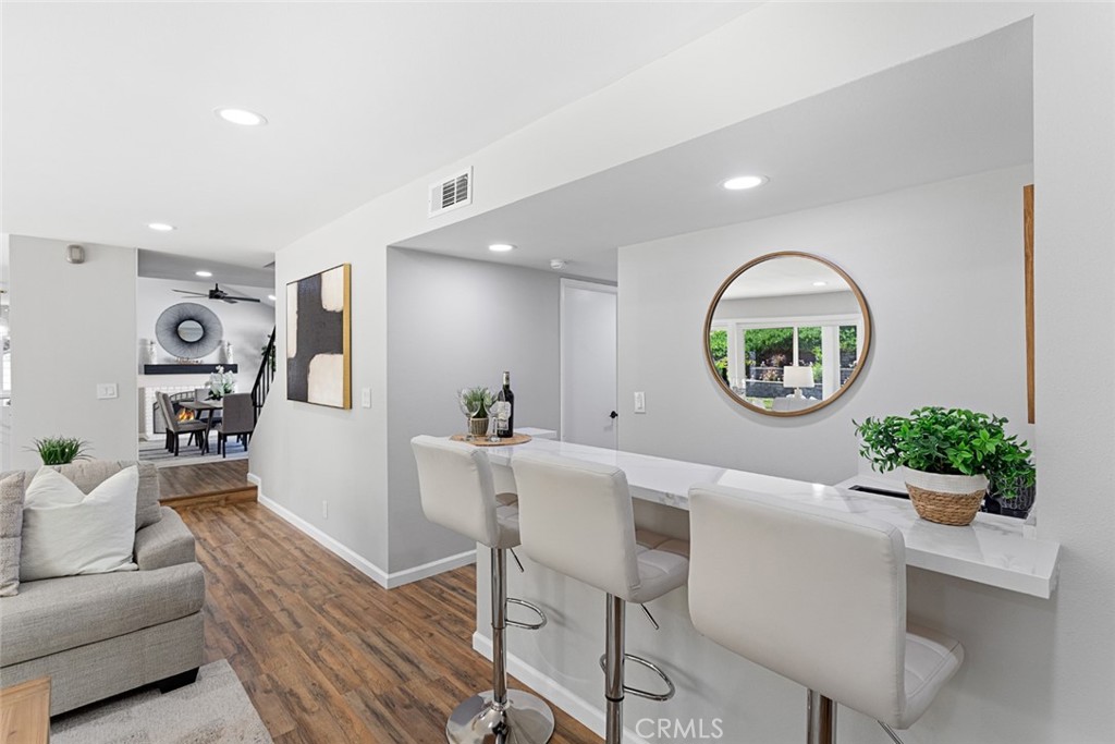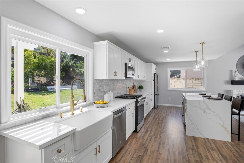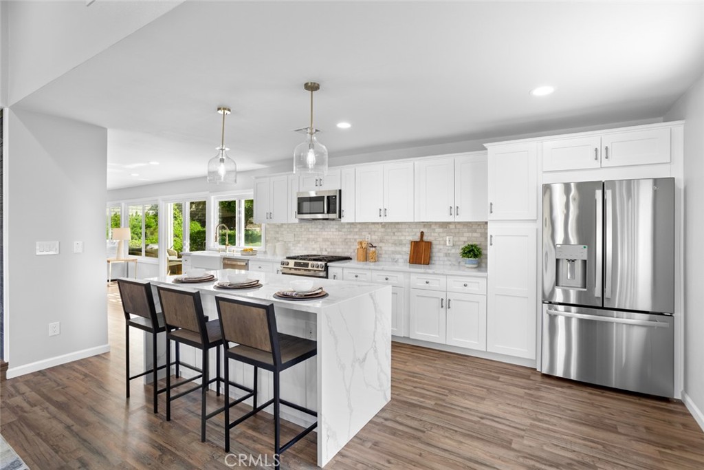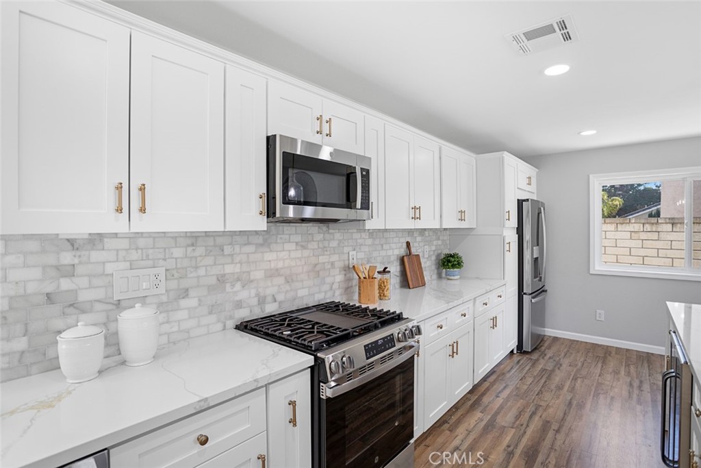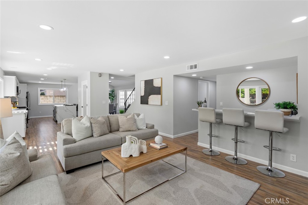 DON’T MISS OUT on this recently updated and spacious TURNKEY home located in a peaceful cul-de-sac in one of La Habra's most coveted neighborhoods! To start off, this stunning home boasts 4 bedrooms and 3 bathrooms including a large primary suite with its own luxurious bathroom and walk-in closet! The thoughtfully designed open and functional floor plan provides light-filled interiors and includes tasteful modern upgrades throughout - ideal for both everyday comfort and elevated entertaining! Step inside to discover a striking open-concept kitchen containing high-end quartz countertops, a center island with a waterfall finish, a farmhouse sink overlooking the backyard and white shaker cabinets with self-closing drawers! Along with the remodeled kitchen there will be a full high-end stainless steel appliance package and wine fridge included! The grand dining area contains a vaulted ceiling, an elegant fireplace/mantle and flows seamlessly into the kitchen area while the spacious living area comes with a wet bar containing high-end quartz countertops, a sink and white shaker cabinets making both spaces inviting and entertaining for families of all sizes. For the exterior, the front yard contains an attractive curb appeal and walkway that leads to the inviting front entry while the backyard contains a spacious covered patio area and generous lawn space with freshly laid sod all setting the stage for unforgettable future family gatherings and year-round enjoyment!! In addition, this home offers new LED recess lighting, premium water-proof laminate flooring, expansive dual-pane vinyl windows throughout and central air/heating! To top it all off, this home is conveniently located within walking distance of multiple shopping centers, such as the Imperial Promenade and the La Habra Market Place, and within minutes of the Westridge Golf Club, Brea Mall and Downtown Brea which both contain beloved restaurants, shops, entertainment and more! Move-in ready, meticulously updated and rarely available, this La Habra gem is a true standout.