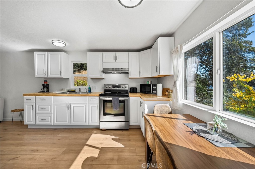 Charming Remodeled Home with Peek-a-Boo Lake Views ~ Discover this fully remodeled 2-bedroom, 1-bathroom gem, perfect as a starter home or Airbnb, Located just 1.6 miles from the Clear Lake Oaks public boat launch, this home offers convenience and comfort. Enjoy the kitchen's butcher block counters and laminate flooring, along with indoor laundry hookups. The bathroom features stylish tile flooring and a tile tub surround. With a huge storage shed and ample parking, this property is set back from the highway to minimize noise and maximize your views. Also has a 433 foundation certificate and qualifies for FHA financing. Don't miss this opportunity for serene living near Clear Lake