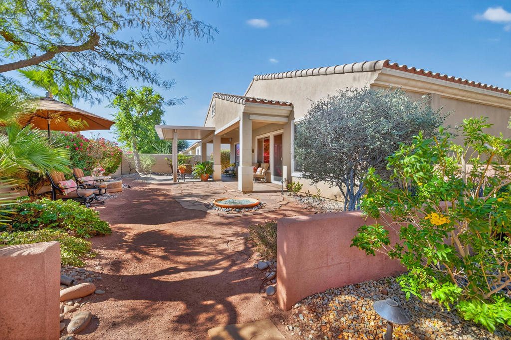 Highly motivated and a great price for this beautiful home with an exceptional grounds. Experience the perfect blend of gracious resort-style living, privacy and lovely outdoor areas in a home designed for comfort and ease. Discover refined comfort and privacy in this beautifully appointed 2-bedroom plus office/den pride-of-ownership home. The open Great Room floor plan creates an easy flow between living, dining, and entertaining spaces, filled with natural light and tasteful design details. The primary suite is a peaceful retreat with a spacious walk-in closet featuring custom built-ins and access to the serene backyard with the large covered patio.. The expansive outdoor area is beautifully landscaped, with multiple private seating areas & meandering flagstone pathways ideal for entertaining or quiet relaxation. You'll also find a dramatic fire-n-ice firepit and a soothing water feature . Additional highlights include newer AC, newer stainless steel kitchen, newer 50 gal hot water heater, chandeliers, beautiful beveled glass door, a garage with epoxy floors, quality finishes and tasteful decor. A cement pathway from the front to the backyard was added for ease of access. This home is ready for your enjoyment. Residents of this gated, over 55 community enjoy country club amenities, including golf, tennis, pickleball, bocce ball fitness centers, swimming pools, and over 50 social clubs--all within a secure and beautifully maintained setting.