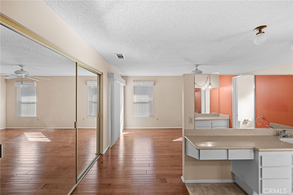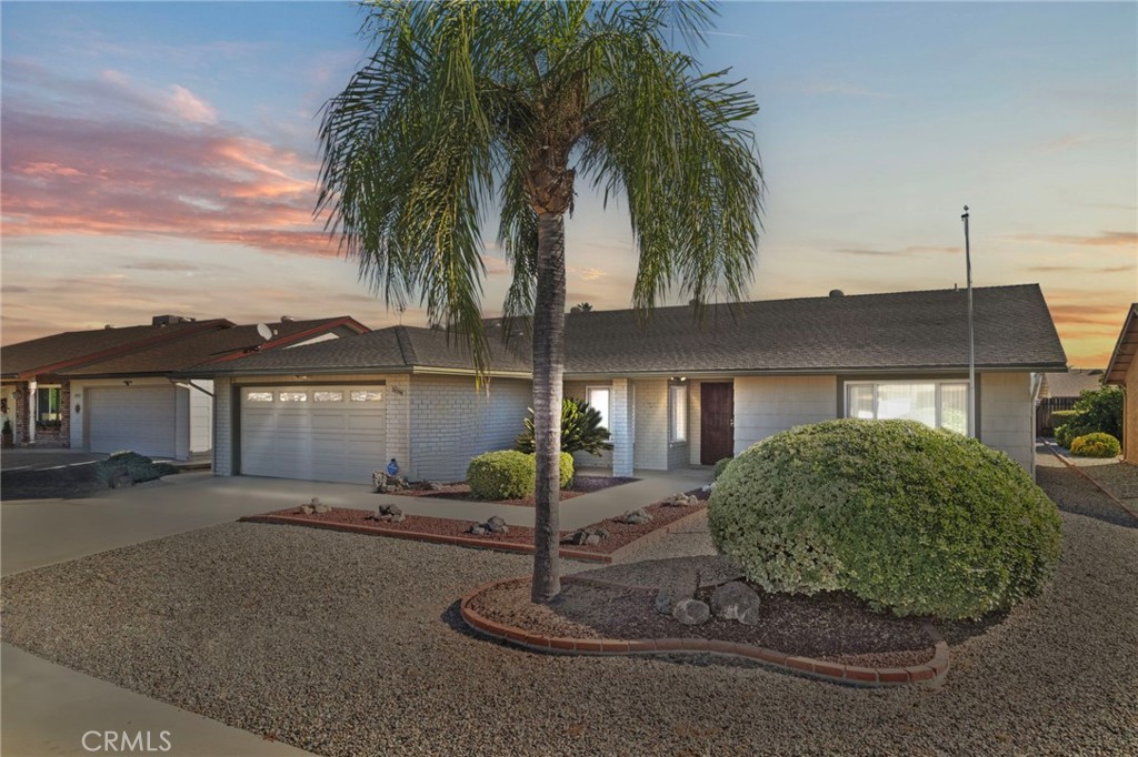 Welcome to this turnkey single level home nestled in a desirable 55+community, offering stunning mountain views and resort-style living. This home features two spacious bedrooms, neutral interior paint colors and real wood plank and tile flooring in every room. NO CARPET, creating a warm, inviting atmosphere. There is a wood burning fireplace in the family room for those cool winter evenings. Every window and sliding glass door has been replaced. The Kitchen and bathrooms have been remodeled and boast of custom cabinetry with Corian countertops, the dishwasher is a upgraded Bosch brand and the refrigerator stays with the home, all perfect for move-in ready convenience. You'll also find ceiling fans in most rooms and beautifully maintained, park-like front and rear yards, ideal for relaxing or entertaining. The garage is fit for two cars and one side is extra deep for storage, truck, golf cart, or work space. The community offers an abundance of amenities, including two large adult only, heated pools, a jacuzzi, exercise room, Billard room, lawn bowling and much, much more. Conveniently located close to shopping, hospitals, post office and easy freeway access via the 215 freeway. This home provides comfort, convivence and an active adult lifestyle. Come and enjoy the slower pace of life that is Sun City, Menifee.
