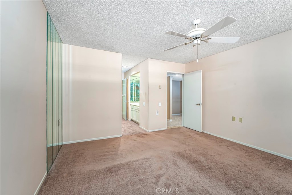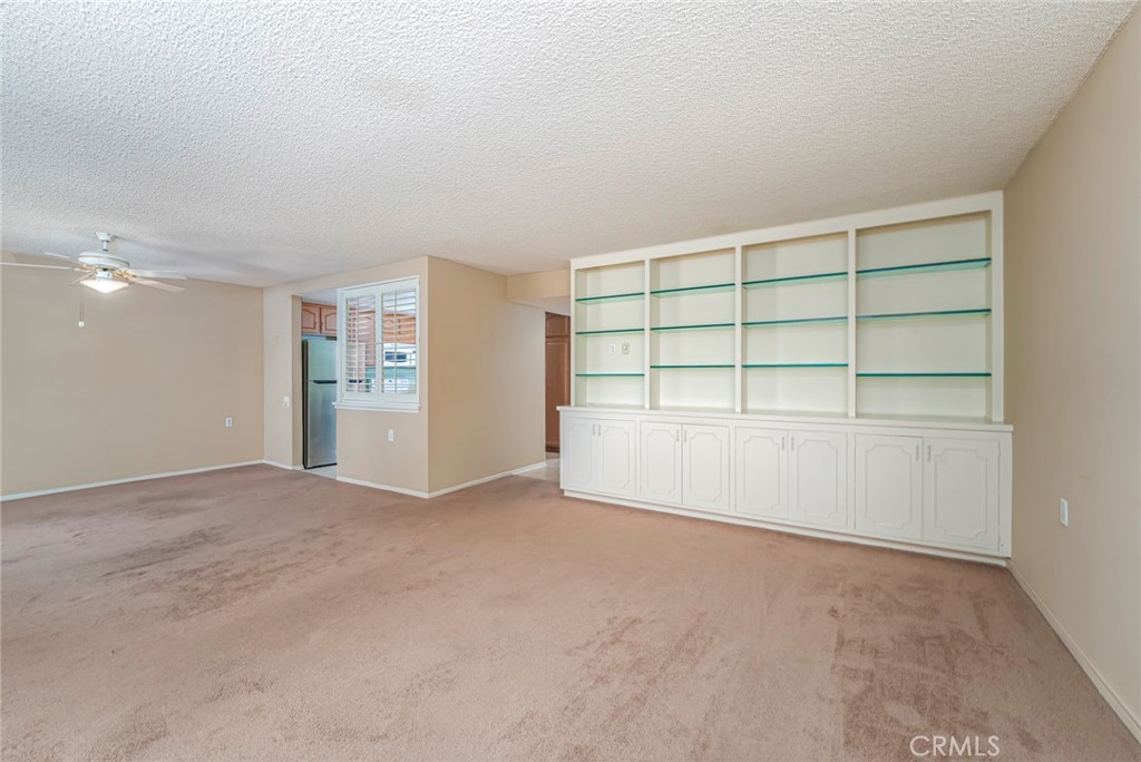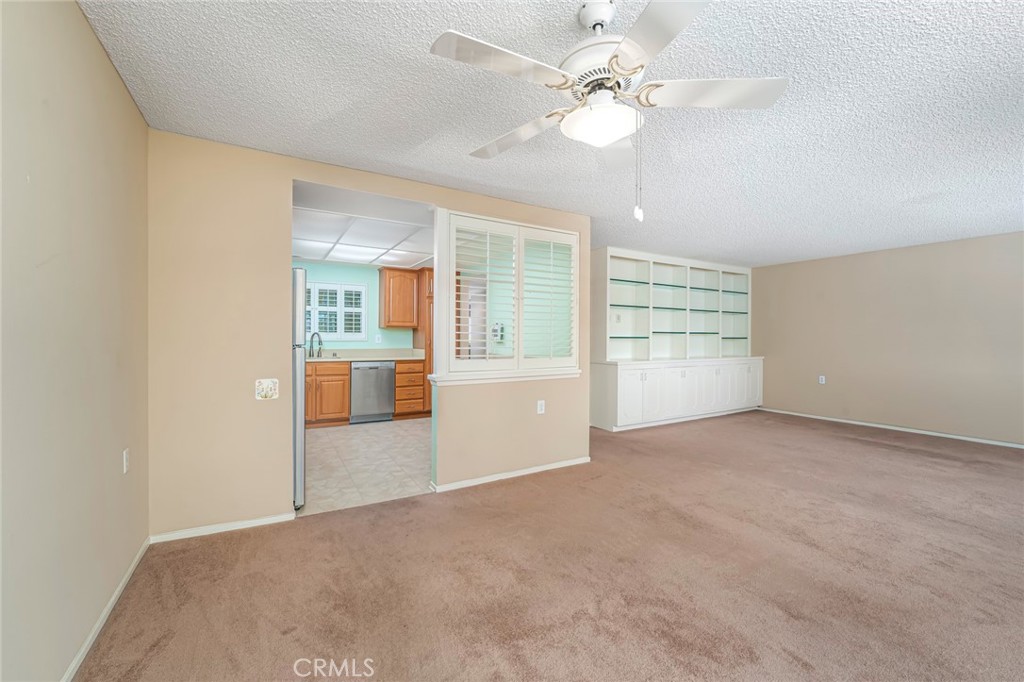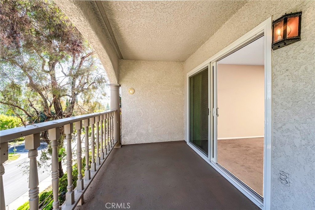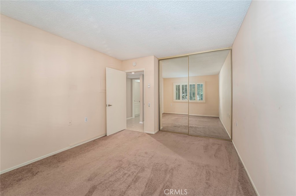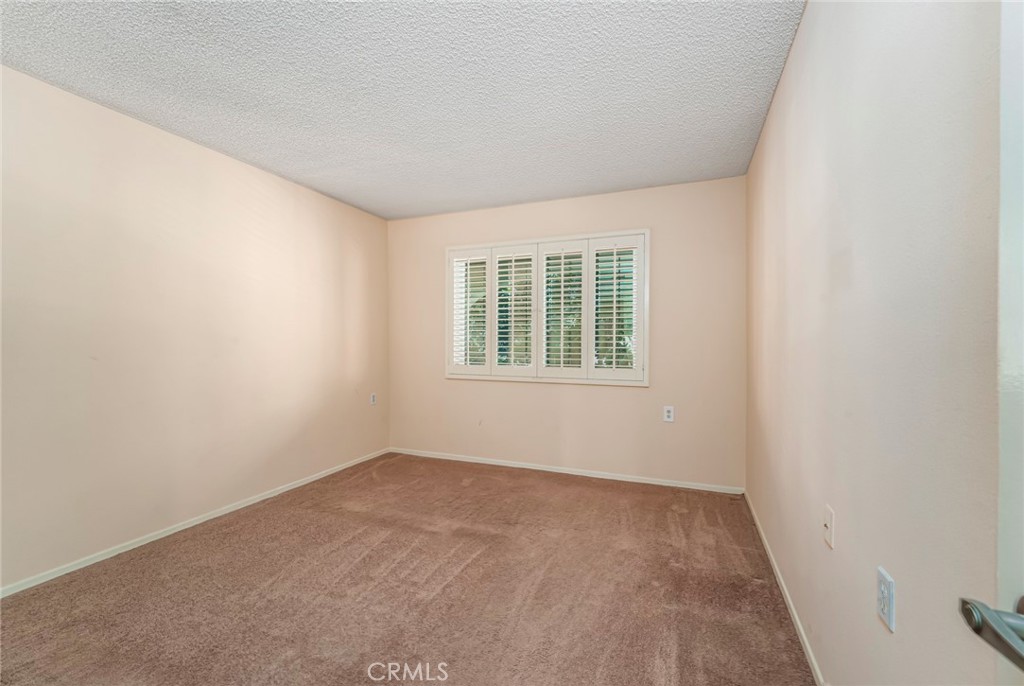 Welcome to this bright and inviting Villa Nueva model nestled in the desirable 55+ community of Laguna Woods Village. This spacious top-floor condominium offers serene treetop views and a comfortable floor plan designed for relaxed Southern California living. Entering the home, you’re greeted by durable tile-style flooring that flows into the kitchen and hallway. The kitchen features warm natural wood cabinetry, solid-surface countertops, and a full suite of appliances including a stainless-steel refrigerator, dishwasher, and sink paired with an all-white electric range and built-in microwave. A cozy breakfast bar offers additional seating and storage, while a window with plantation shutters fills the kitchen with natural light. The adjoining dining area features a ceiling fan and soft carpeting that extends into the large living room. Dual pane sliding glass doors open to a covered balcony, where you can enjoy tranquil views of the Aliso Viejo hills and Saddleback Mountain. The balcony’s elevated position provides privacy and quiet above the street, while the dual-pane windows throughout help maintain peace and comfort indoors. The living room is spacious and includes a custom-built entertainment center and shelving along one wall—perfect for displaying books, art, or collectibles. A heat pump ensures year-round comfort. The guest bedroom includes mirrored wardrobe doors, plantation shutters, and soft carpeting. The guest bathroom features a tub-shower combination with sliding glass doors, a large mirror, bright lighting, and ample vanity storage. The primary suite offers a relaxing retreat with plush carpeting, generous built-in storage, and a large bay-style window framed with plantation shutters. An accent mirrored wall adds depth and brightness to the room. The adjoining dressing area features a vanity with extra counter space, mirrored closet doors, and a private step-in shower with glass doors. This well-maintained home combines comfort, convenience, and the classic Laguna Woods lifestyle—complete with resort-style amenities including seven clubhouses, five pools, two golf courses, pickleball and tennis courts, fitness centers, equestrian trails, and over 250 clubs and social activities. Enjoy this peaceful retreat just minutes from the beaches, restaurants, and shops of Laguna Beach.
