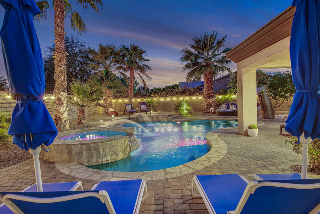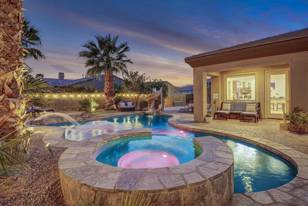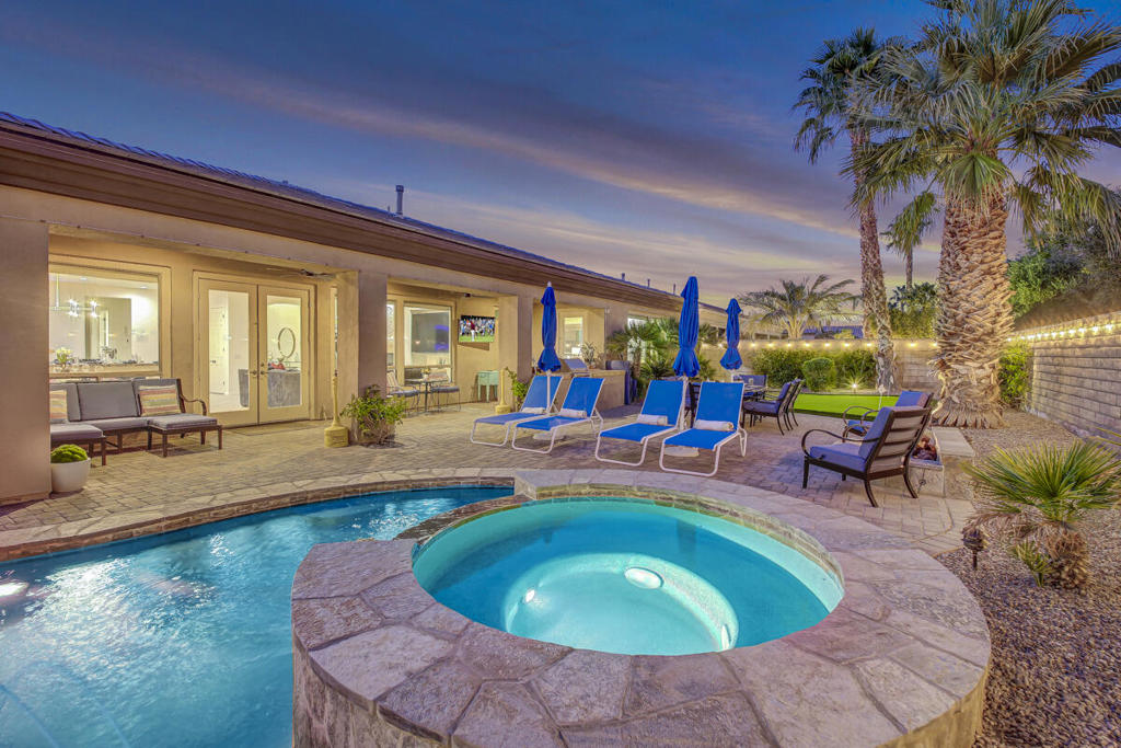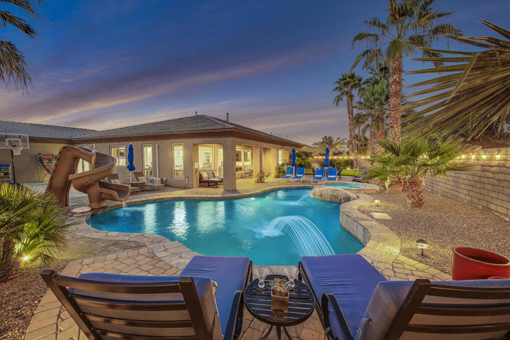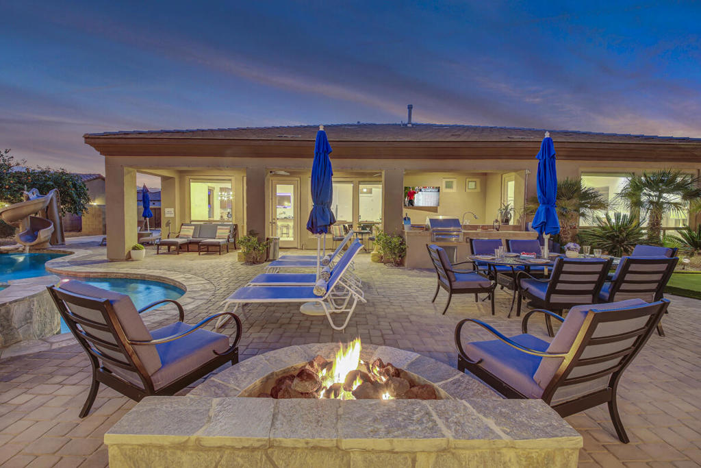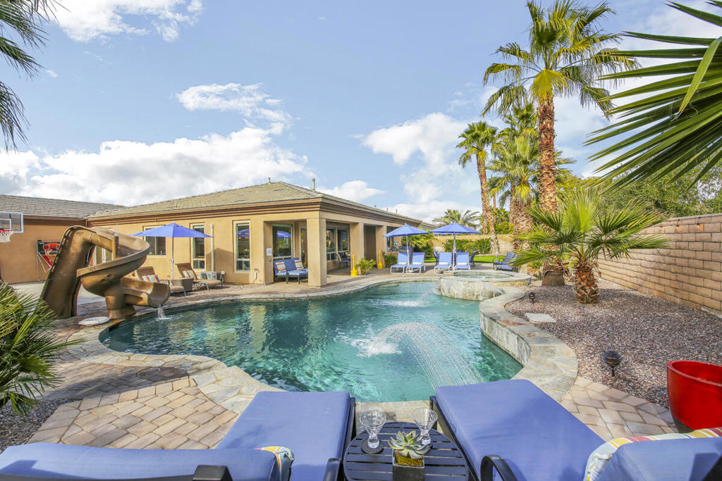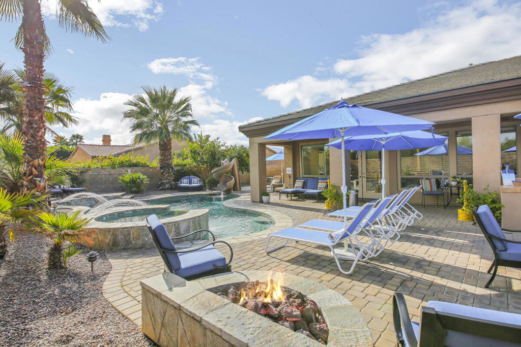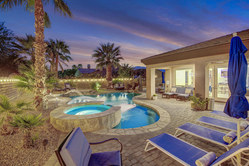 Welcome to Montage at Santa Rosa Coachella Festival Fans Favorite Resort Style place to be! Historical and forward performing luxury short term rental (STR) investment opportunity in this fabulous fully furnished, improved home with ideal location & only 2 neighbors Mountain views and great privacy. Features 5 spacious bedrooms, 3 baths. Multiple indoor & outdoor entertainment w/oversized Pool. Spa w/ waterfall features & monster pool slide, mist system -26' putting green, bocce & basketball game court area, expansive patio deck, BBQ island & cozy firepit. Move the party indoors to the amazing Arcade Game Room w/ Pool Table, Air Hockey full size Arcade games, Golden Tee, Pacman & more! Open concept kitchen w/wet bar, 2 granite islands, dining & living area with Lg screen TV, fireplace & wet bar make indoor guest gatherings a breeze with French doors leading to your private resort, perfect for indoor or outdoor dining with all the luxury amenities to accommodate your entire group of friends & family with ample parking, walking distance to Coachella / Stage Coach, Polo & plenty of Golf, Dining and Shopping! Welcome to your private STR Resort!